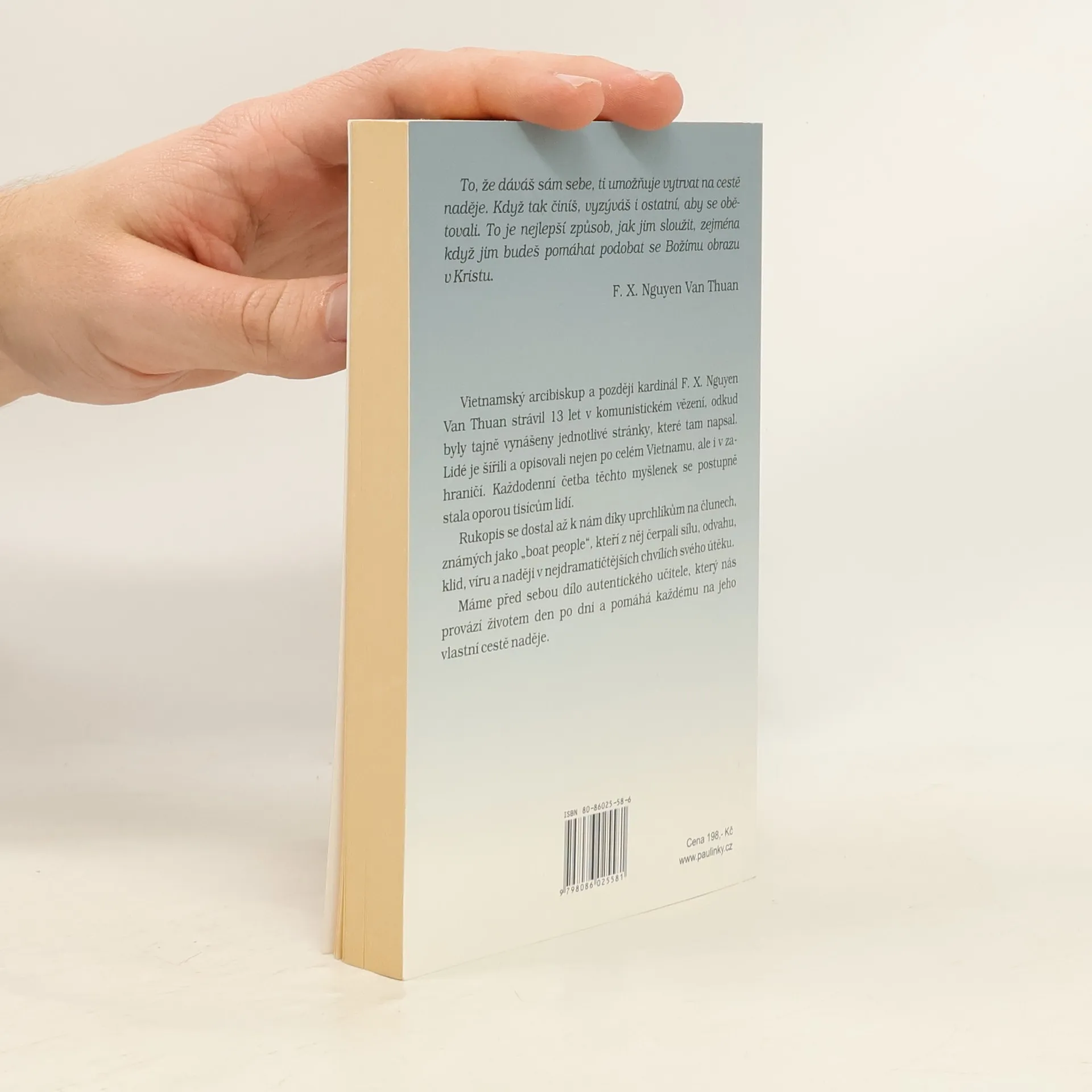 Radostné svědectví sounáležitosti s Kristem. „Zbytečně se netrap, když na cestě nenajdeš nikoho z těch, které svět pokládá za moudré.“ Více než tisíc ryzích myšlenek nejen o naději napsal vězněný vietnamský arcibiskup z místa, kde by se mohlo zdát, že naděje umřela. Právě pro opravdovost myšlenek zaujme ty, kteří touží po lásce, naději a pokojném životě.