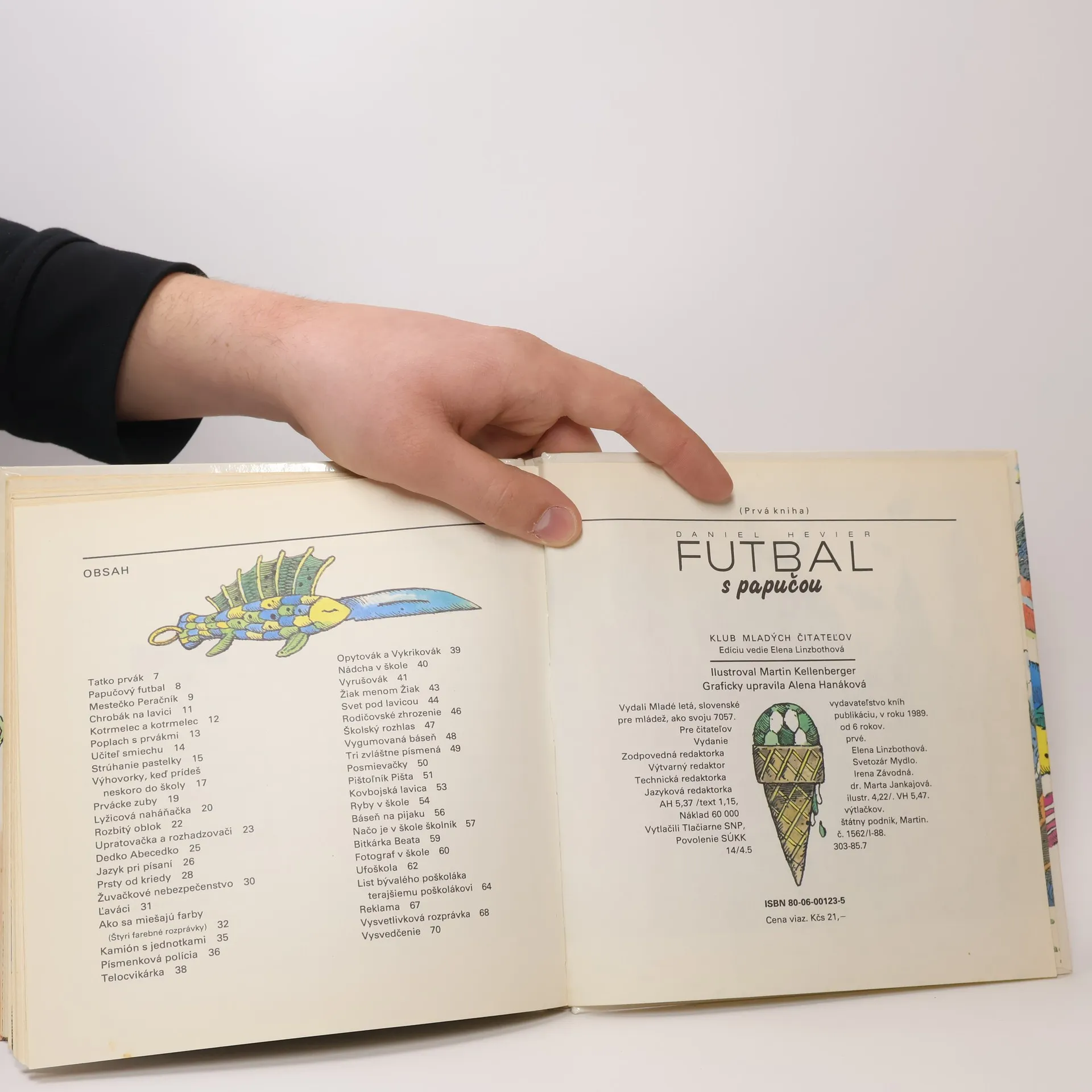 Spisovateľ Daniel Hevier dal do knižky samé krátke rozprávky a veselé básničky. Povedal, že píše prvú pomoc pre prvákov. Vymyslel aj výhovorky, keď prídeš neskoro do školy. Ty ich iste nebudeš potrebovať. Kto príde prvý, môže si od Dedka Abecedka uchmatnúť abecedu, aby chytro vedel čítať. Keby ti po lavici liezol chrobák Drobák a videl v tvojom zošite aj iné chrobáky, zasmej sa – veď to sú písmenká. Ale pozor, nesmú ti uvidieť jazyk, keď ich budeš písať, lebo sa urazia a budú trucovať. V škole ťa čaká všeličo: opytovák aj vykrikovák, učiteľ smiechu, žuvačkové nebezpečenstvo, upratovačka aj rozhadzovači, písmenková polícia (neboj sa!), ale aj kamión s jednotkami.