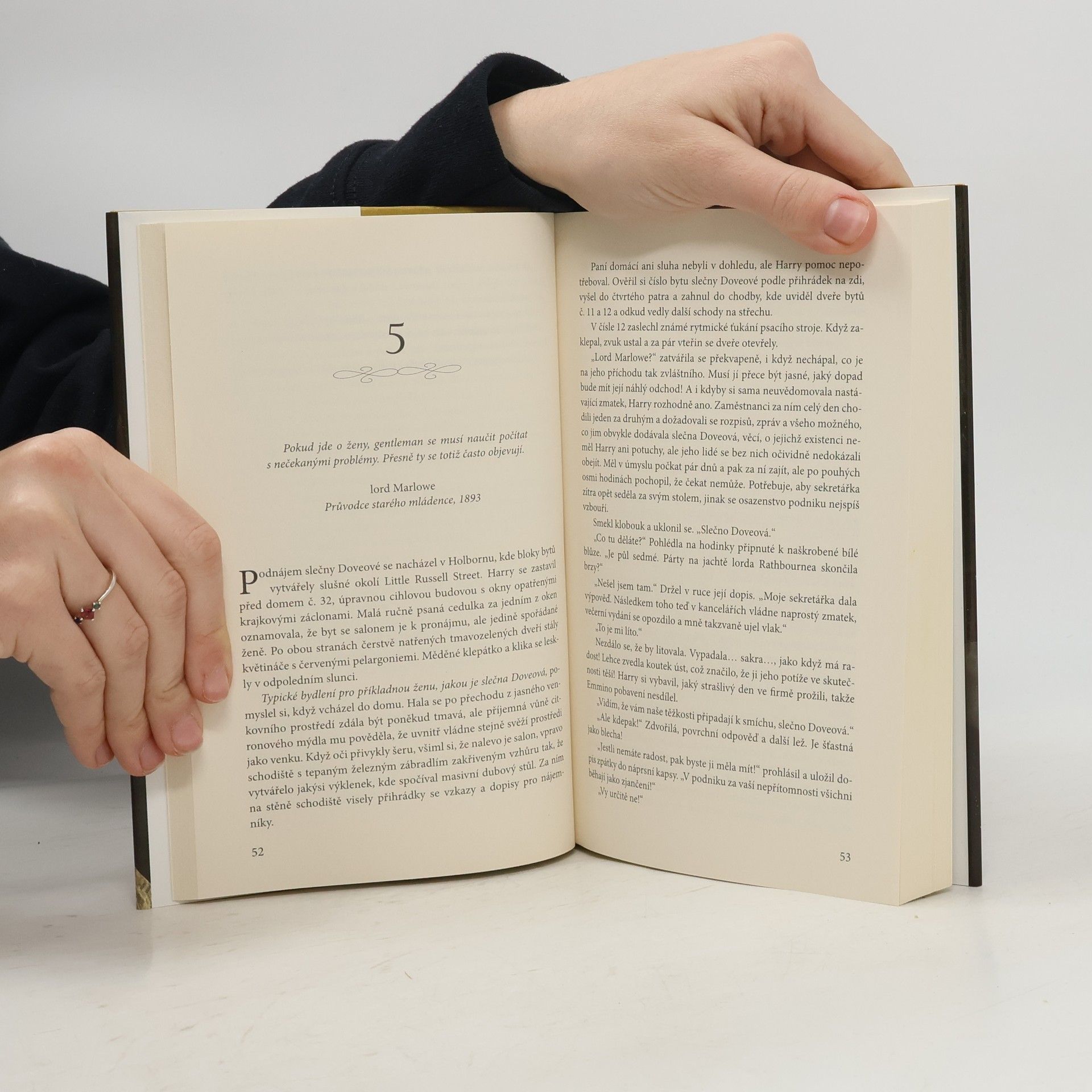 Ve ctnostných dámách někdy dřímá více vášně, než by se znalec žen domníval… Emmalina Doveová je mladá půvabná dáma, která se může pyšnit všemi ctnostmi. Tajně si hýčká velký sen: vydat vlastní knihu o etiketě. Napsala jich už několik a všechny předložila k posouzení vikomtu Marloweovi, který vlastní největší londýnské nakladatelství. Jako jeho oddaná sekretářka chová velké naděje… ovšem jen do chvíle, kdy zjistí, že ten prolhaný darebák odmítal její knihy, aniž z nich přečetl jedinou stránku! Harry jakožto zkušený nakladatel a znalec žen pokládá knihy o etiketě za vrchol nudy. Kromě toho nevěří, že by jeho spořádaná sekretářka dokázala napsat knihu, která by stála za přečtení. Je sice spolehlivá, ale nemá jiskru. I on se ovšem přepočítá - jednoho dne zjistí, že nevýrazná šedivka Emma odešla beze slova vysvětlení z práce a dokonce si dovolila začít psát do novin. Jak si něco takového vůbec mohla dovolit? Na něco takového není miláček žen Harry zvyklý, a tak se rozhodne uštědřit Emmě lekci. Hodlá slečnu Doveovou naučit pár věcí, které jsou etiketě na hony vzdálené. Když ji ale políbí, ke svému úžasu zjistí, že jeho bývalá sekretářka v sobě skrývá více vášně, než by se nadál. A Emma si uvědomí, že si z touhy po spořádanosti nechala spoustu nádherných věcí proklouznout mezi prsty. Nyní je rozhodnuta dohnat, oč přišla - i když při tom bude muset hodit za hlavu všechny své ctnosti, na něž byla tolik pyšná.
