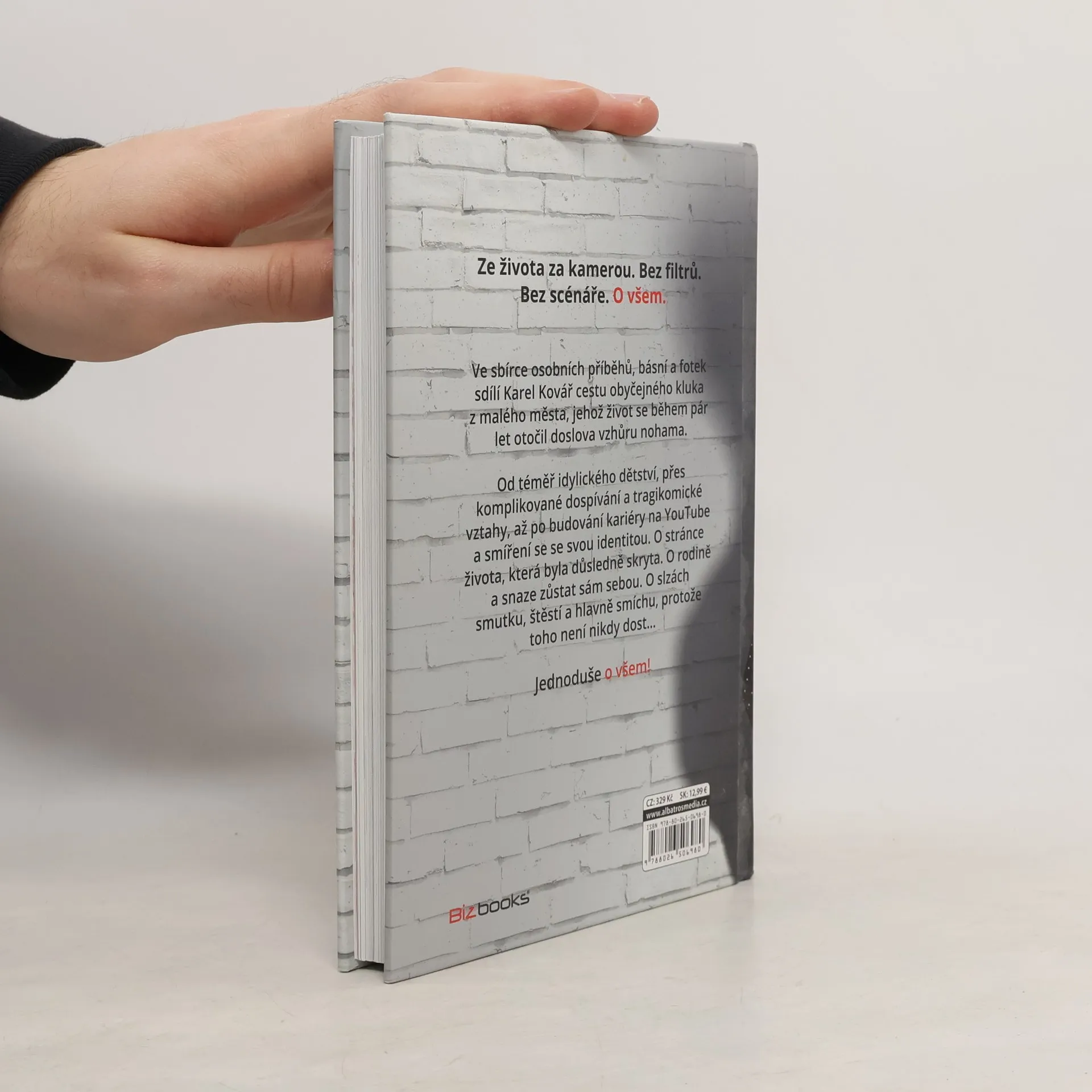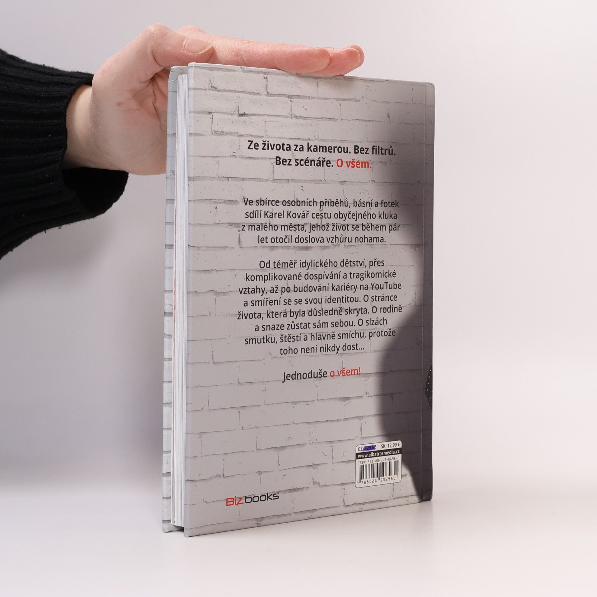 Bez filtrů. Bez scénáře. O všem. Ve sbírce osobních příběhů, básní a fotek sdílí Karel Kovář cestu obyčejného kluka z malého města, jehož život se během pár let otočil doslova vzhůru nohama. Od téměř idylického dětství, přes komplikované dospívání a tragikomické vztahy, až po budování kariéry na YouTube a smíření se se svou identitou. O stránce života, která byla důsledně skryta. O rodině a snaze zůstat sám sebou. O slzách smutku, štěstí a hlavně smíchu, protože toho není nikdy dost–… Jednoduše o všem!