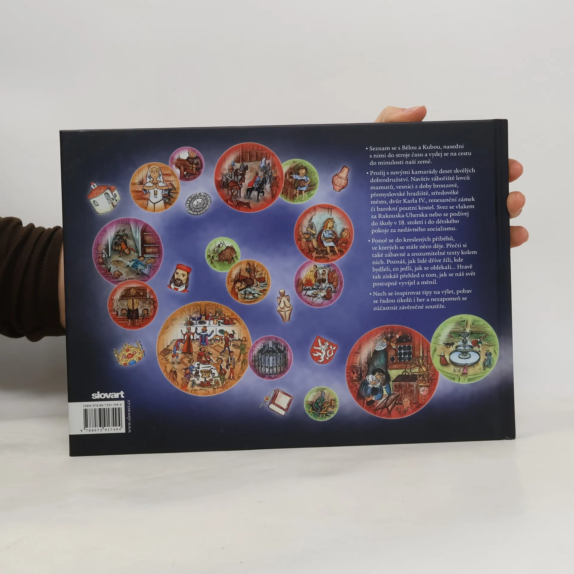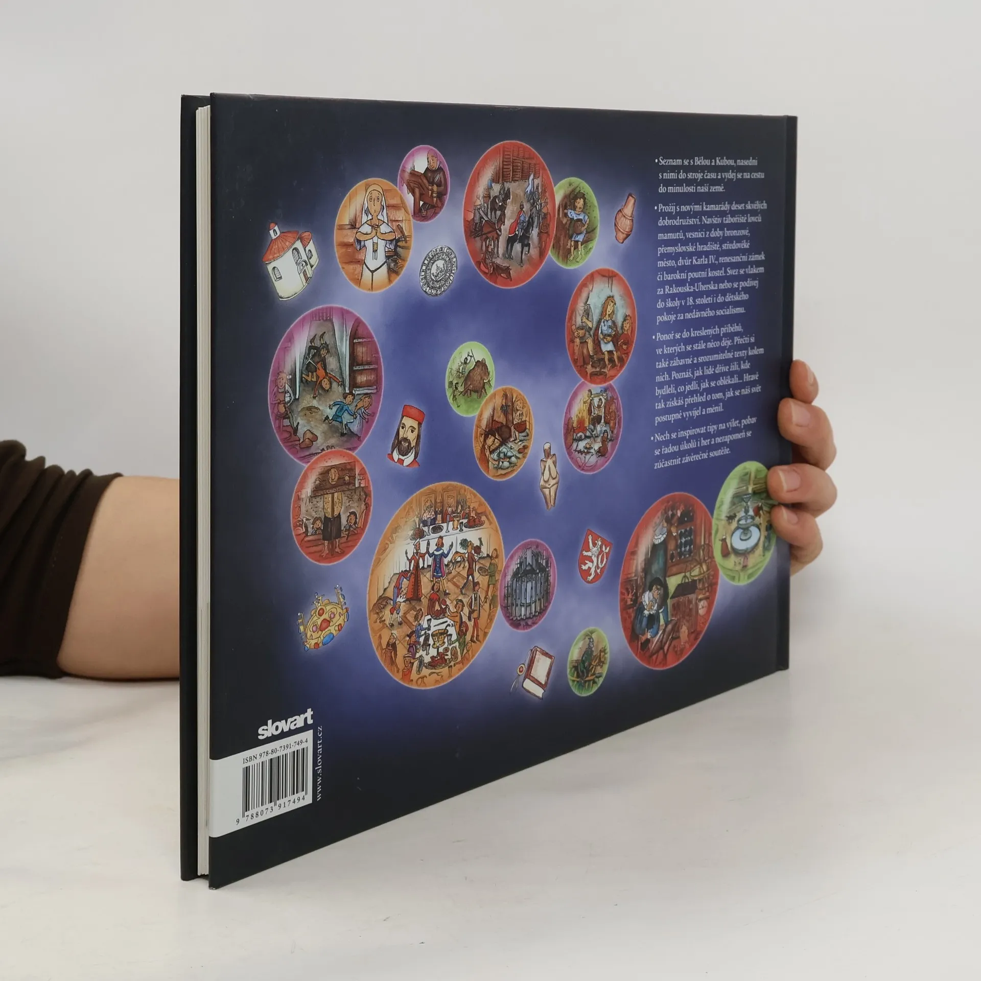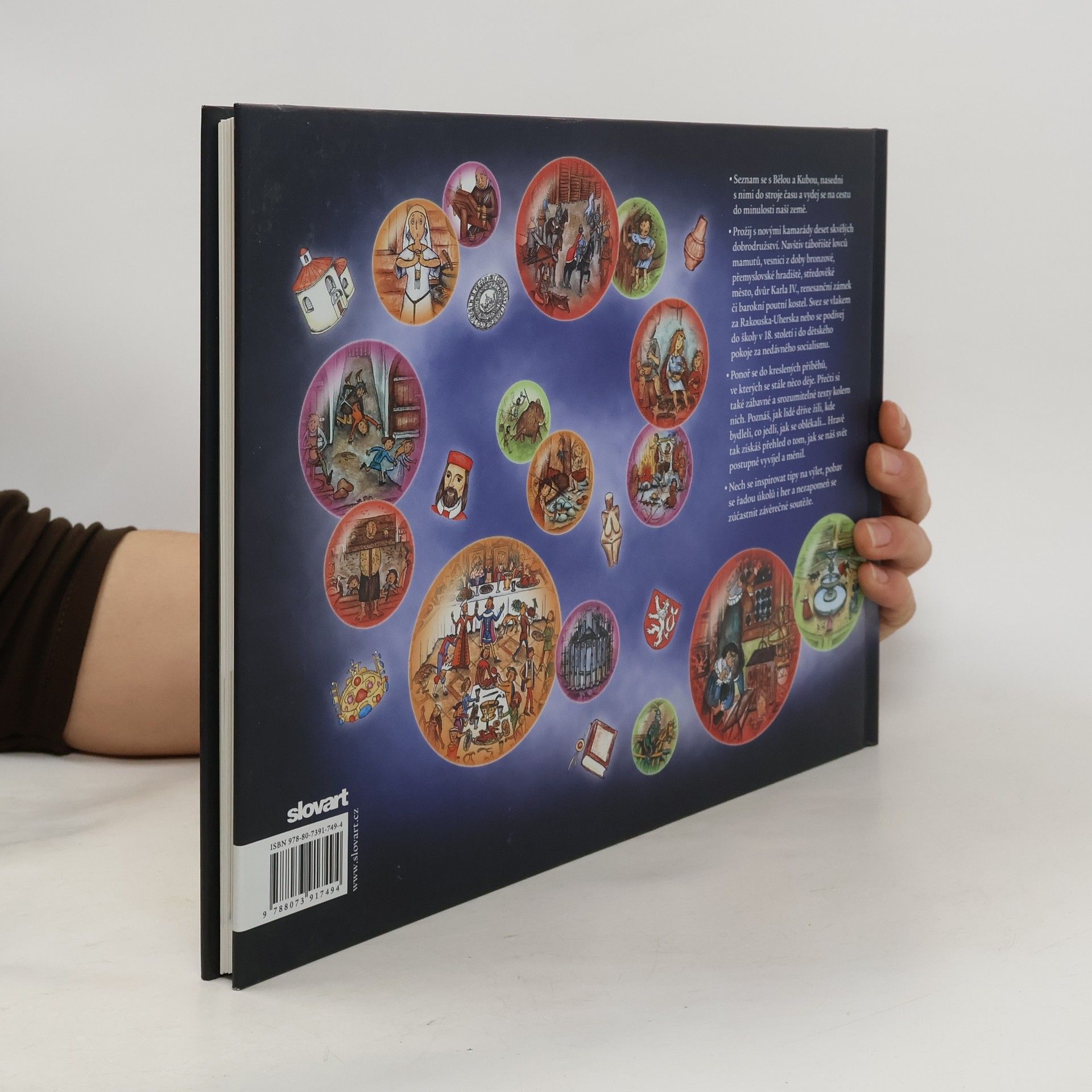 Velké množství dějově plných kreseb a čtivý, zábavný a srozumitelný text jsou hlavní přednosti knihy, která dětské čtenáře poutavým způsobem seznámí s naší historií. Hlavní hrdinové, sourozenci Běla a Kuba, se pomocí starobylého stroje času v muzeu dostanou do deseti historických období a zažijí tam nevšední dobrodružství. Čtenáři sledují jejich osudy například v době kamenné, v přemyslovském hradišti, za vlády Karla IV., na renesančním zámku, za Rakouska-Uherska či za socialismu. Každá z kapitol obsahuje kreslený příběh s dialogy, doplněný krátkými popisky, a vysvětlující texty, tip na výlet i různé hříčky a úkoly. Autorka se nevyhýbá nastínění základního historického rámce epoch, ale víc se soustřeďuje na každodenní život - jak se lidé oblékali, co jedli, jak bydleli apod. Knížka je určena dětem různých věkových kategorií. Předškoláci mohou zkoumat obrázky nebo si nad kresleným příběhem povídat s rodiči o životě v minulosti. Menší školáci si už přečtou kreslený příběh sami. Když trochu povyrostou, zvládnou si knížku prostudovat celou, včetně doprovodných textů nabitých spoustou informací.