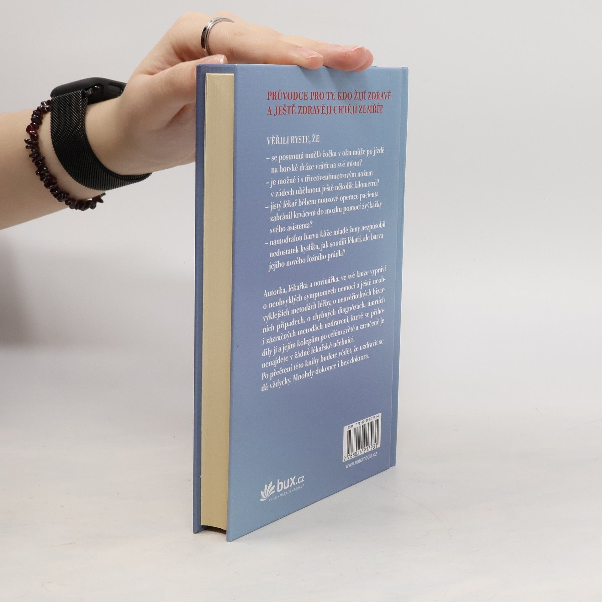 Tato kniha je průvodcem pro všechny, kteří žijí zdravě a ještě zdravěji chtějí zemřít. Vypráví o neobvyklých symptomech nemocí a ještě neobvyklejších metodách léčby, o nehorázných chybných diagnózách, šílených vedlejších účincích a zázračných spontánních uzdraveních. A nezáleží na tom, že právě vy nemáte ani promodralou kůži, nůž v zádech, dvě krevní skupiny nebo prostě něco podobně bizarního, po těchto lekcích budete vědět, že uzdravit se dá vždycky. Mnohdy dokonce i bez doktora.