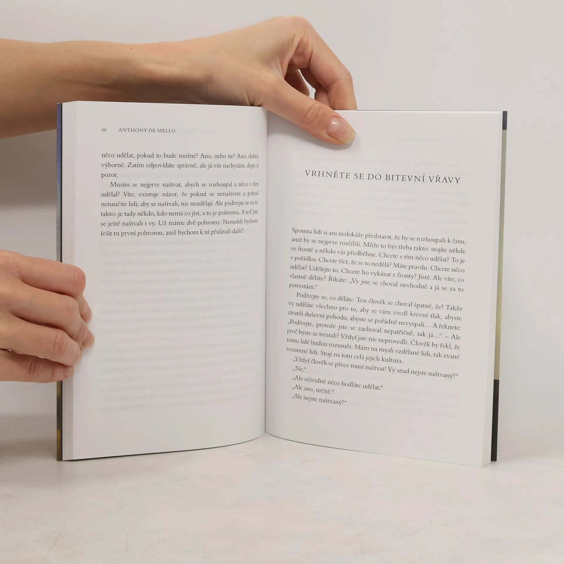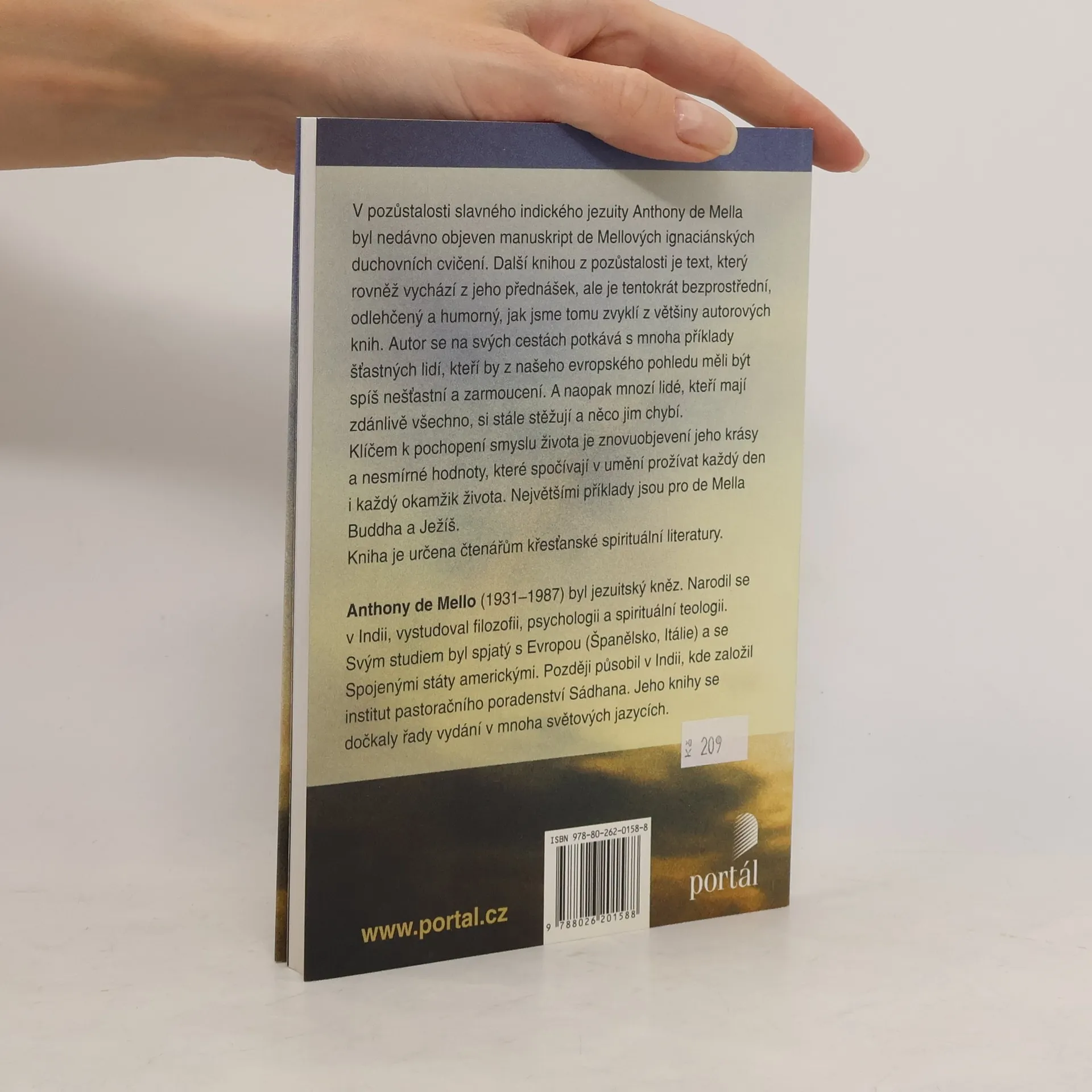 V pozůstalosti slavného indického jezuity Anthony de Mella byla nedávno objevena manuskript de Mellových ignaciánských duchovních cvičení. Dalším knihou z pozůstalosti je text, který rovněž vychází z jeho přednášek, ale je tentokrát bezprostřední, odlehčený a humorný, jak jsme tomu zvyklí z většiny autorových knih. Autor se na svých cestách potkává s mnoha příklady šťastných lidí, kteří by z našeho evropského pohledu měli být spíš nešťastní a zarmoucení. A naopak mnozí lidé, kteří mají zdánlivě všechno, si stále stěžují a něco jim chybí. Klíčem k pochopení smyslu života je znovuobjevení jeho krásy a nesmírné hodnoty, které spočívají v umění prožívat každý den i každý okamžik života naplněni Bohem. Jedním z vrcholných příkladů jsou pro de Mella Buddha a Ježíš. Kniha je určena čtenářům křesťanské spirituální literatury.