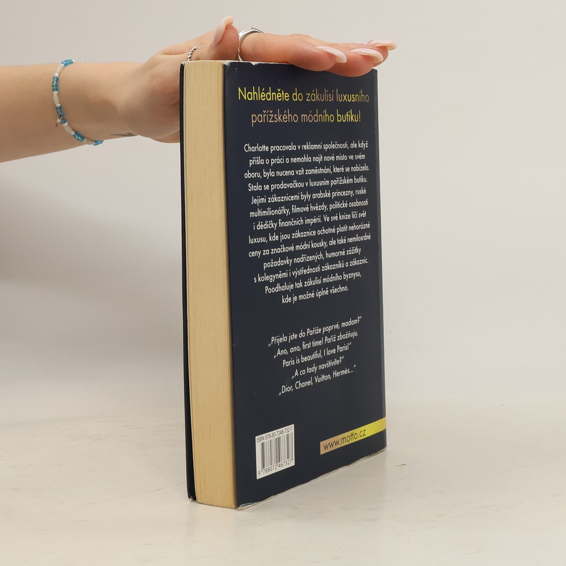 Charlotte pracovala v reklamní společnosti, ale když přišla o práci a nemohla najít nové místo ve svém oboru, byla nucena vzít zaměstnání, které se nabízelo. Stala se prodavačkou v luxusním pařížském butiku. Jejími zákaznicemi byly arabské princezny, ruské multimilionářky, filmové hvězdy, politické osobnosti i dědičky finančních impérií. Ve své knize líčí svět luxusu a poodhaluje zákulisí módního byznysu, kde je možné úplně všechno.