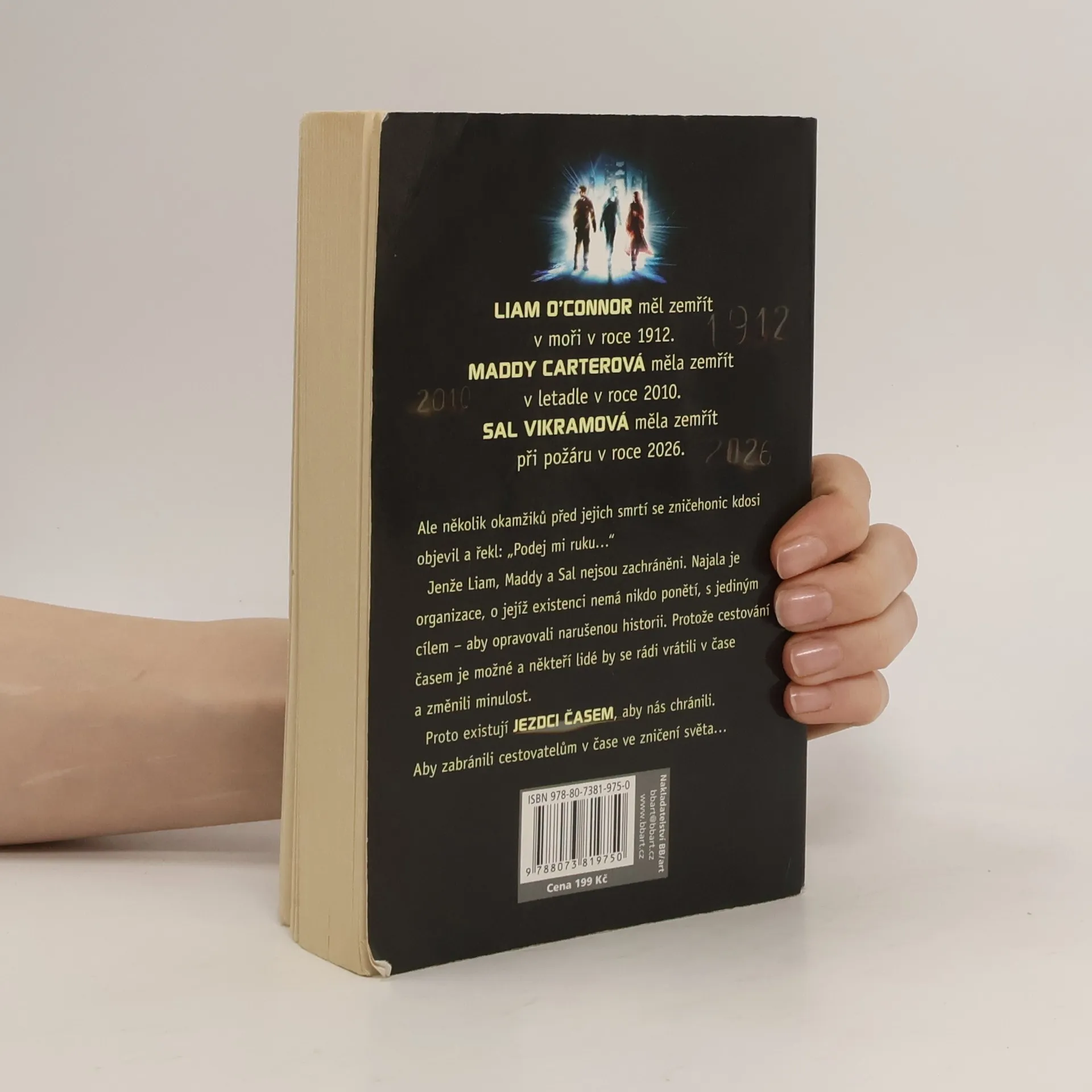 Zahrávejte si s časem a známý svět… by se mohl změnit ve svět, jak ho neznáte. Liam O´Connor měl zemřít v moři v roce 1912. Maddy Carterová měla zemřít v letadle v roce 2010. Sal Vikramová měla zemřít při požáru v roce 2026. Ale několik okamžiků před jejich smrtí se zničehonic kdosi objevil a řekl: „Podej mi ruku…“ Jenže Liam, Maddy a Sal nejsou zachráněni. Najala je organizace, o jejíž existenci nemá nikdo ponětí, s jediným cílem – aby opravovali narušenou historii. Protože cestování časem je možné a někteří lidé by se rádi vrátili v čase a měnili minulost. Proto existují JEZDCI ČASEM, aby nás chránili. Aby zabránili cestovatelům v čase ve zničení světa…