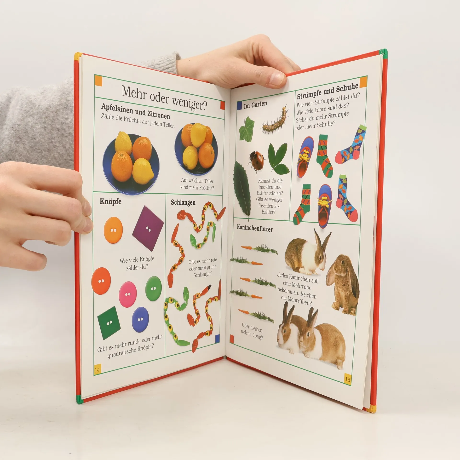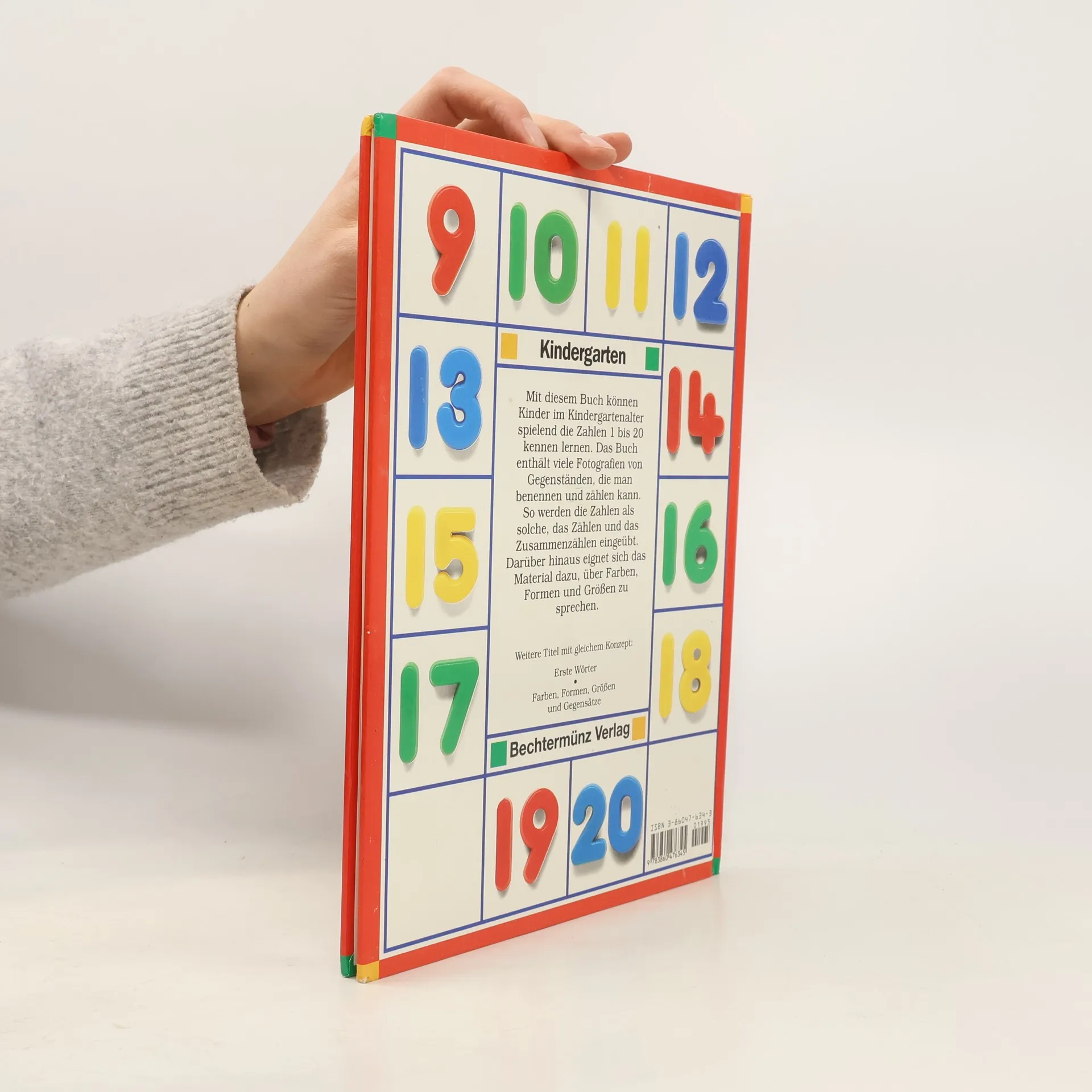 In 8 Kapiteln (mit je einer grosszügig gestalteten Doppelseite) wird in diesem Band ins Land der Zahlen und in die Fertigkeit des (Zusammen-)Zählens (ein-)geführt. Dabei wird auch das Vergleichen ("Genauso viele?"), Zahlidentifizieren" (Zeige die Zahlen!") und das Addieren geübt. Die Aufmachung ist äusserst aufwendig: farbige Foto-Darstellungen einzelner realer Gegenstände und Tiere (Kinder nur ein einziges Mal) sowie von plastischen Ziffern; "schmucke" Seitengliederung, kräftiges Mattglanzpapier. Doch dies alles darf über Ungereimtheiten/Sorglosigkeiten des didaktischen Konzepts nicht hinwegtäuschen: unstimmige Grössenverhältnisse der Figuren, unpassende Gegenstandwahl (2 Raketen!), unkenntliche Darstellungen (13 Brillen), unzutreffende Begrifflichkeiten ("Buntstifte" sind eigentlich grüne Farbstifte; "Geschenke" sind im Grunde Päckchen usw.). Vorsicht bei der Anschaffung ist geboten