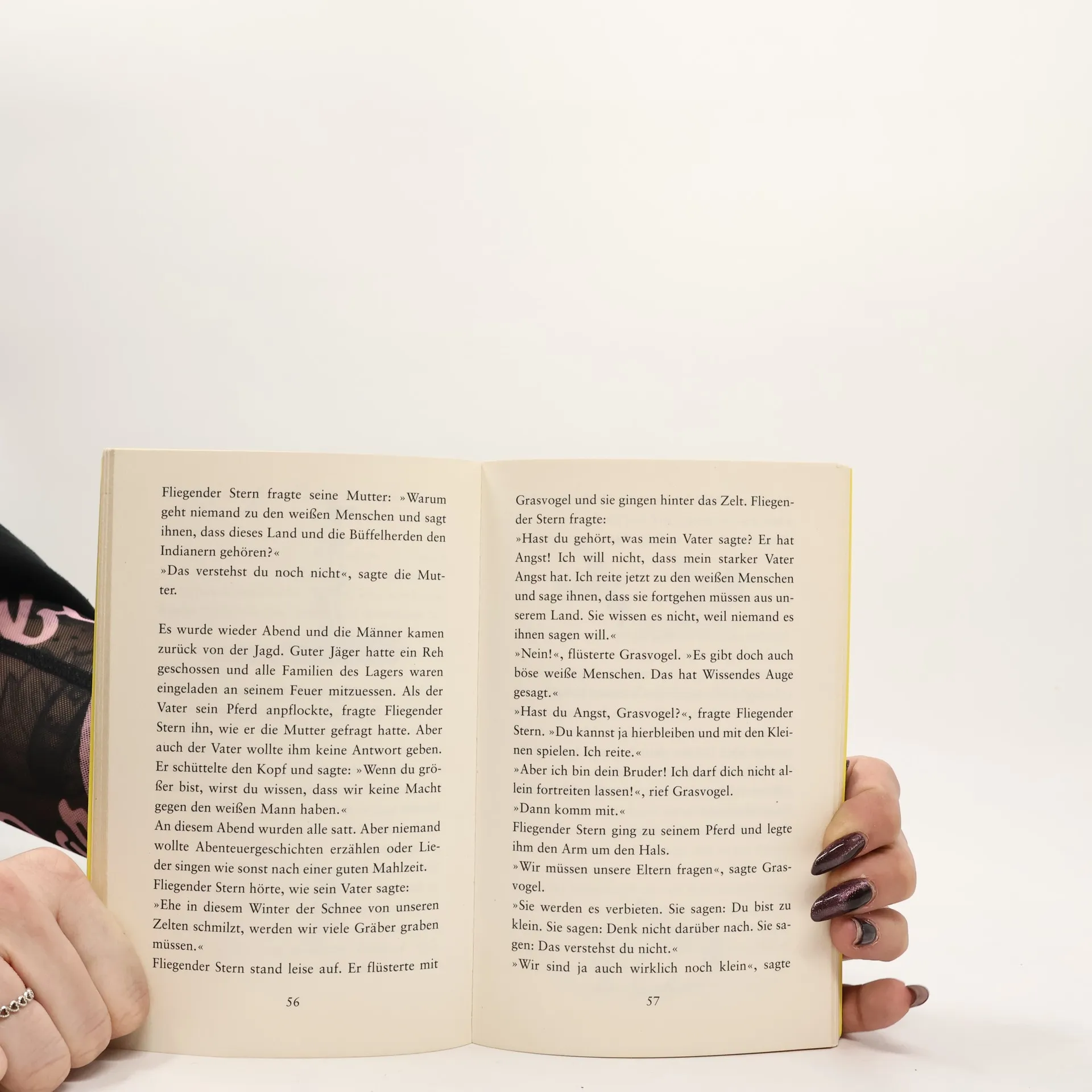 Eines Tages machen sich die beiden Indianerjungen Fliegender Stern und Grasvogel mutig und ohne Wissen der Erwachsenen auf den Weg zu den Weißen, um zu erfahren, warum diese in ihr Land gekommen sind, die Eisenbahn gebaut und die großen Büffelherden vertrieben haben, so dass die Indianer um ihre Existenz fürchten müssen. Auch wenn sich diese Entwicklung nicht zurückdrehen lässt, machen die beiden Jungen die Erfahrung, dass es durchaus Weiße gibt, mit denen man reden kann und die die Indianer respektieren. Als Fliegender Stern und Grasvogel dann von ihrem Abenteuer zurückkehren, werden sie von ihrem Stamm für diese mutige, wenn auch eigenwillige Aktion voller Hochachtung empfangen.