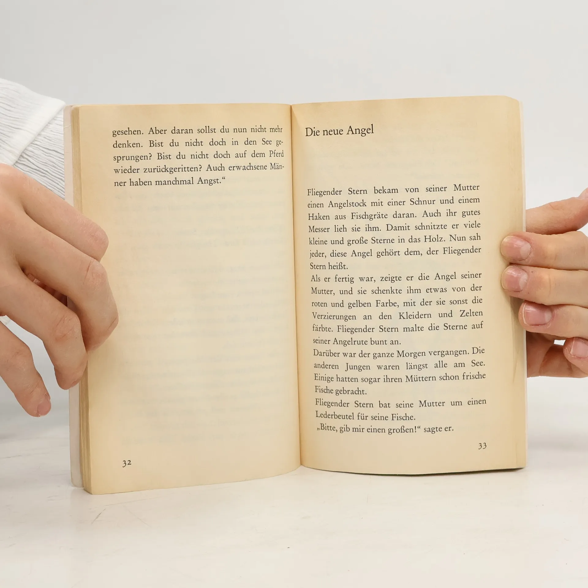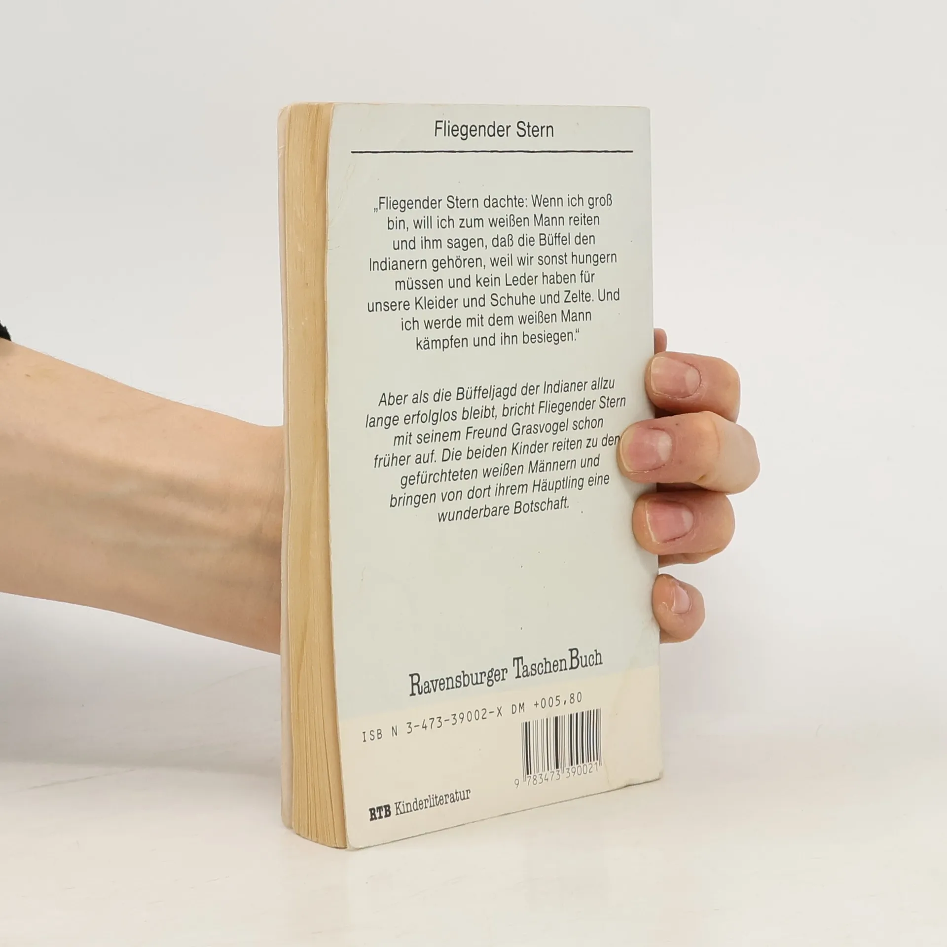 "Fliegender Stern dachte: Wenn ich groß bin, will ich zum weißen Mann reiten und ihm sagen, dass die Büffel den Indianern gehören, weil wir sonst hungern müssen und kein Leder haben für unsere Löeoder und Schuhe und Zelte. Und ich werde mit dem weißen Mann kämpfen und ihn besiegen." Aber als die Büffeljagd der Indianer allzu lange erfolglos bleibt, bricht Fliegender Stern mit seinem Freund Grasvogel schon früher auf. Die beiden Kinder reiten zu den gefürchteten weißen Männern und bringen von dort ihren Häuptling eine wunderbare Botschaft.