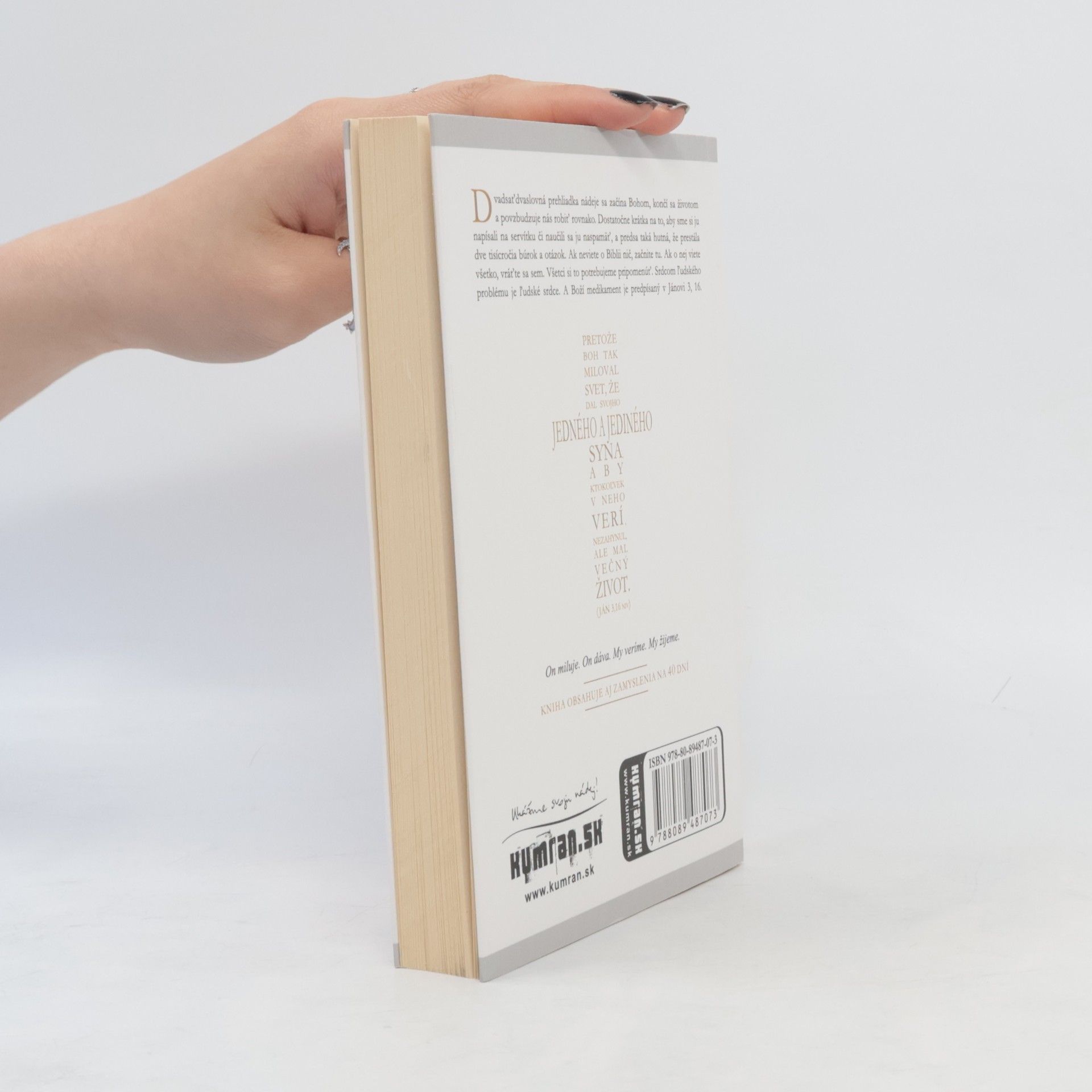 Neboť Bůh tak miloval svět, že dal svého jediného Syna, aby žádný, kdo v něho věří, nezahynul, ale měl život věčný. Jan, 3.16 Dvadsaťdvaslovná prehliadka nádeje sa začína Bohom, končí sa životom a povzbudzuje nás robiť rovnako. Dostatočne krátka na to, aby sme si ju napísali na servítku či naučili sa ju naspamäť, a predsa taká hutná, že prestála dve tisícročia búrok a otázok. Ak neviete o Biblii nič, začnite tu. Ak o nej viete všetko, vráťte sa sem. Všetci to potrebujeme pripomenúť. Srdcom ľudského problému je ľudské srdce. A Boží medikament je predpísaný v Jánovi 3, 16.