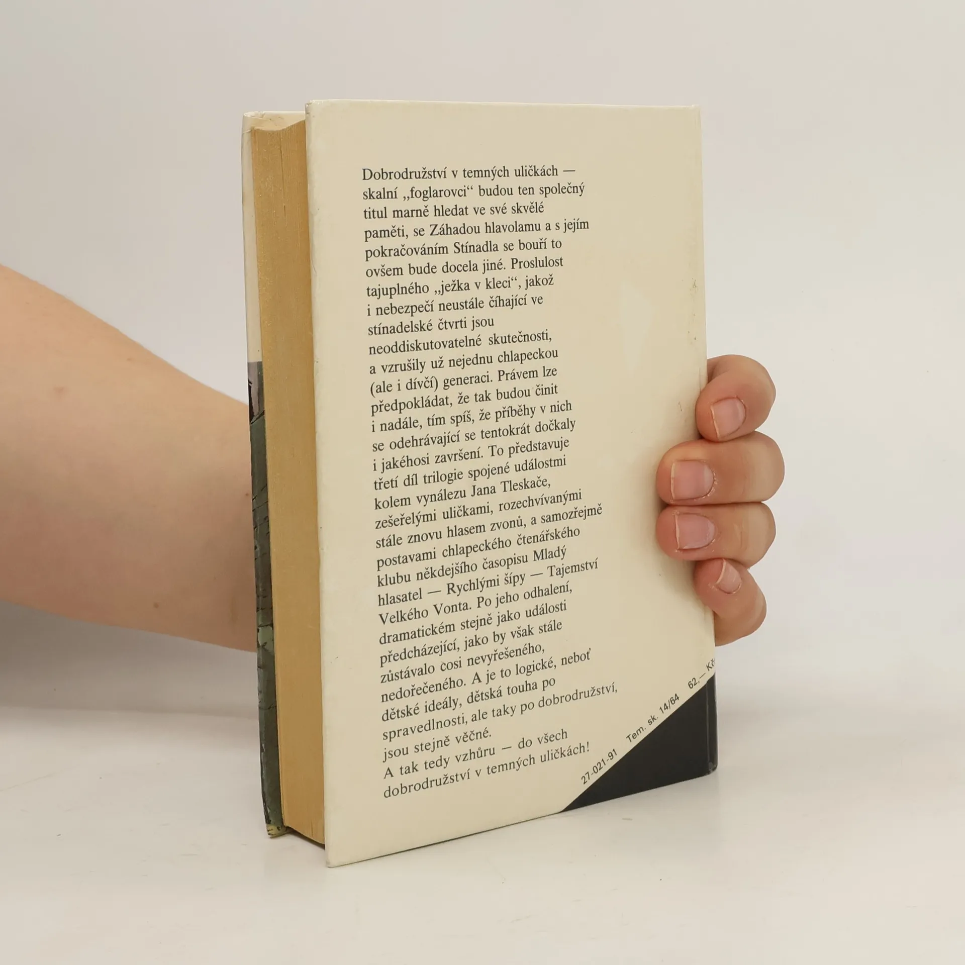 Dobrodružství v temných uličkách - skalní "foglarovci" budou ten společný titul marně hledat ve své skvělé paměti, se Záhadou hlavolamu a s jejím pokračováním Stínadla se bouří to ovšem bude docela jiné. Proslulost tajuplného "ježka v kleci", jakož i nebezpečí neustále číhající vestínadelské čtvrti jsou neoddiskutovatelné skutečnosti, a vzrušily už nejednu chlapeckou (ale i dívčí) generaci. Právem lze předpokládat, že tak budou činit i nadále, tím spíš, že příběhy v nich se odehrávající se tentokrát dočkaly i jakéhosi završení.To představuje třetí díl trilogie spojené událostmi kolem vynálezu Jana Tleskače, zešeřelými uličkami, rozechvívanými stále znovu hlasem zvonů, a samozřejmě postavami chlapeckého čtenářského klubu někdejšího časopisu Mladý hlasatel - Rychlými šípy - Tajemství Velkého Vonta. Po jeho odhalení, dramatickém stejně jako události předcházející, jako by však stále zůstávalo cosi nevyřešeného, nedořečeného. A je to logické, neboť dětské ideály, dětská touha po spravedlnosti, ale tady po dobrodružství, jsou stejně věčné. A tak tedy vzhůru - do vše dobrodružství v temných uličkách! 1/ Záhada hlavolamu 2/ Stínadla se bouří 3/ Tajemství Velké Vonta