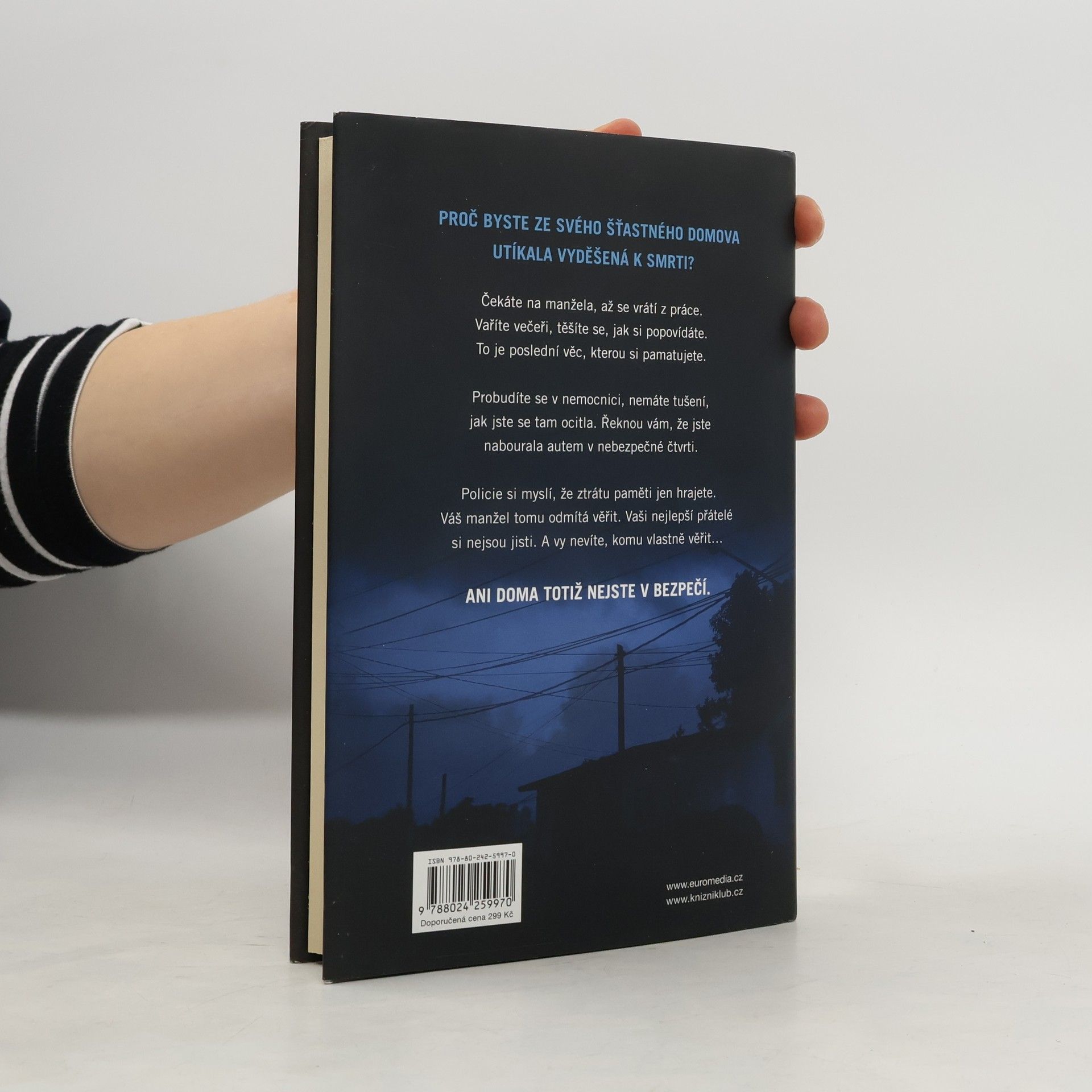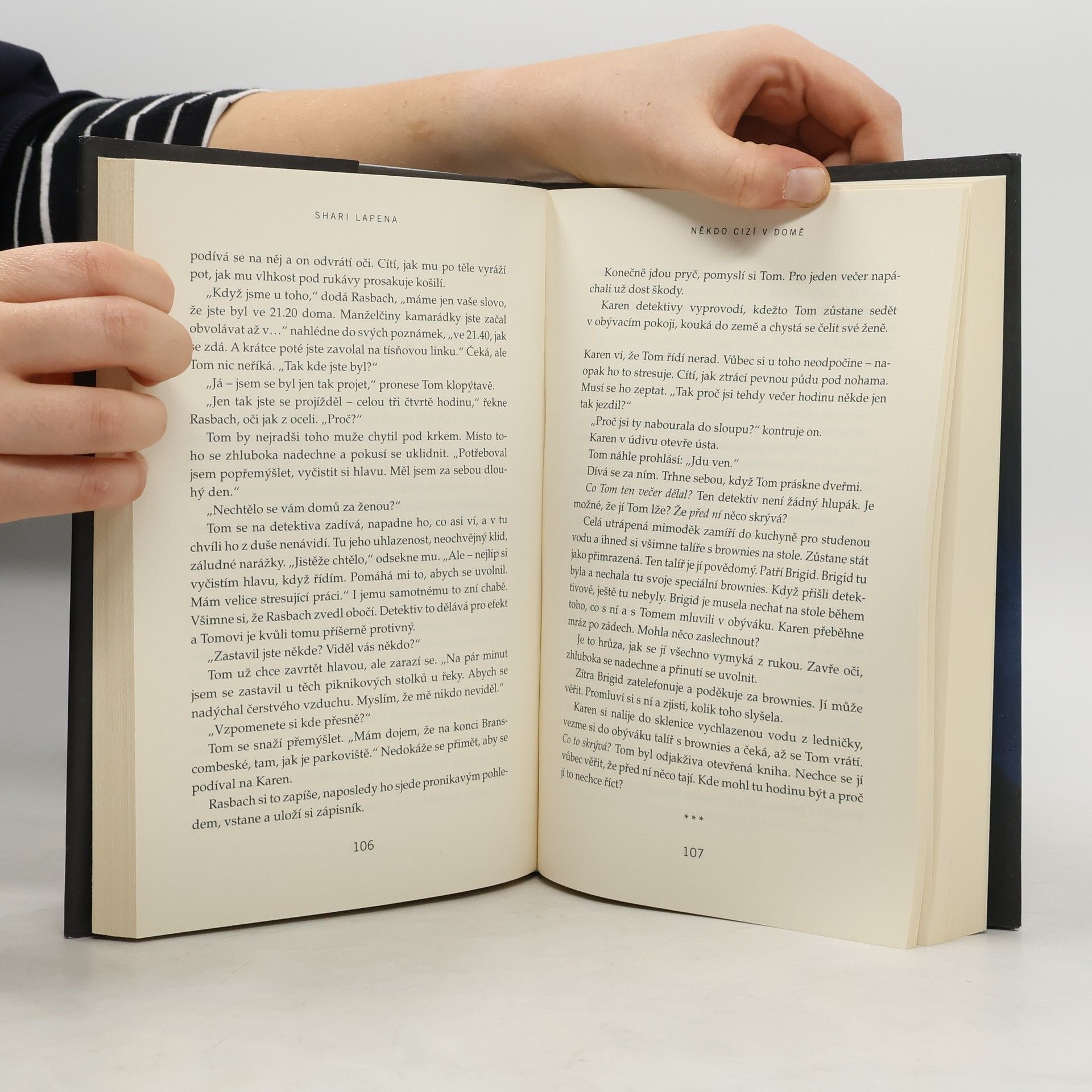 V téhle útulné čtvrti spokojených domovů zůstávají nebezpečné lži uzavřeny za dveřmi… Shari Lapena, autorka thrilleru roku 2017 Manželé odvedle, přichází s dalším rodinným dramatem plným tajemství a nečekaných zvratů, které nikdy nepřestanou překvapovat. Karen a Tom Kruppovi jsou šťastní – vzali se teprve nedávno a vlastní nádherný dům poblíž New Yorku. Jednoho dne se Tom vrátí domů a zjistí, že Karen zmizela – její auto je pryč a zdá se, že odjela ve spěchu. Nevzala si dokonce ani kabelku, telefon, doklady. Krátce nato se Tom dozví, že Karen měla nehodu a leží v nemocnici s otřesem mozku a ztrátou paměti. Po čase se Karen, odhodlaná vyléčit se a zapomenout, vrací s Tomem domů. Ale zdá se, že se tam něco změnilo. Něco není v pořádku. Někdo tam byl. Někdo cizí. Jenže v tomhle domě je každý cizí. Každý má něco, co by podle něj mělo zůstat skryto. Něco, kvůli čemu by raději vraždil, jen aby si to mohl nechat pro sebe...