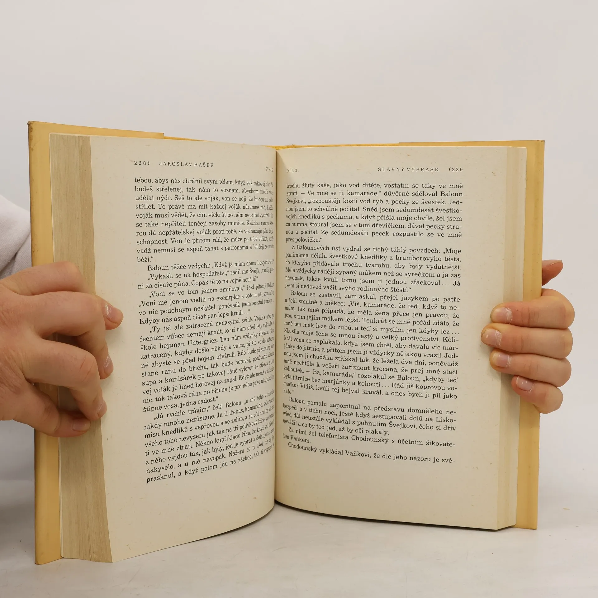 Slavný výprask - 91. pěší pluk je opět naložen do vlaku, který jej veze jako „novou skupinu lidí hnaných na jatky“ do Haliče na ruskou frontu. Hašek tuto pouť přes celé Uhry popisuje tak, že se román stává skutečnou obžalobou války a stupidních důstojníků, kterým nejde o nic jiného než o vlastní prospěch bez ohledu na osudy vojáků, kterým mají velet. Jejich schopnosti Hašek popisuje takto: „Byl to pán velkých vojenských schopností, které se mu vrazily do nohou ve formě podágry“. Názory prostých vojáků na válku charakterizuje Hašek slovy: „Po celou dobu železniční přepravy bataliónu, který měl sklízet válečnou slávu, až projde pěšky od Laborce východní Haličí na front, vedly se ve vagónu, kde byl jednoroční dobrovolník a Švejk, opět podivné řeči, víceméně velezrádného obsahu“. Na konci dílu je Švejk vyslán jako kvartýrmachr zajistit pro svou kumpanii nocleh ve Felštýně. Když Švejk dojde k malému rybníku, setká se tam s uprchlým ruským zajatcem, který se tam koupal a po spatření Švejka se dal nahý na útěk. Švejk si oblékne jeho uniformu, protože je zvědav, jak by mu asi slušela. V této uniformě ho najde patrola polního četnictva, která tohoto ruského uprchlíka hledala. Jsou to Maďaři, kteří Švejkovi nerozumí a přes jeho protesty ho zařadí do transportu ruských zajatců určených pracovat na opravě železniční trati. Tak Švejk upadne omylem do rakouského zajetí. Pokračování slavného výprasku - Poté, co je zjištěno, že Švejk je Čech, je na něj pohlíženo jako na zběha a polní soud ho odsoudí k smrti. Duchovní útěchu před popravou mu má poskytnout polní kurát Martinec, původně skutečně nábožensky založený muž, který stykem s opilými důstojníky postupně mravně upadá, což si nepřestává v skrytu duše neustále vyčítat. Švejk jej však považuje za dalšího vězně a svými proslovy jej tak vyděsí, že Martinec z cely prchne na důstojnický večírek, kde se zpije do bezvědomí „s přesvědčením, že se hraje o jeho duši a on sám že je mučedníkem“. Nakonec se vše vysvětlí a Švejk se opět ocitne u své marškumpanie. Haškův text pak končí proslovem poručíka Duba „S okresním hejtmanem jsme vždy říkávali: Patriotismus, věrnost k povinnosti, sebepřekonání, to jsou ty pravé zbraně ve válce! Připomínám si to zejména dnes, když naše vojska v dohledné době překročí hranice“. Vše, co případně v knize následuje za touto větou, je pokračování dopsané od Karla Vaňka.