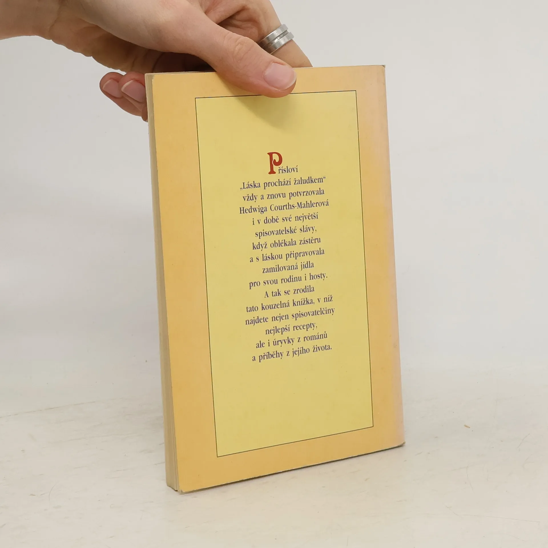 Přísloví "Láska prochází žaludkem" vždy a znovu potvrzovala Hedwiga Courths-Mahlerová i v době své největší spisovatelské slávy, když oblékala zástěru a s láskou připravovala zamilovaná jídla pro svou rodinu i hosty. A tak se zrodila tato kouzelná knížka, v níž najdete nejen spisovatelčiny nejlepší recepty, ale i úryvky z románů a příběhy z jejího života.