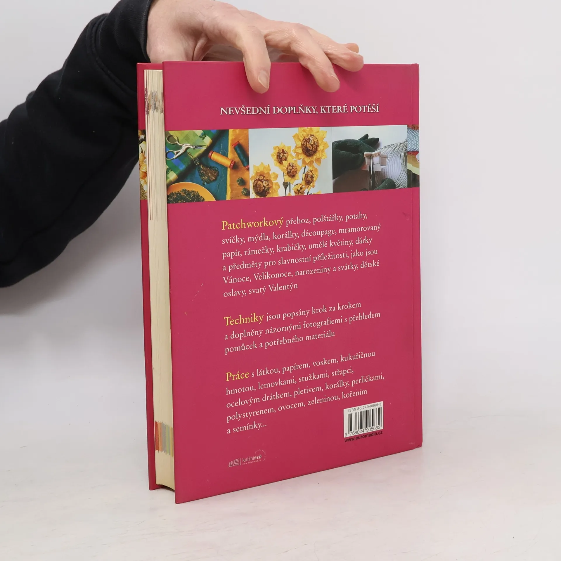 Nevšední doplňky, které potěší - Patchworkový přehoz, polštářky, potahy, svíčky, mýdla, korálky, découpage, mramorovaný papír, rámečky, krabičky, umělé květiny, dárky a předměty pro slavnostní příležitosti, jako jsou Vánoce, Velikonoce, narozeniny a svátky, dětské oslavy, svatý Valentýn Techniky jsou popsány krok za krokem a doplněny názornými fotografiemi s přehledem pomůcek a potřebného materiálu Práce s látkou, papírem, voskem, kukuřičnou hmotou, lemovkami, stužkami, střapci, ocelovým drátkem, pletivem, korálky, perličkami, polystyrenem, ovocem, zeleninou, kořením a semínky...