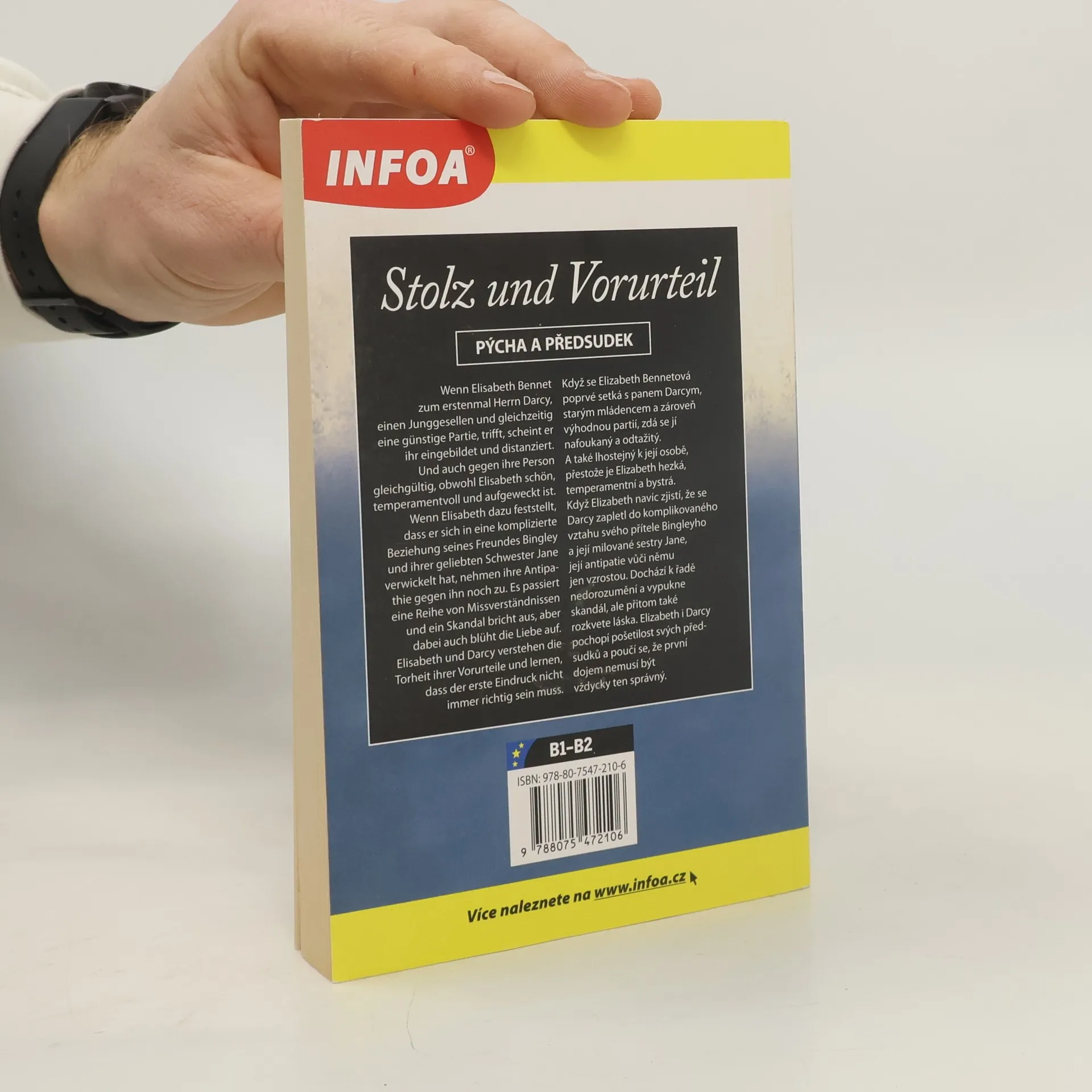 Když se Elizabeth Bennetová poprvé setká s panem Darcym, starým mládencem a zároveň výhodnou partií, zdá se jí nafoukaný a odtažitý. A také lhostejný k její osobě, přestože je Elizabeth hezká, temperamentní a bystrá. Když Elizabeth navíc zjistí, že se Darcy zapletl do komplikovaného vztahu svého přítele Bingleyho a její milované sestry Jane, její antipatie vůči němu ještě vzrostou. Dochází k řadě nedorozumění a vypukne skandál, ale přitom také rozkvete láska. Elizabeth a Darcy pochopí pošetilost svých předsudků a poučí se, že první dojem nemusí být vždycky ten správný. Německý text: Katharina Leither Korektura textu: Mgr. Eva Baudyšová