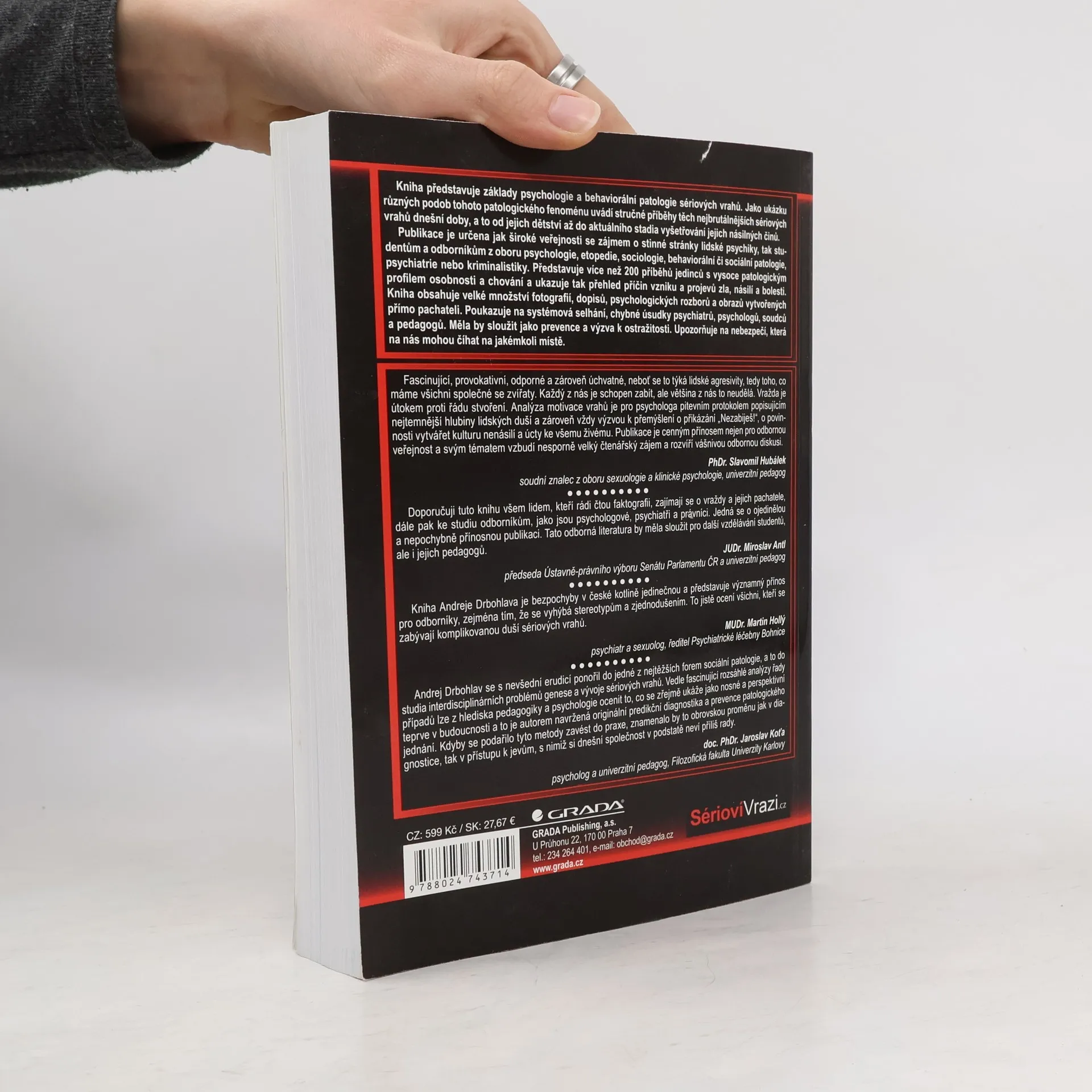 Kniha představuje základy psychologie a behaviorální patologie sériových vrahů. Jako praktickou ukázku různých podob tohoto patologického fenoménu uvádí stručné, srozumitelné a čtivé příběhy těch nejbrutálnějších sériových vrahů dnešní doby, a to od jejich dětství až do aktuálního stádia vyšetřování jejich násilných činů. Publikace je určena stejně tak široké veřejnosti se zájmem o stinné stránky lidské psychiky, jako i studentům a odborníkům z oboru psychologie, etopedie, sociologie, behaviorální či sociální patologie, psychiatrie či kriminalistiky. Představuje soubor velmi kvalitně zpracovaných kazuistik, tedy více jak 200 příběhů jedinců s vysoce patologickým profilem osobnosti a chování. Ukazuje tak přehled příčin vzniku a projevu zla, násilí a bolesti. Kniha obsahuje velké množství fotografií, dopisů, psychologických rozborů a obrazů vytvořených pachateli. Poukazuje na systémová selhání, chybné úsudky psychiatrů, psychologů, soudců a pedagogů. Měla by sloužit jako prevence a výzva k větší ostražitosti. Upozorňuje na složitost a aktuálnost tohoto jevu a skryté nebezpečí, které číhá na svou oběť na jakémkoliv místě.