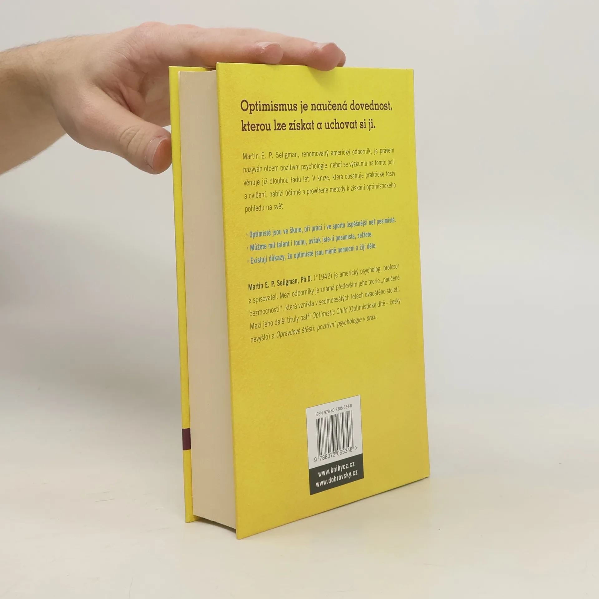 Do rukou se vám dostává seriózní kniha založená na mnohaletém výzkumu významného psychologa. Martin E. P. Seligman se bádání na tomto poli věnuje už několik desetiletí. V knize Naučený optimismus shrnul své poznatky a nabízí účinné metody k získání pozitivního pohledu na svět. Dozvíte se, jak se zbavit zlozvyku pesimismu a nevzdávat se kvůli maličkostem - dokážete si konstruktivněji vysvětlit své chování a naučíte se jednat sami se sebou mnohem pozitivněji. Podaří se vám prolomit depresivní myšlenky, lépe využijete svého potenciálu, budete úspěšnější a spokojenější. Kniha obsahuje konkrétní cvičení, testy a rady pro různá prostředí (škola, práce, rodina) a naučí optimismu i toho nejzarytějšího pesimistu.