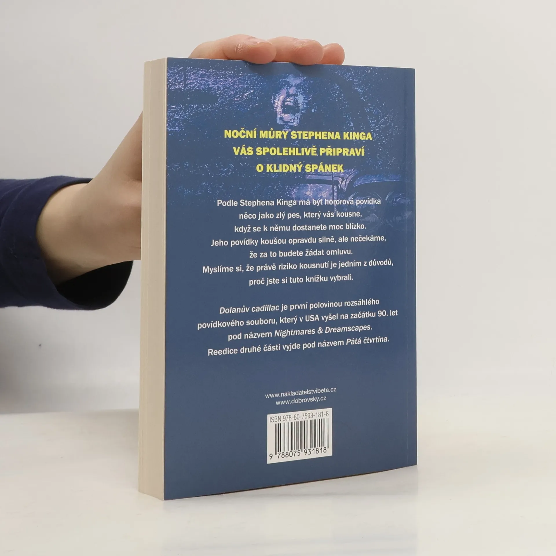 Noční můry a snové výjevy Z odpadu umyvadla v koupelně vykoukne prst a zaútočí. Zuby na klíček z obchodu se suvenýry se promění v krvežíznivého dravce. Dálnice v Nevadské poušti pohřbí luxusní cadillac i s jeho majitelem. Americká letiště terorizuje upír s pilotním průkazem a špičky tenisek vykukující zpod dveří kabinky na toaletě neznamenají, že nohy v nich patří živému člověku. A Janis Joplin by na vás už dávno neměla promlouvat z reálu, tím méně vám proslulým chraplákem nabízet účast na koncertě pekelně dobré kapely... Povídky uveřejněné v této knize jsou první polovinou rozsáhlého povídkového souboru, který na začátku devadesátých let v USA vyšel pod názvem Nightmares & Dreamscapes. Reedici druhé poloviny, pod názvem Pátá čtvrtina, připravujeme na září 2020 - toto vydání bude rozšířeno o nově přeloženou povídku. reedice