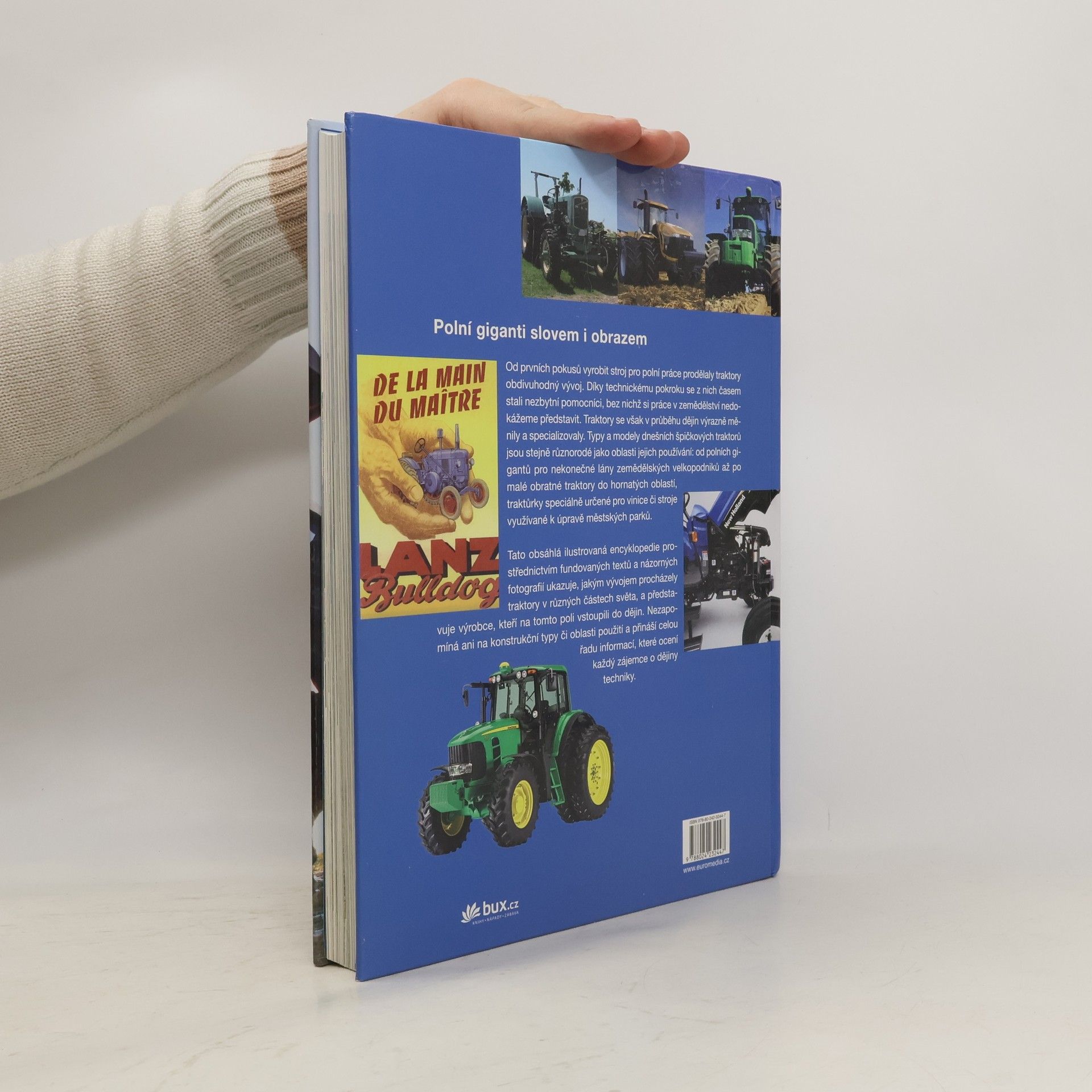 Obsáhlá ilustrovaná encyklopedie ukazuje prostřednictvím fundovaných textů a názorných ilustrací, jakým vývojem procházely traktory i jejich výrobci v různých částech světa. Zmiňuje také převratné vynálezy a technické novinky, které umožnily vznik dnešních specializovaných traktorů s nejmodernějším technickým vybavením, představuje konstrukční typy i oblasti použití a přináší celou řadu zajímavých informací z dějin z těchto užitečných, všudypřítomných pomocníků.
