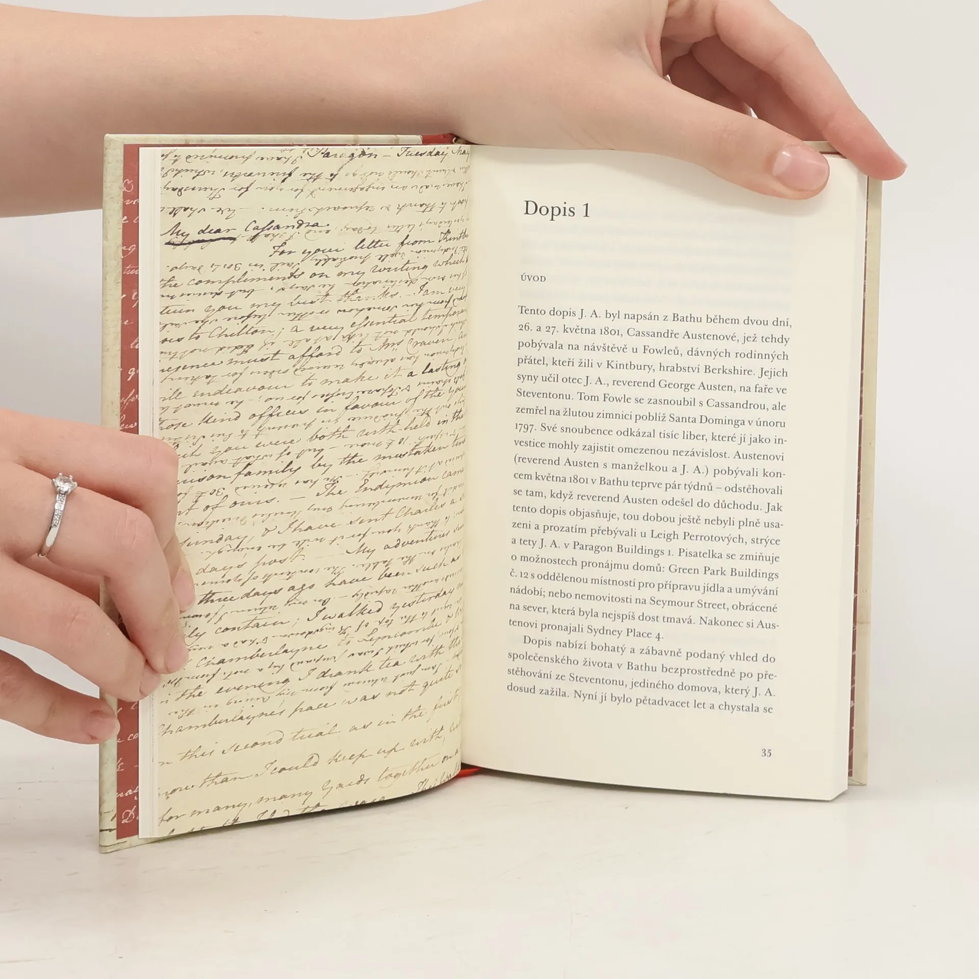 Třináct dopisů, které získalo Muzeum Jane Austenové, nám dává nahlédnout do soukromého i pracovního života této slavné a oblíbené anglické spisovatelky v letech 1801 až 1817. Dozvíme se něco z prostředí lázeňského města Bath, kde s rodinou pobývala až do roku 1805, kdy zemřel její otec. Její pozdější dopisy už jsou psány převážně z Chawtonu, kde s matkou, sestrou Cassandrou a Marthou Lloydovou žila téměř do své předčasné smrti. Najdeme v nich zajímavé i barvité postřehy z venkovského života, ale i mnohé poznámky týkající se vzniku a přijetí jejích děl, hlavně Pýchy a předsudku, Mansfieldského panství a Emmy. S těmito romány jsou spjaty i její pobyty v Londýně, kde dohlížela na jejich tisk a vydání. Vůbec nejdojemnější dopis, sepsaný pouhých pár dní po spisovatelčině smrti roku 1817, však pochází z pera její milované sestry Cassandry. Každý dopis je opatřen úvodem a poznámkami, které vysvětlují, co by dnešnímu čtenáři mohlo případně unikat.