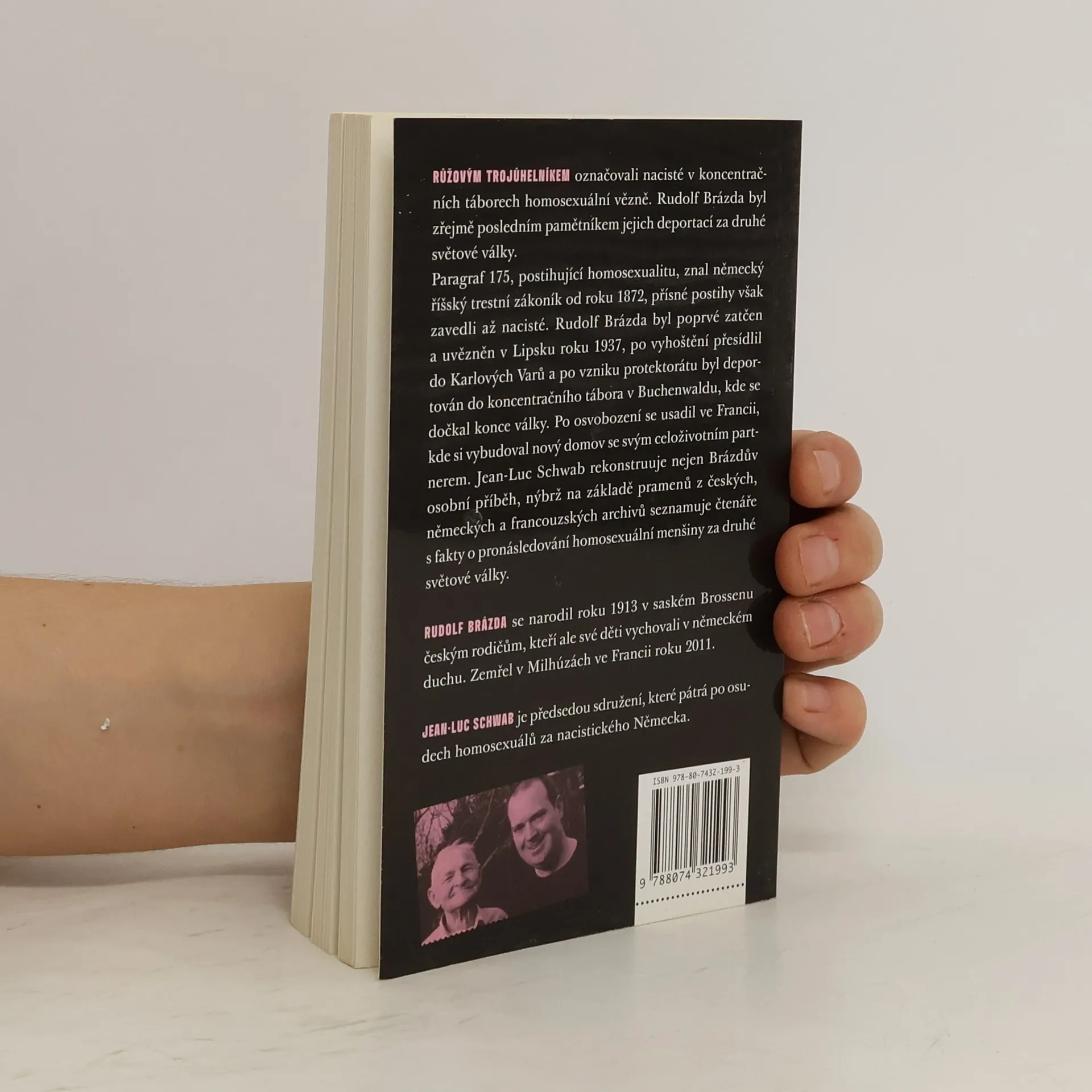 Růžovým trojúhelníkem označovali nacisté v koncentračních táborech homosexuální vězně. Rudolf Brázda byl zřejmě posledním pamětníkem jejich deportací za druhé světové války. Paragraf 175, postihující homosexualitu, znal německý říšský trestní zákoník od roku 1872, přísné postihy však zavedli až nacisté. Rudolf Brazda byl poprvé zatčen a uvězněn v Lipsku roku 1937, po vyhoštění přesídlil do Karlových Varů a po vzniku Protektorátu byl deportován do koncentračního tábora v Buchenwaldu, kde se dočkal konce války. Po osvobození se usadil ve Francii, kde si vybudoval nový domov se svým celoživotním partnerem. Jean-Luc Schwab rekonstruuje nejen Brazdův osobní příběh, nýbrž na základě pečlivé práce s prameny z českých, německých a francouzských archivů seznamuje čtenáře s fakty o pronásledování homosexuální menšiny za druhé světové války.