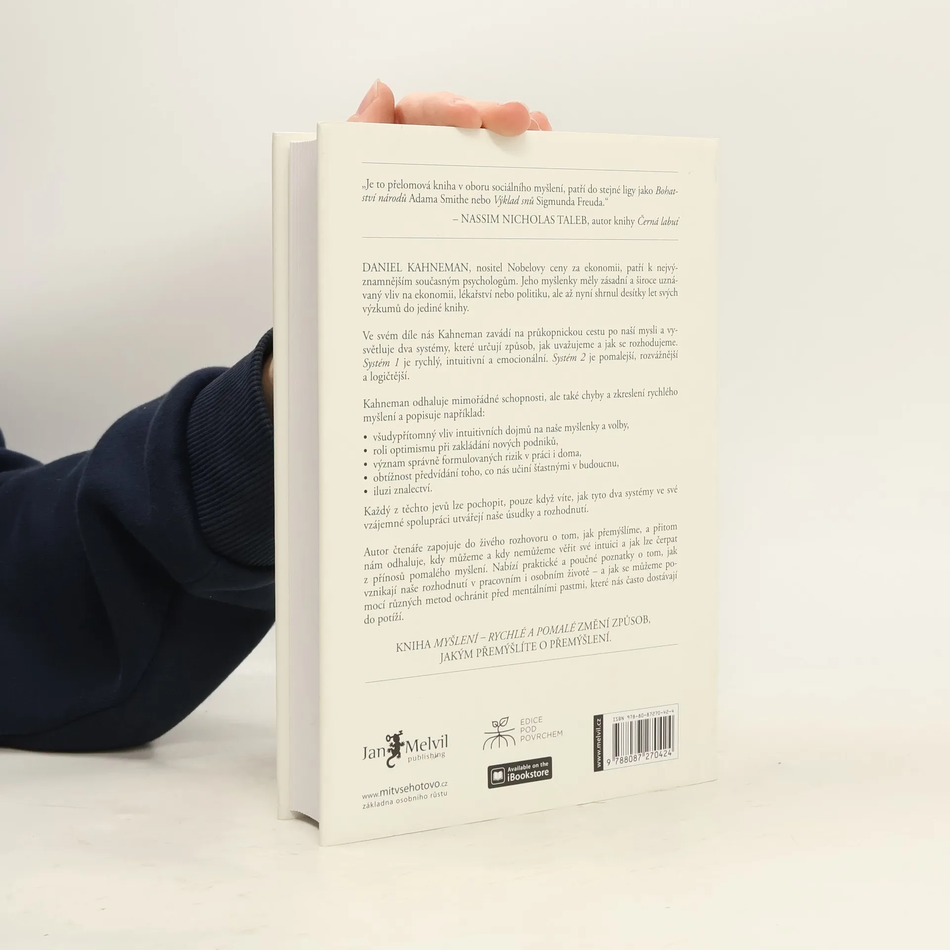 Daniel Kahneman, psycholog, držitel Nobelovy ceny za ekonomii, nás v průlomové práci, označované Nassimem Talebem za stejně významné dílo, jakým byl kdysi Freudův „Výklad snů“, seznamuje se dvěma systémy, které řídí to, jak přemýšlíme a jak se rozhodujeme. Systém 1 je rychlý, intuitivní a emocionální. Systém 2 je pomalý, váhavý a logický. Poutavý průvodce myslí nás ve čtivé knize vtahuje do dialogu o tom, jak přemýšlíme, a přitom odhaluje, v kterých situacích můžeme a kdy naopak nesmíme věřit své intuici (Systém 1) a také kdy a jak čerpat z přínosu pomalého myšlení (Systém 2). Nabízí praktické i poučné poznatky o tom, jak vznikají naše rozhodnutí v pracovním i osobním životě – a hlavně návod na to, jak se vyvarovat chyb.