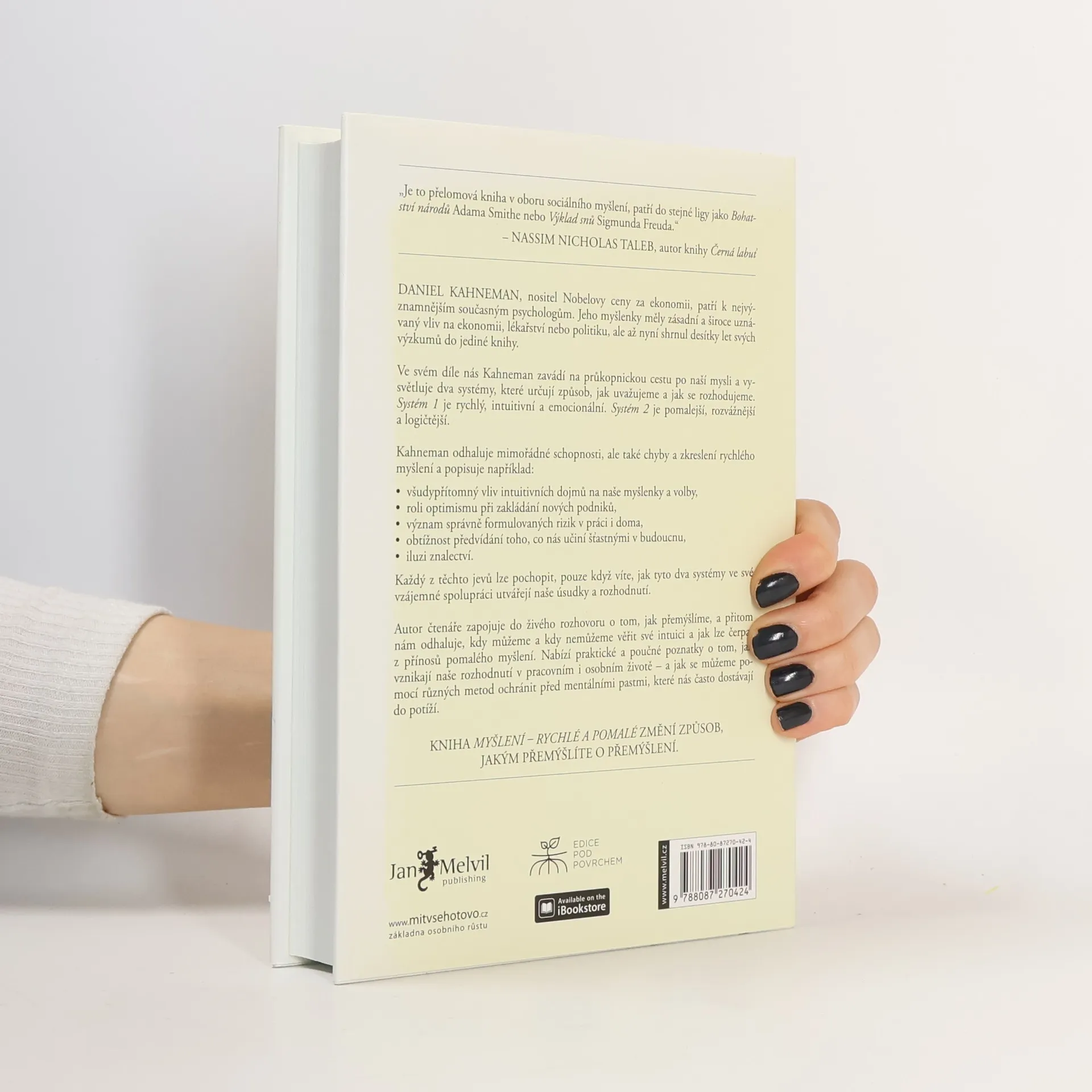 Daniel Kahneman, psycholog, držitel Nobelovy ceny za ekonomii, nás v průlomové práci, označované Nassimem Talebem za stejně významné dílo, jakým byl kdysi Freudův „Výklad snů“, seznamuje se dvěma systémy, které řídí to, jak přemýšlíme a jak se rozhodujeme. Systém 1 je rychlý, intuitivní a emocionální. Systém 2 je pomalý, váhavý a logický. Poutavý průvodce myslí nás ve čtivé knize vtahuje do dialogu o tom, jak přemýšlíme, a přitom odhaluje, v kterých situacích můžeme a kdy naopak nesmíme věřit své intuici (Systém 1) a také kdy a jak čerpat z přínosu pomalého myšlení (Systém 2). Nabízí praktické i poučné poznatky o tom, jak vznikají naše rozhodnutí v pracovním i osobním životě – a hlavně návod na to, jak se vyvarovat chyb.
