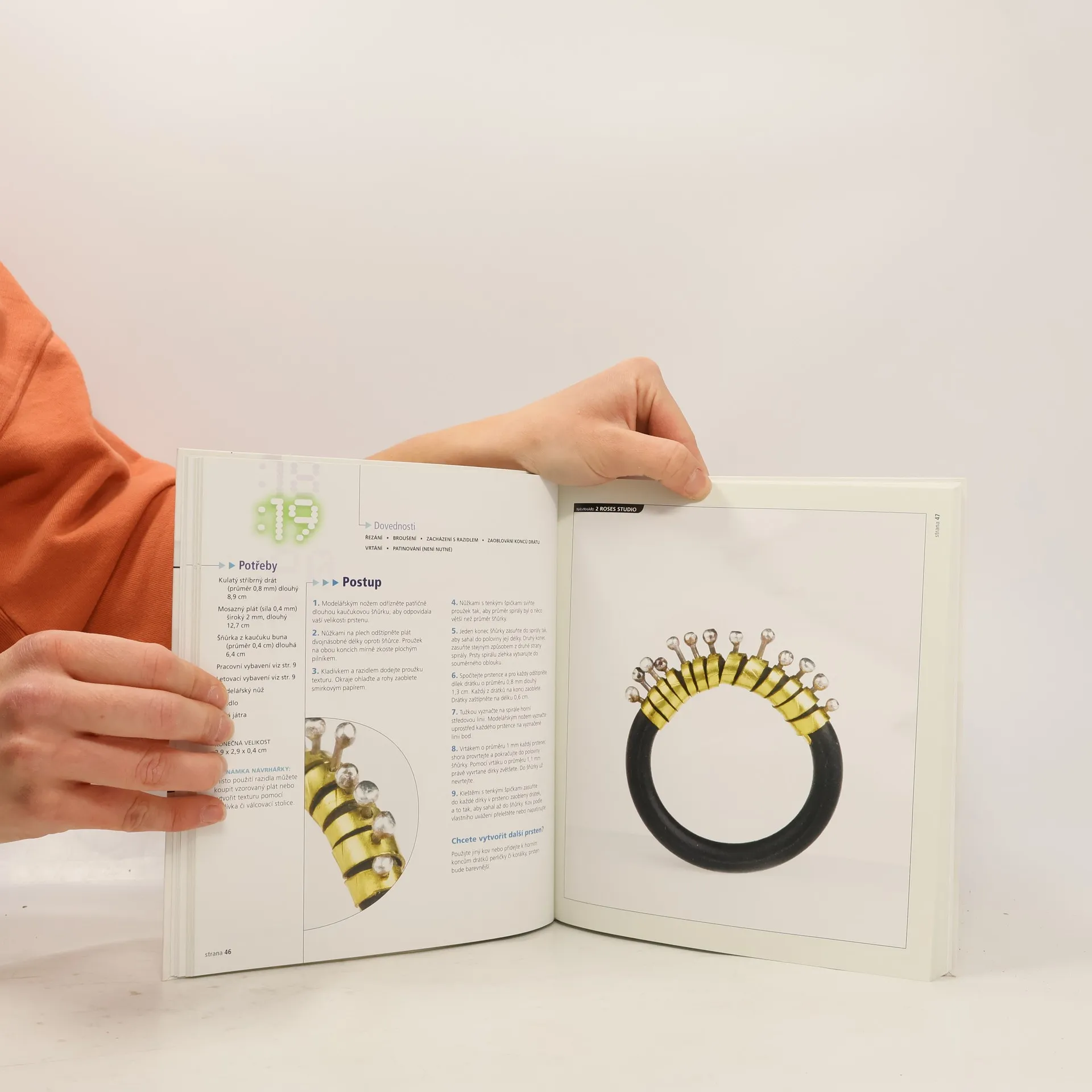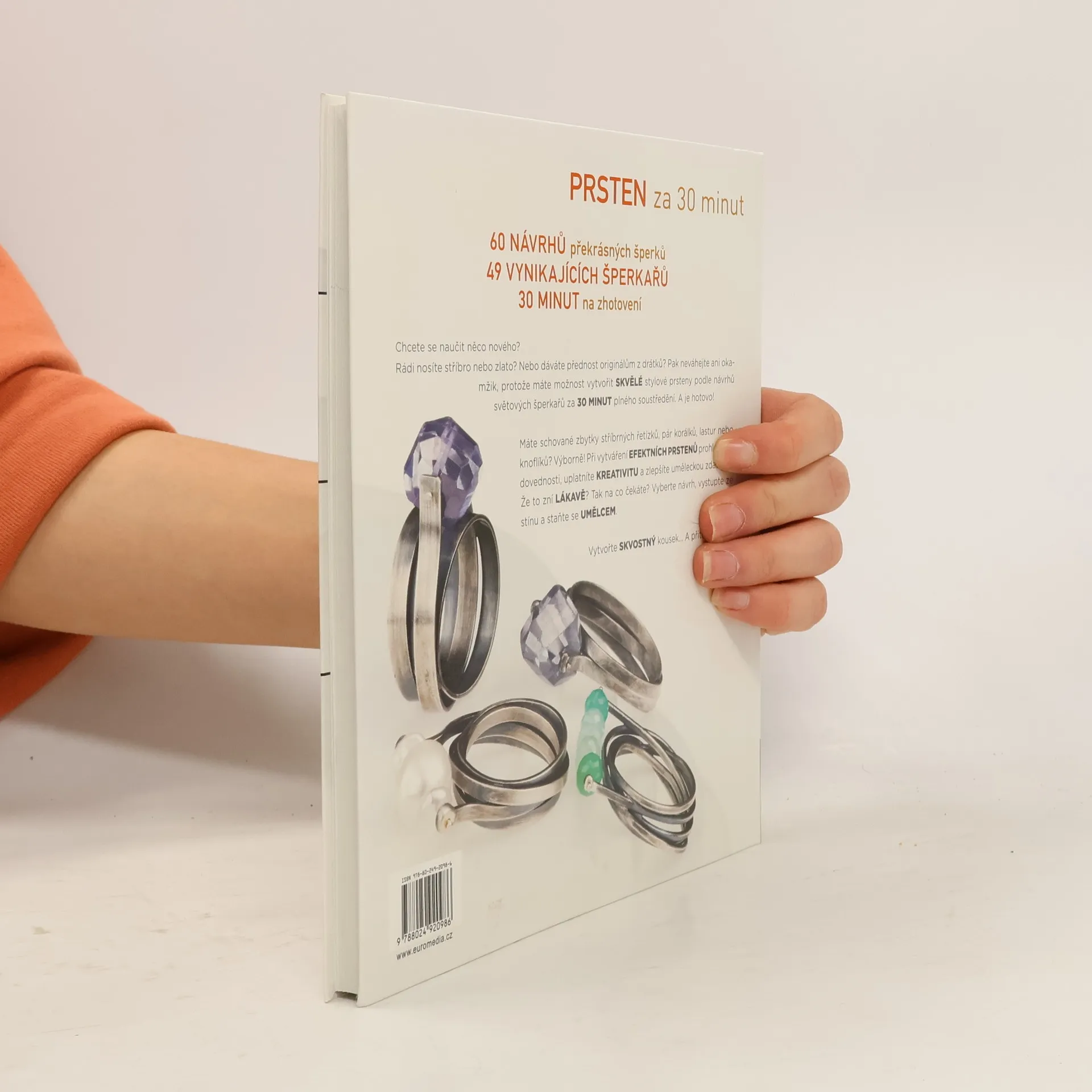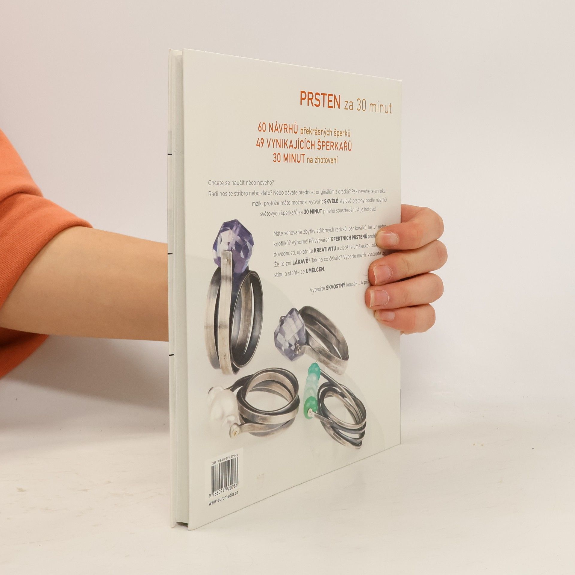 Naše ruce sdělují svému okolí radost a zklamání, nejistotu a zkušenost, lásku a naději. Originální prsteny k nim rozhodně přitáhnou pozornost. Vyberte si ze 60 návrhů různé obtížnosti od 49 světových šperkařů a vytvořte si elegantní, extravagantní nebo všestranný doplněk. Můžete pracovat s drátkem a studenými spoji nebo pájet a vsazovat kameny. Máte schované zbytky stříbrných řetízků, pár korálků, lastur nebo knoflíků? Výborně! Při vytváření efektních prstenů uplatníte kreativitu a zlepšíte uměleckou zdatnost.