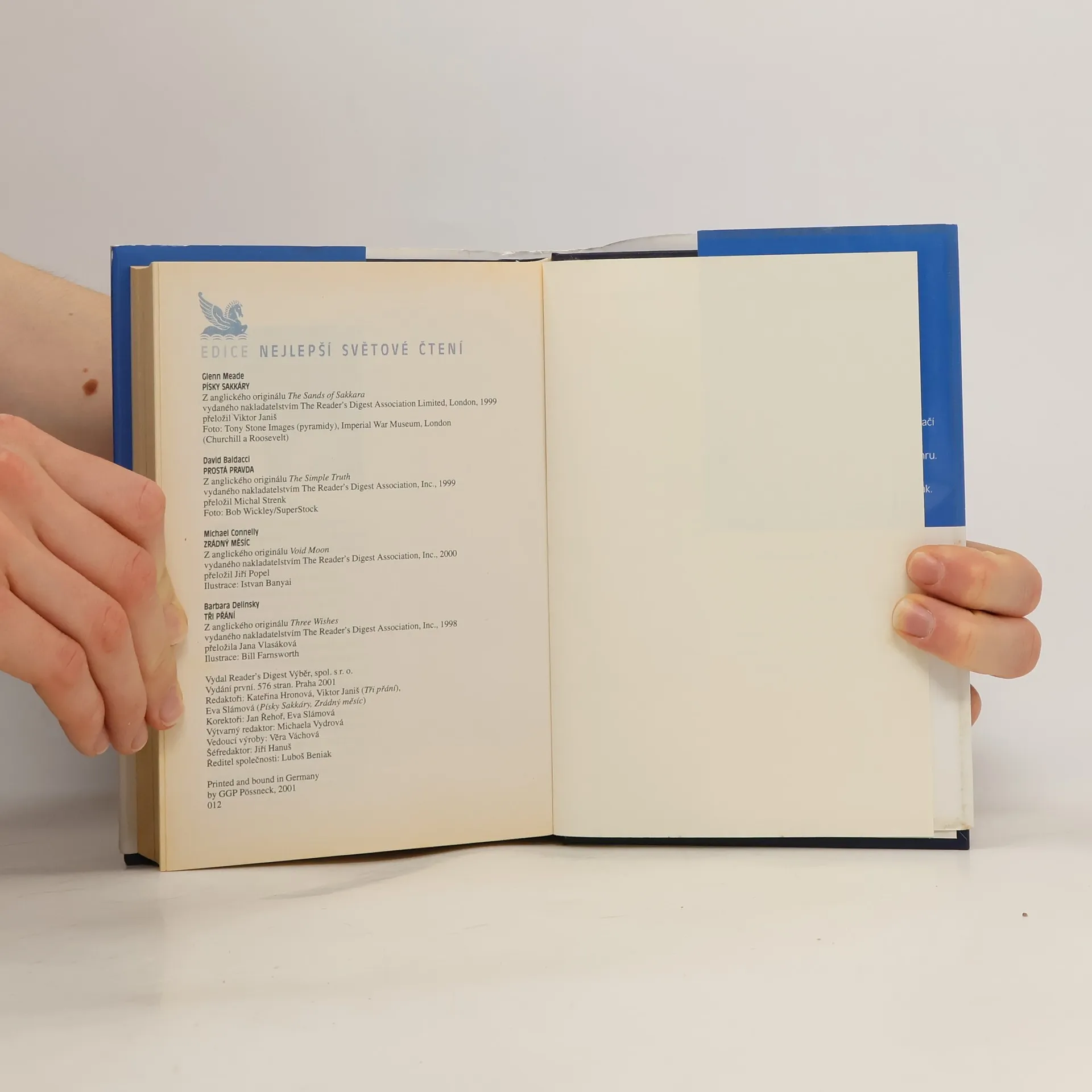Kniha přináší překlady čtyř úspěšných románů se záhadnou nebo kriminální zápletkou od anglických a amerických autorů. / Písky Sakkáry - Glenn Meade / Prostá pravda - David Baldacci / Zrádný měsíc - Michael Connelly / Tři přání - Barbara Delinsky