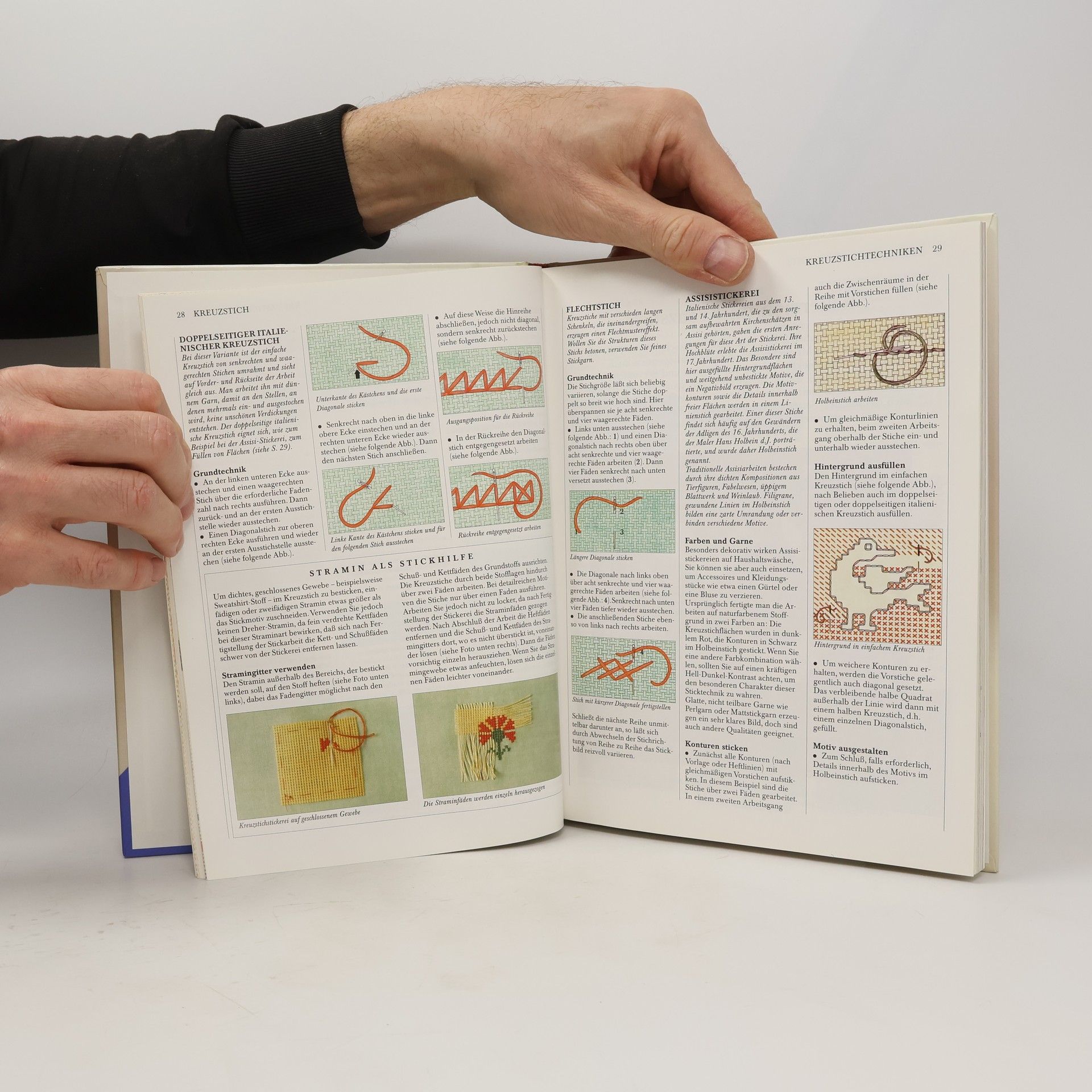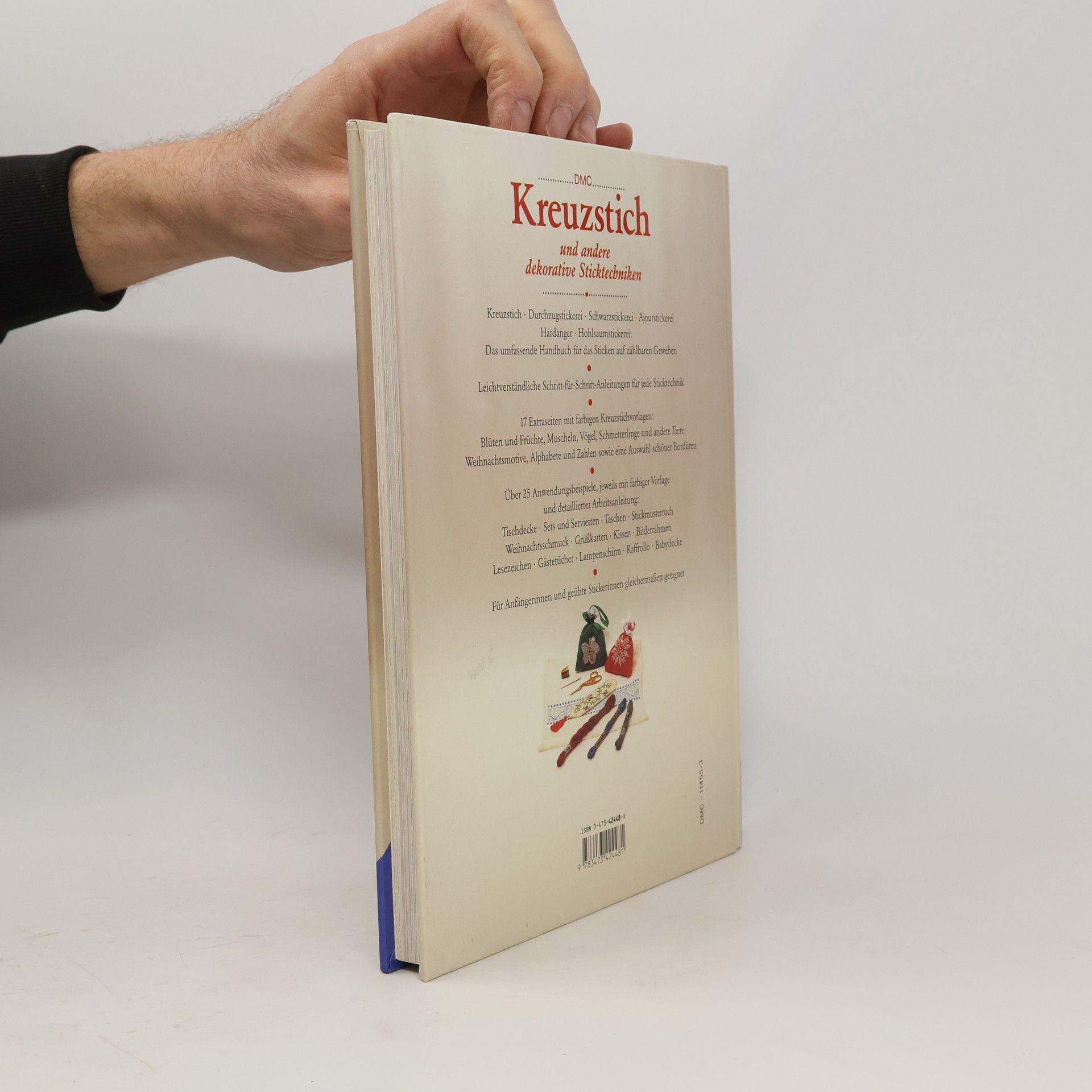 Attraktiv gestaltetes Handarbeitsbuch, das in die fadengebundene Stickerei einführt: Kreuzstich, Durchzug- und Schwarzweißstickerei, Ajour-, Hardanger- und Hohlsaumstickerei. Nach grundlegenden Informationen zu Garn und Arbeitsmaterial werden die einzelnen Techniken Schritt für Schritt in Wort und Bild sehr anschaulich und gut verständlich erklärt. Daran anschließend findet sich eine Auswahl an reizvollen und vielseitig verwendbaren Motiven: Zahlen, Buchstaben, Früchte, Weihnachts-, Tier-, Blumenmotive, Vorschläge für Bordüren. Duftsäckchen, hübsche Motive fürs Kinderzimmer, für Vorhänge, Kissen, Bilder, Lampenschirm, Servietten usw. Die Arbeitsanweisungen sind klar und ausführlich. Alle Motive sind farbig abgebildet und die 25 Modellvorschläge auf großformatigen Farbfotos abgelichtet. Empfehlenswertes Handbuch (Schwerpunkt: Kreuzstich) mit vielfältigen Anregungen. Für Anfänger und Fortgeschrittene.