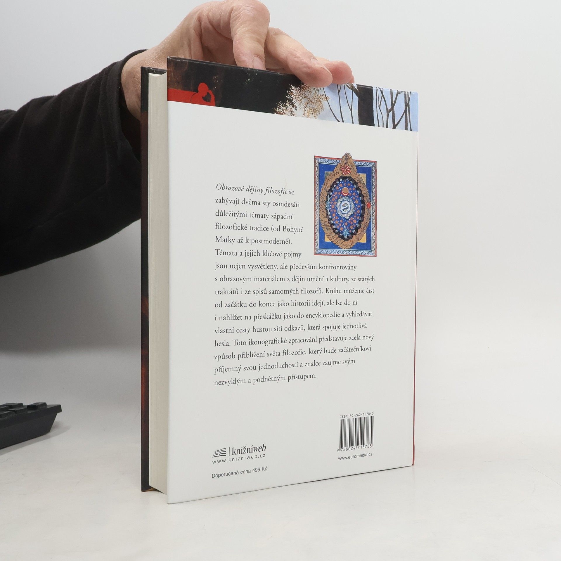 Obrazové dějiny filozofie se zabývají dvěma sty osmdesáti důležitými tématy západní filozofické tradice (od Bohyně Matky až k postmoderně). Témata a jejich klíčové pojmy jsou nejen vysvětleny, ale především konfrontovány s obrazovým materiálem z dějin umění a kultury, ze starých traktátů i ze spisů samotných filozofů. Knihu můžeme číst od začátku do konce jako historii idejí, ale lze do ní i nahlížet na přeskáčku jako do encyklopedie a vyhledávat vlastní cesty hustou sítí odkazů, která spojuje jednotlivá hesla. Toto ikonografické zpracování představuje zcela nový způsob přiblížení světa filozofie, který bude začátečníkovi příjemný svou jednoduchostí a znalce zaujme svým nezvyklým a podnětným přístupem.