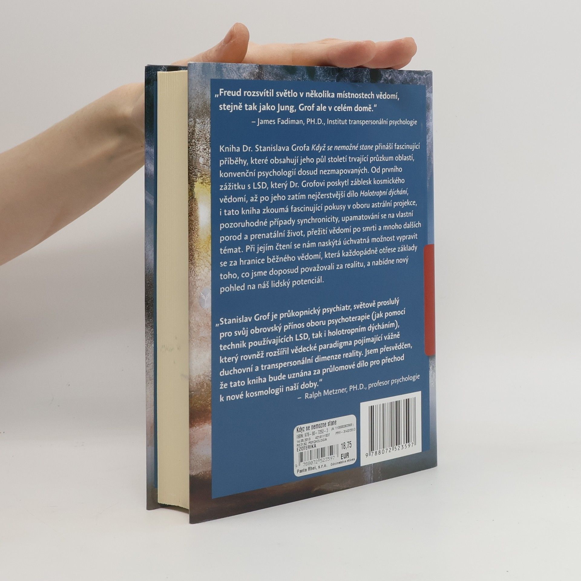 Esotrerika, psychologie i medicína. Fascinující příběhy, které obsahují Grofův půl století trvající průzkum oblastí, které konvenční psychologie dosud nezmapovala. Od prvního zážitku s LSD, který dr. Grofovi poskytl záblesk kosmického vědomí, až po jeho zatím nejčerstvější dílo Holotropní dýchání, i tato kniha zkoumá fascinující pokusy v oboru astrální projekce, pozoruhodné případy synchronicity, upamatování se na vlastní porod a prenatální život, přežití vědomí po smrti a mnoho dalších témat. Při jejím čtení se nám naskýtá úchvatná možnost vypravit se za hranice běžného vědomí, která každopádně otřese základy toho, co jsme doposud považovali za realitu, a nabídne nový pohled na náš lidský potenciál