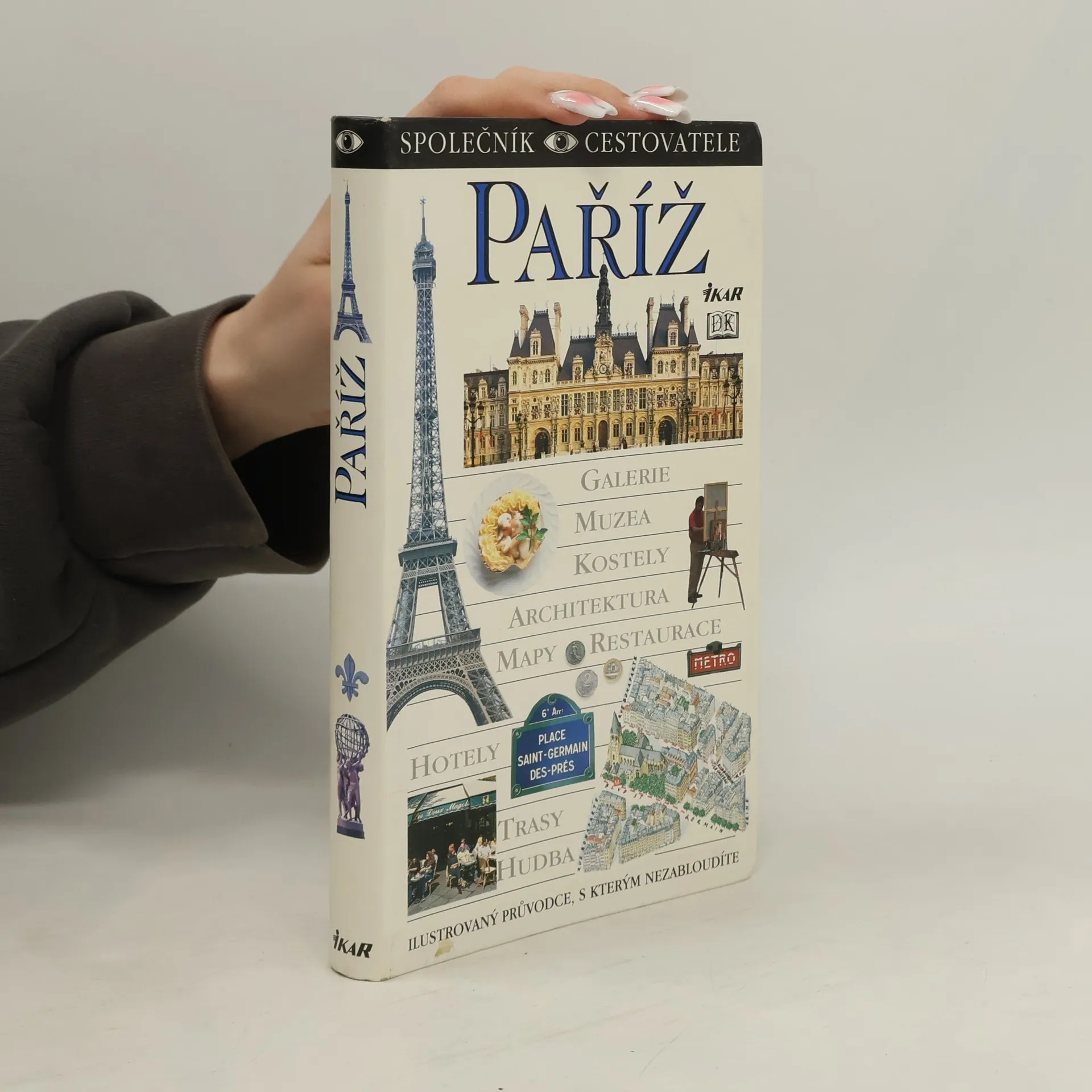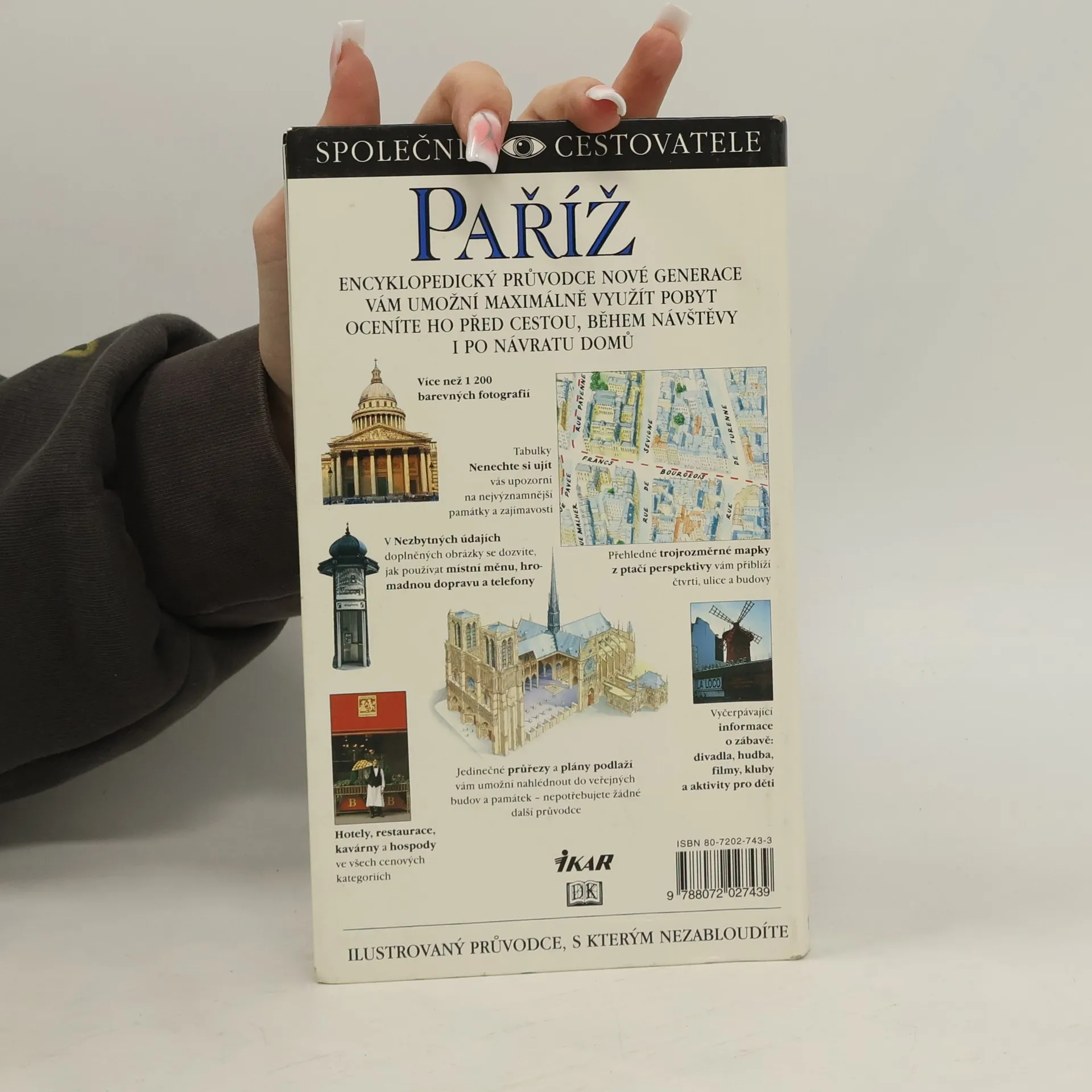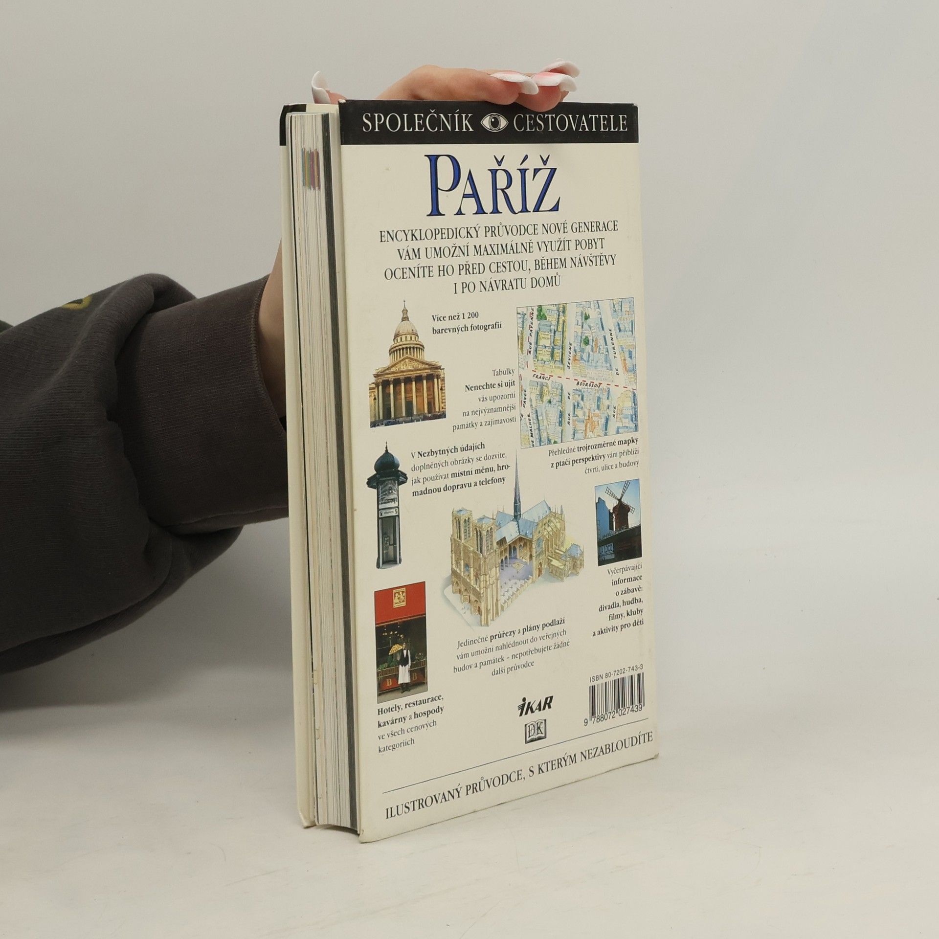 Encyklopedický průvodce nové generace, který vám umožní maximálně využít pobyt, oceníte ho před cestou, během návštěvy i po návratu domů. Obsahuje více než 1 200 barevných fotografií, tabulky "Nenechte si ujít", které vás upozorní na nejvýznamnější památky a zajímavosti, přehledné trojrozměrné mapky z ptačí perspektivy, podrobné informace o zábavě (divadla, hudba, filmy, kluby a aktivity pro děti) a mnoho dalšího. Hlavní spolupracovník: Alan Tillier. Spolupracovníci: Chris Boicos, Michael Gibson, Douglas Johnson, Lenny Borger, Karen Burshtein, Thomas Quinn Curtis, David Downie, Fiona Dunlop, Heidi Ellison, Alexandre Lazareff, Robert Noah, Andrew Sanger, Martha Rose Shulmann, David Stevens, Ian Williams, Jude Welton. Fotografie: Max Alexander, Neil Lucas, Robert O´Dea. Ilustrace: Stephen Colin, Stephen Gyapay, Maltings Partnership. Z anglického originálu „Eyewitness Travel Guides - Paris“ (Dorling Kindersley Limited, London 1993, 1997) přeložila Blanka Brabcová, Jozef Koval, Leona Maříková, Lenka Svobodová. Jazyková revize Věra Běťáková. Vydala Euromedia Group - Ikar Praha v roce 2012. Vydání sedmé.