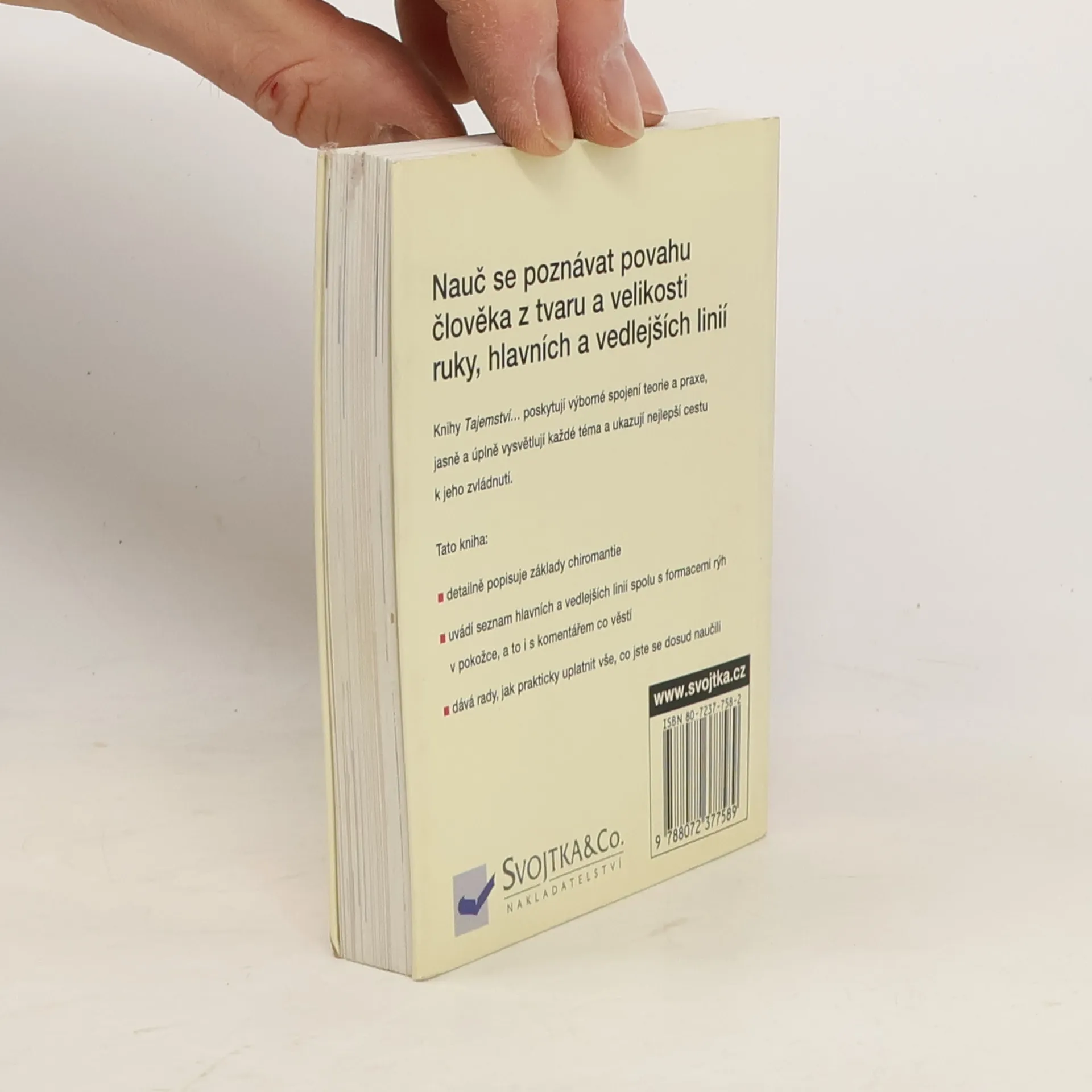 Chiromantie - umění dešifrovat tajemné kódy uložené v našich dlaních - je možná tak stará jako lidstvo samo. Tvar rukou, pahorky, hřebeny, nehty a postavení prstů, každý tento prvek prozrazuje o nás něco nového. Text srozumitelně provede čtenáře dotyčnou naukou a odhalí mu skrytý význam, který obsahují vzájemně odlišné dlaňové linie: čára života, čáry hlavy, srdce a osudu, či Apolónova čára, jež ukazuje, jak jsme se životem spokojeni. Knihu lze použít nejen pro rozbor vlastních citových vztahů, příležitostí v zaměstnání, vyhlídek na zisk peněz, kompatibility vůči partnerovi nebo zdravotní kondice, nýbrž i k předpovědím změn, které možná přinese budoucnost.