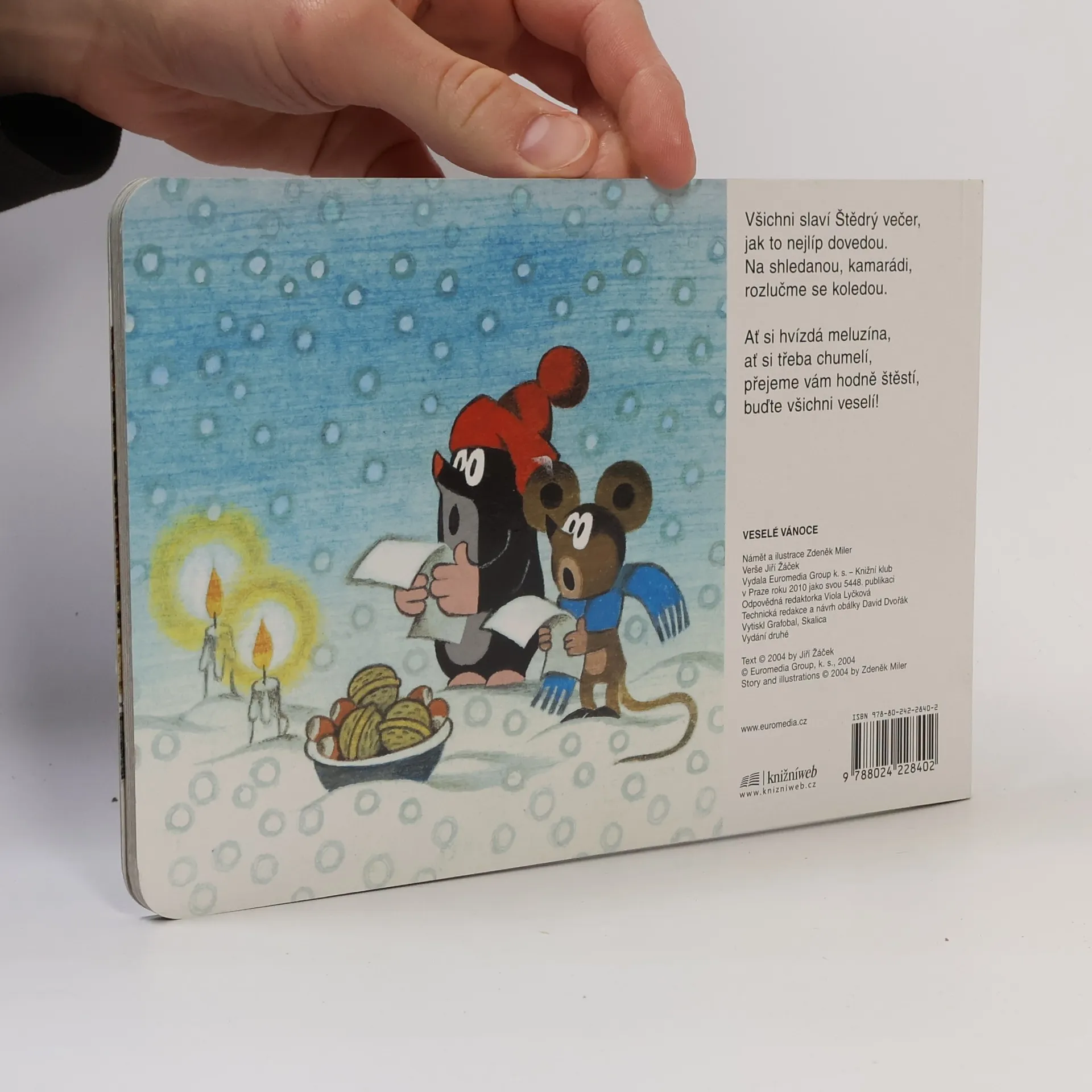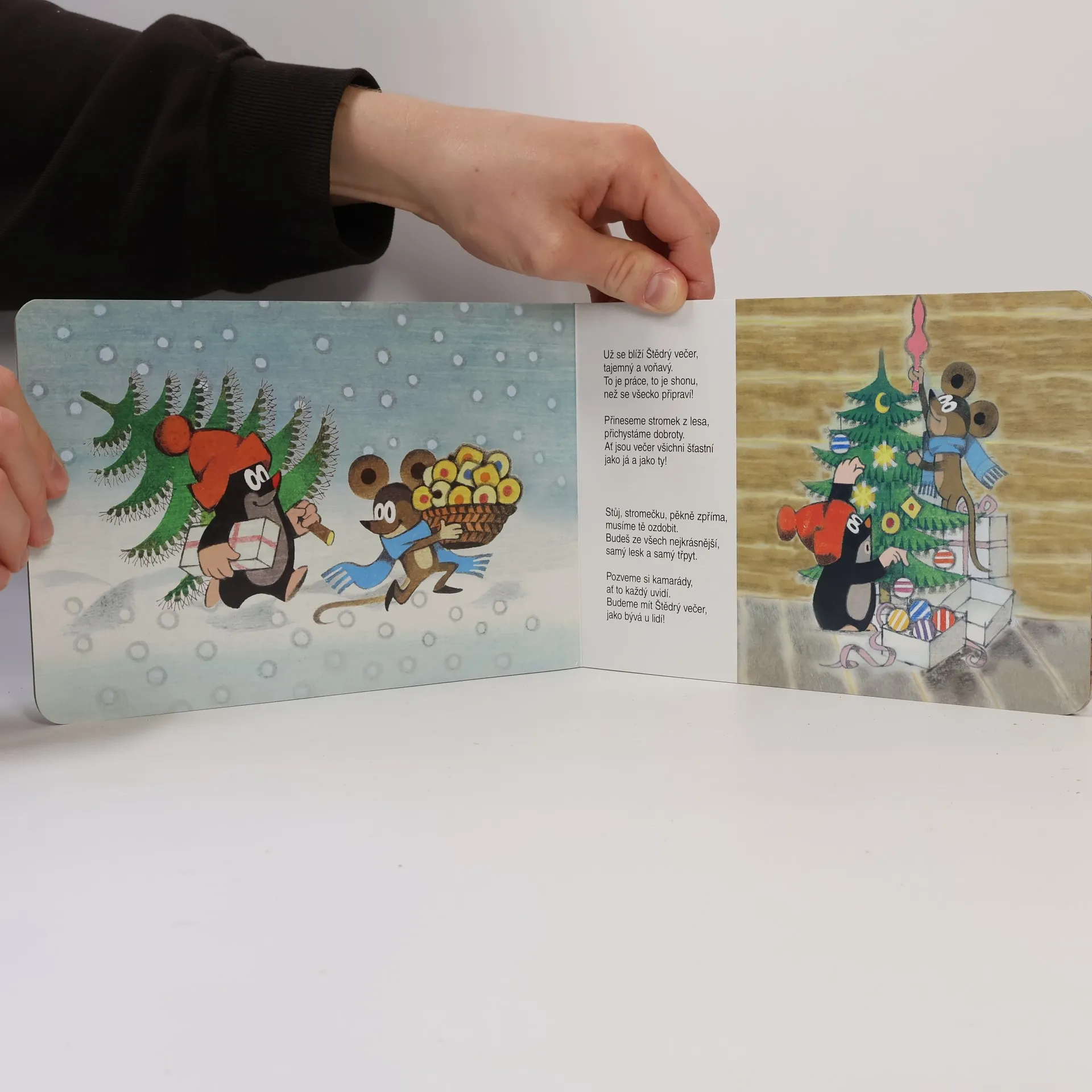 Dvanáctistránkové leporelo o Krtkových Vánocích – o chytání kapra, pečení cukroví, zdobení vánočního stromku, balení dárků, zpívání koled a štědrovečerní večeři. Oblíbené ilustrace Zdeňka Milera jsou doplněny půvabnými verši Jiřího Žáčka.