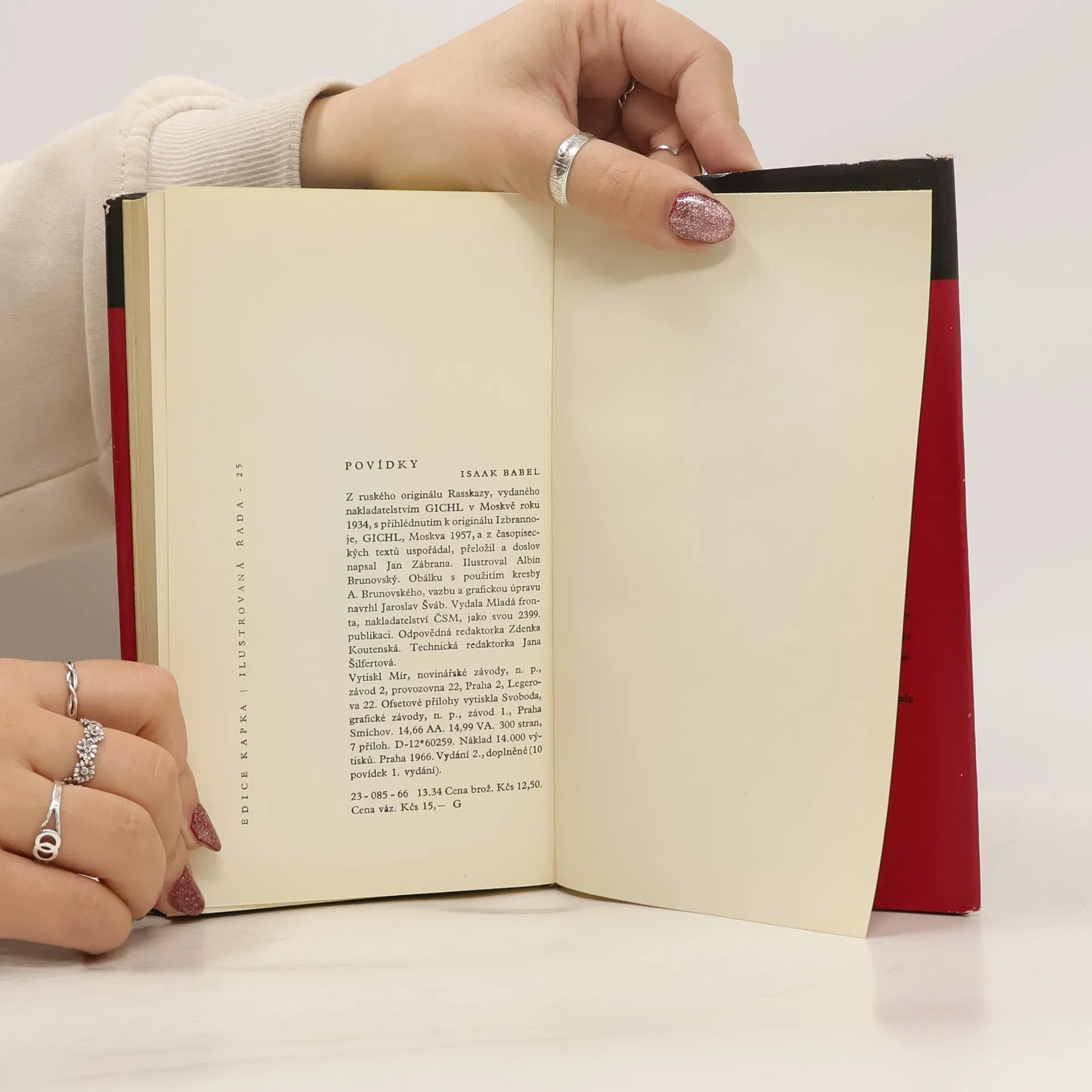 Druhé, doplněné české vydání Babelových povídek. Z ruských knižních originálů a časopiseckých textů vybral, přeložil a doslov napsal Jan Zábrana. Edice Kapka, Ilustrovaná řada sv. 25.