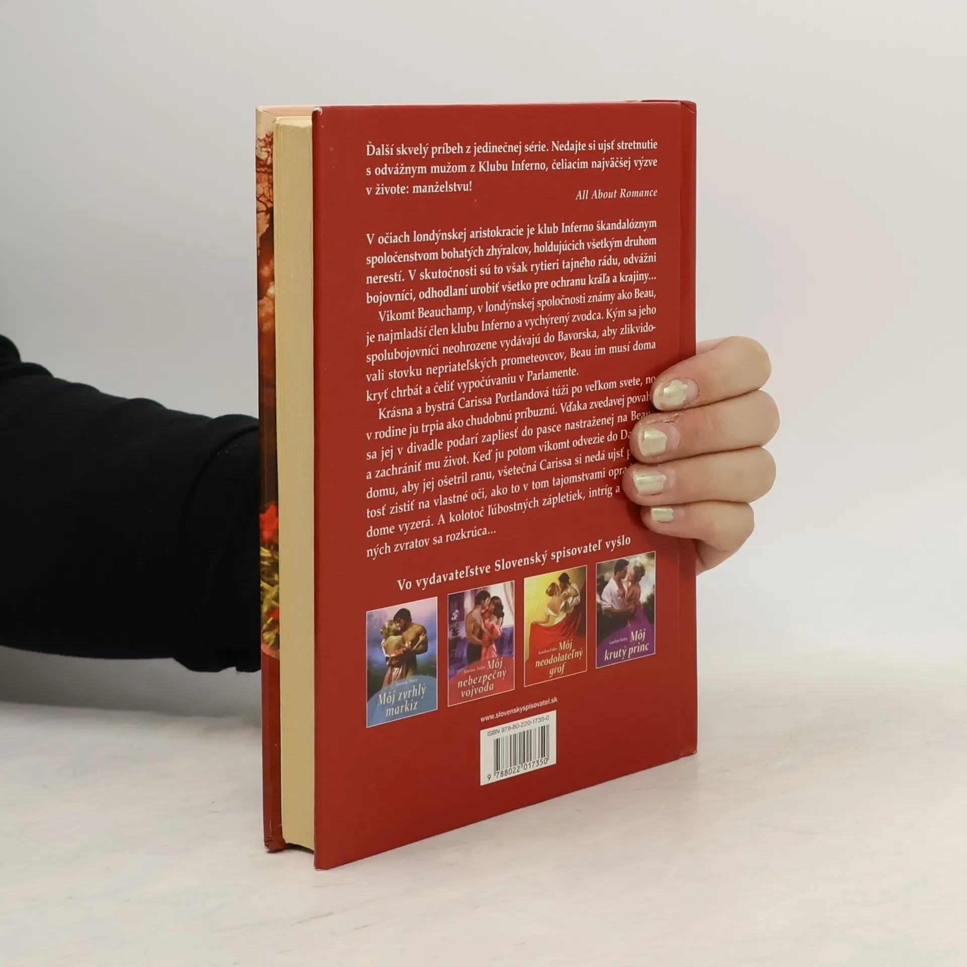 V očiach londýnskej aristokracie je klub Inferno škandalóznym spoločenstvom bohatých zhýralcov, holdujúcich všetkým druhom nerestí. V skutočnosti sú to však rytieri tajného rádu, odvážni bojovníci, odhodlaní urobiť všetko pre ochranu kráľa a krajiny... Vikomt Beauchamp, v londýnskej spoločnosti známy ako Beau, je najmladší člen klubu Inferno a vychýrený zvodca. Kým sa jeho spolubojovníci neohrozene vydávajú do Bavorska, aby zlikvidovali stovku nepriateľských prometeovcov, Beau im musí doma kryť chrbát a čeliť vypočúvaniu v Parlamente. Krásna a bystrá Carissa Portlandová túži po veľkom svete, no v rodine ju trpia ako chudobnú príbuznú. Vďaka zvedavej povahe sa jej v divadle podarí zapliesť do pasce nastraženej na Beaua a zachrániť mu život. Keď ju potom vikomt odvezie do Danteho domu, aby jej ošetril ranu, všetečná Carissa si nedá ujsť príležitosť zistiť na vlastné oči, ako to v tom tajomstvami opradenom dome vyzerá. A kolotoč ľúbostných zápletiek, intríg a nečakaných zvratov sa rozkrúca...