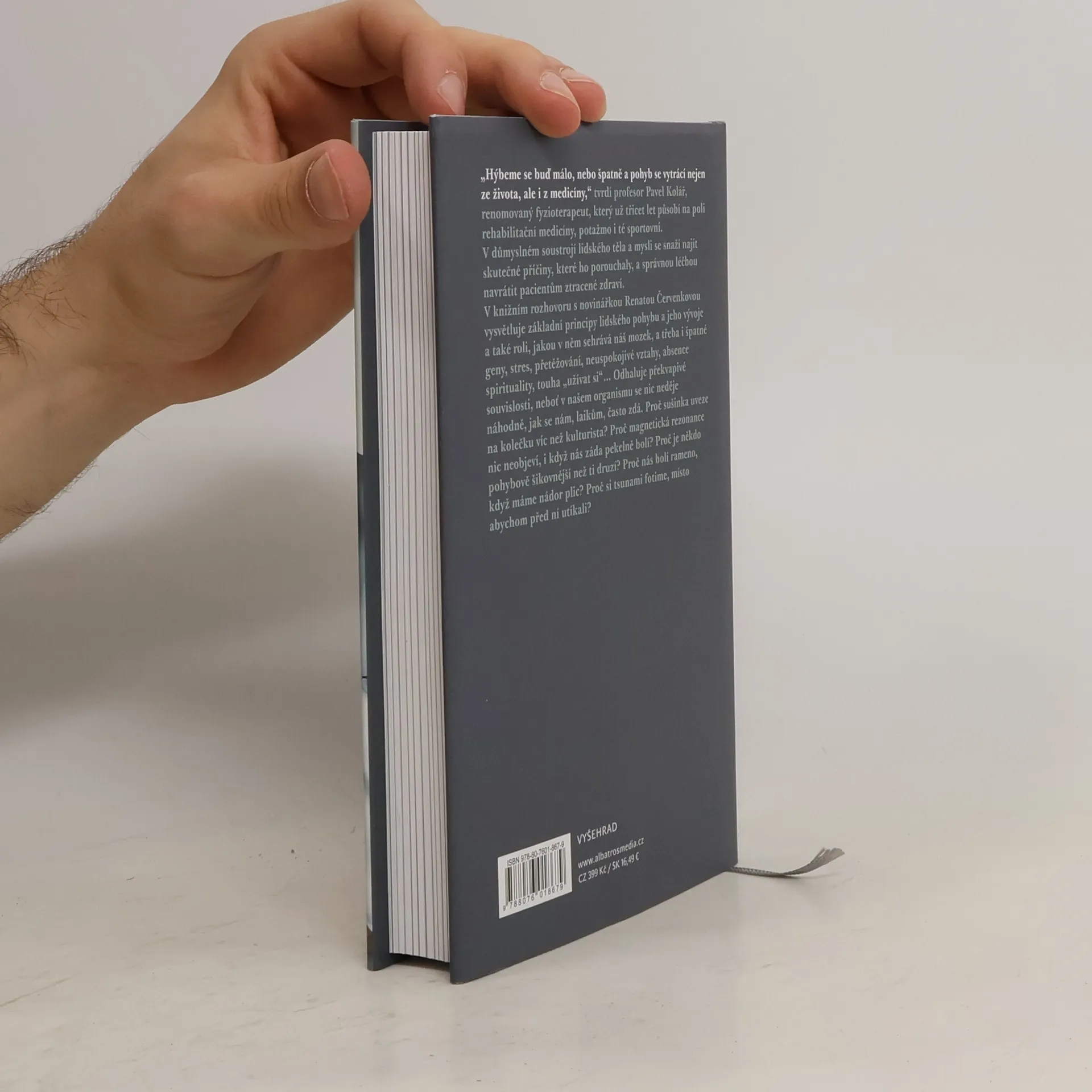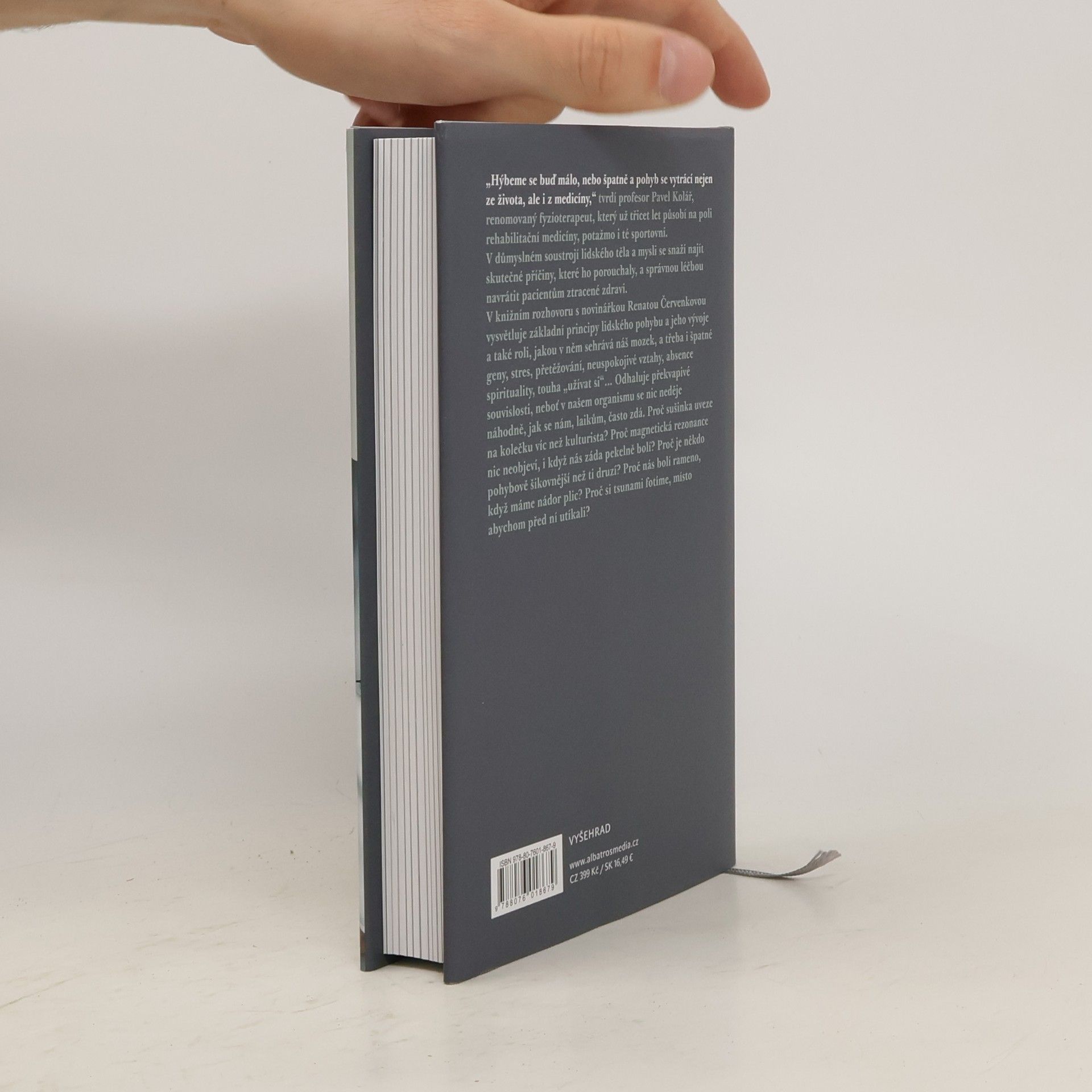 Knižní rozhovor s renomovaným fyzioterapeutem prof. Kolářem. „Hýbeme se buď málo, nebo špatně a pohyb se vytrácí nejen ze života, ale i z medicíny,“ tvrdí profesor Pavel Kolář, renomovaný fyzioterapeut, který už třicet let působí na poli rehabilitační medicíny, potažmo i té sportovní. V důmyslném soustrojí lidského těla a mysli se snaží najít skutečné příčiny, které ho porouchaly, a správnou léčbou navrátit pacientům ztracené zdraví. V rozhovorech s novinářkou Renátou Červenkovou vysvětluje základní principy lidského pohybu a jeho vývoje a také roli, jakou v něm sehrává náš mozek a třeba i špatné geny, stres, přetěžování, neuspokojivé vztahy, absence spirituality, touha „užívat si“... Odhaluje překvapivé souvislosti, neboť v našem organismu se nic neděje náhodně, jak se nám, laikům, často zdá. Proč nás bolí rameno, když máme nádor plic? Proč sušinka uveze na kolečku víc než kulturista? Proč magnetická rezonance nic neobjeví, i když nás záda pekelně bolí? Proč je někdo pohybově šikovnější než ti druzí? Proč si tsunami fotíme, místo abychom před ní utíkali?