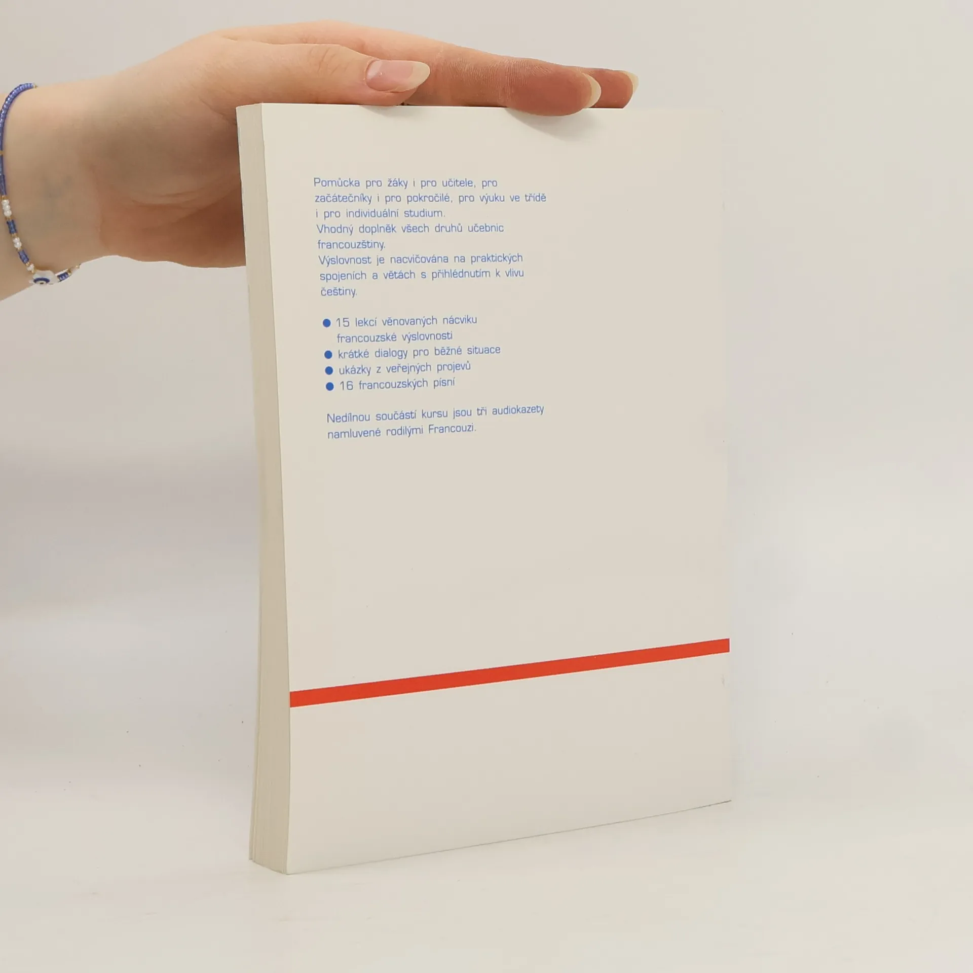 Chcete se naučit správnou francouzskou výslovnost? V tom případě je nejvhodnější pomůckou Praktický kurs francouzské výslovnosti. Obsahuje 15 lekcí věnovaných jednotlivým výslovnostním jevům, dále kapitolu o nejběžnějších dialozích a kapitolu s ukázkami z veřejných projevů. Výslovnost je procvičována na slovních spojeních a větách, které se používají v praktickém životě. Učebnice je zpracována pro použití v kursech různé náročnosti i pro potřeby samouků a jsou k ní vydány tři audiokazety.