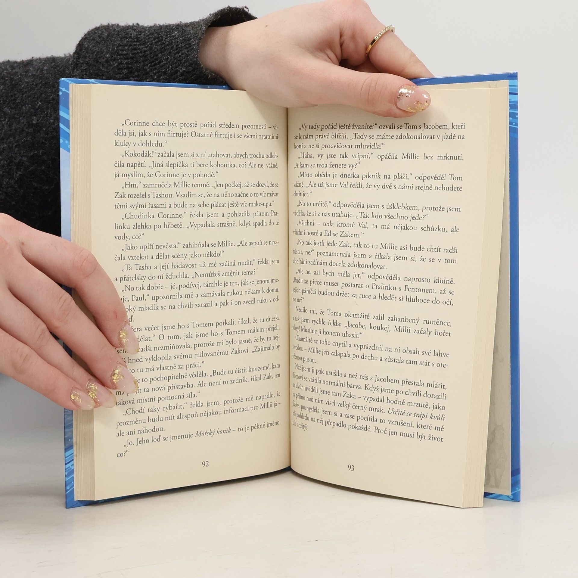Karen je sice smutná, že nebude trávit prázdniny s mamkou, ale když nakonec odjíždí na letní jezdecký tábor, kam si může vzít svého milovaného poníka Pralinku je ohromně ráda. Prožije nejen krásné chvíle v moři, nová přátelství, lásku, ale i nenávist a panuje zde též jakési napětí. A přijde tomu všemu na kloub? Prázdninový příběh dívky Karen a jejího poníka. Pro starší dívky, milovnice koní
