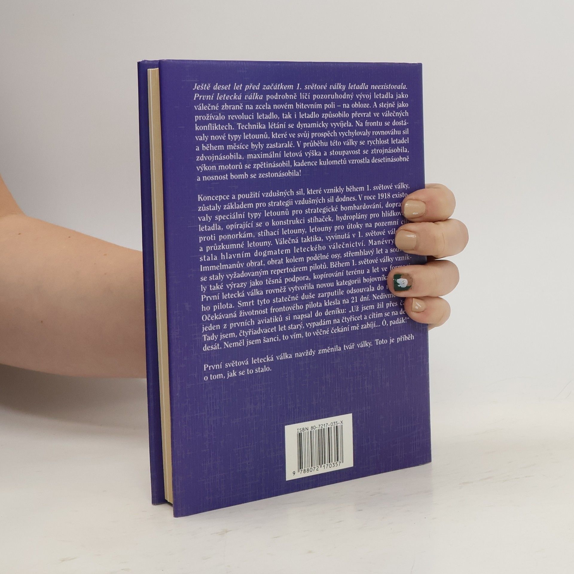 Kniha popisuje vývoj letadla jako válečné zbraně a především líčí jeho význam v bojích za 1. sv. války. Právě v jejím průběhu vznikly vzdušné síly, avšak vývoj nových typů letadel byl velmi rychlý. Dynamicky šla dopředu také technika létání a základem leteckého válečnictví se stala taktika. Koncepce a využití vzdušných sil jsou zdrojem pro jejich strategii dodnes - 1.světová válka byla předělem ve vývoji vzdušných sil... Autoři líčí průběh leteckých bitev chronologicky (každému roku války věnovali jednu kapitolu) a velmi podrobně. Připomínají osudy průkopníků letecké techniky, zakladatelů válečné taktiky, významných velitelů a hlavně nejlepších pilotů-tzv.es, včetně žen-pilotek, a to ze všech válčících států. Kniha též obsahuje dobové válečné fotografie, mapy a grafy. Téma 1.letecké války autoři zpracovali zajímavě, poutavě, místy až formou vyprávění a se snahou o co největší objektivitu.