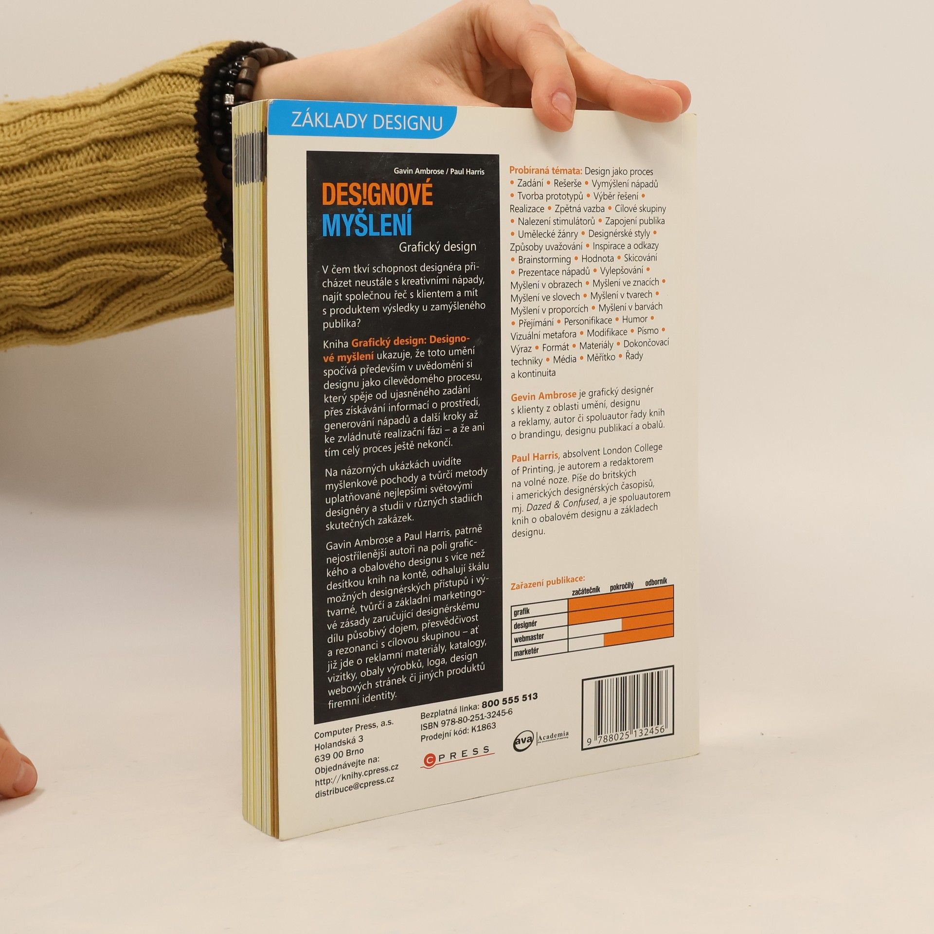V čem tkví schopnost designéra přicházet neustále s kreativními nápady, najít společnou řeč s klientem a mít s produktem výsledky u zamýšleného publika? Kniha Grafický design: Designové myšlení ukazuje, že toto umění spočívá především v uvědomění si designu jako cílevědomého procesu, který spěje od ujasněného zadání přes získávání informací o prostředí, generování nápadů a další kroky až ke zvládnuté realizační fázi – a že ani tím celý proces ještě nekončí. Na názorných ukázkách uvidíte myšlenkové pochody a tvůrčí metody uplatňované nejlepšími světovými designéry a studii v různých stadiích skutečných zakázek. Gavin Ambrose a Paul Harris, patrně nejostřílenější autoři na poli grafického a obalového designu s více než desítkou knih na kontě, odhalují škálu možných designérských přístupů i výtvarné, tvůrčí a základní marketingové zásady zaručující designérskému dílu působivý dojem, přesvědčivost a rezonanci s cílovou skupinou – ať již jde o reklamní materiály, katalogy, vizitky, obaly výrobků, loga, design webových stránek či jiných produktů firemní identity.
