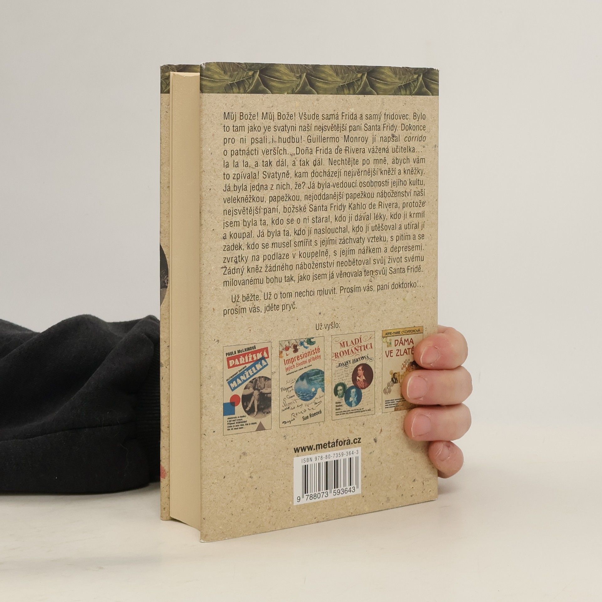 Strhující životní drama slavné mexické malířky… Nové vydání oblíbeného biografického románu. Frida Kahlo, mexická malířka a významná kulturní osobnost, po otci německého původu, v dětství zmrzačená obrnou a ve věku osmnácti let téměř smrtelně zraněná, žila život plný extrémů. Vzala si za muže další klíčovou osobnost mexického kulturního života, malíře Diega Riveru, s nímž prožila vášnivý vztah naplněný láskou, ale také žárlivostí a nevěrou. V tomto románu, jenž je živě vykresleným portrétem podmanivé a jedinečné ženy, se citlivou a emocionální vypravěčkou stává Fridina sestra Cristina, svědkyně a občas i přímá účastnice jejich bouřlivého manželství. Sledujeme tak nejen intenzivní soupeření obou sester o přízeň Diega Rivery, ale i fascinující obrazový kaleidoskop Mexika první poloviny 20. století. V příběhu má své místo také řada jiných slavných osobností, například ruský revolucionář Lev Trockij či oslnivě krásné filmové hvězdy María Félix, Dolores del Río a Paulette Goddard. Bárbara Mujica splétá životy a lásky těchto pozoruhodných a výjimečných lidí do skutečného dramatu, které dovádí k velkolepému konci.