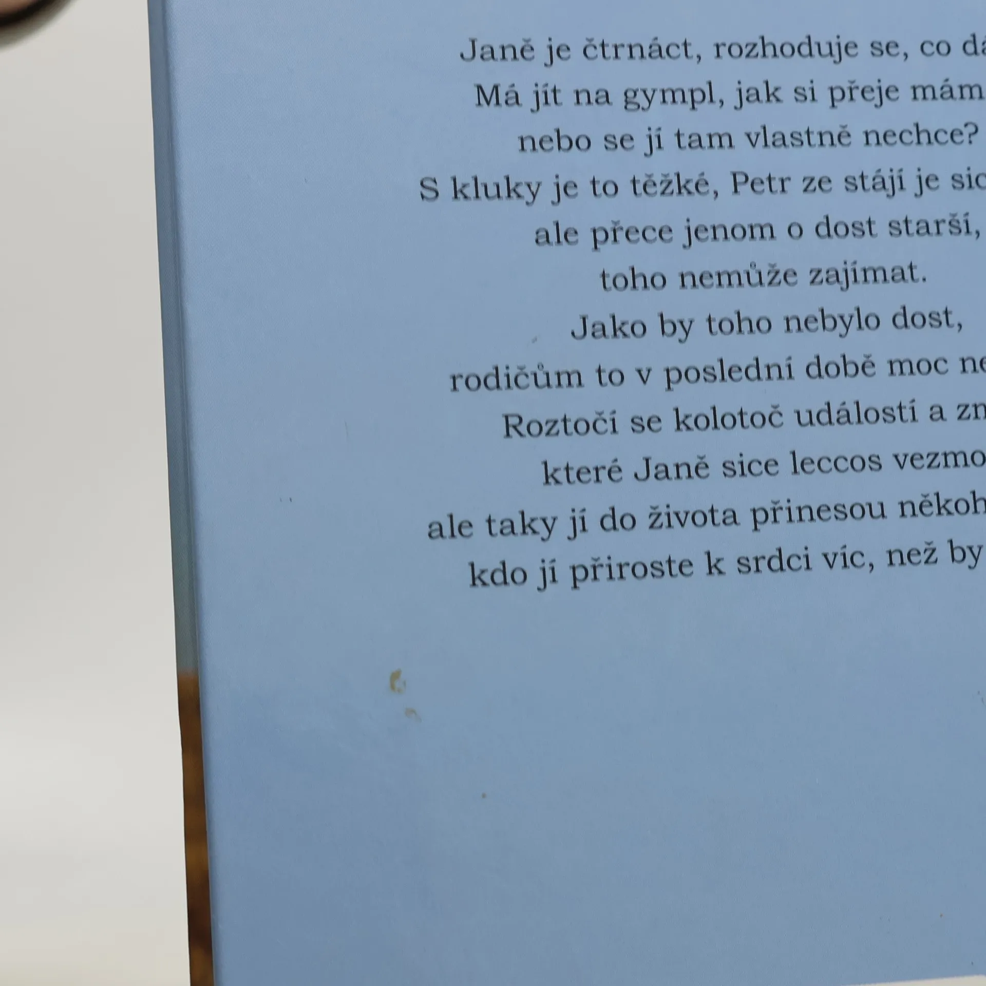 Janě je čtrnáct a rozhoduje se, co dál. Má jít na gympl, jak si přeje máma, nebo se jí tam vlastně nechce? S kluky je to těžké, Petr ze stájí je sice fajn, ale přece jenom o dost starší, toho nemůže zajímat. A jako by to nestačilo, rodičům to v poslední době moc neklape. Roztočí se kolotoč událostí a změn, které Janě sice leccos vezmou, ale taky jí do života přinesou někoho nového, kdo jí přiroste k srdci víc než by čekala. Příběh čtrnáctileté Jany, která pochopí, že i malé věci jsou někdy to nejdůležitější, co můžeme udělat pro druhé.