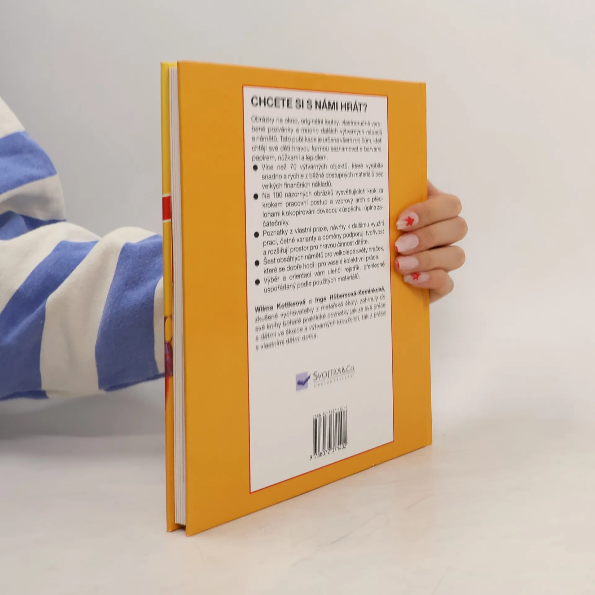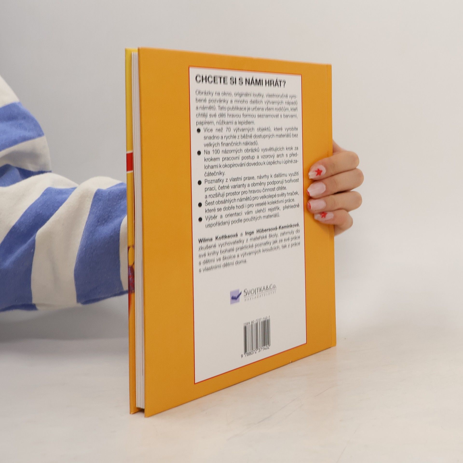 dalších výtvarných nápadů a námětů. Tato publikace'je určena všem rodičům, kteří chtějí své děti hravou formou seznamovat s barvami, papírem, nůžkami a lepidlem. . Více než 70 výtvarných objektů, které vyrobíte snadno a rychle z běžně dostupných materiálů bez velkých finančních nákladů. . Na 100 názorných obrázků vysvětlujících krok za krokem pracovní postup a vzorový arch s předlohami k okopírování dovedou k úspěchu i úplné začátečníky. . Poznatky z vlastní praxe, návrhy k dalšímu využití prací, četné varianty a obměny podporují tvořivost a rozšiřují prostor pro hravou činnost dítěte. . Šest obsáhlých námětů pro velkolepé světy hraček, které se dobře hodí i pro veselé kolektivní práce. . Výběr a orientaci vám ulehčí rejstřík, přehledně uspořádaný podle použitých materiálů.