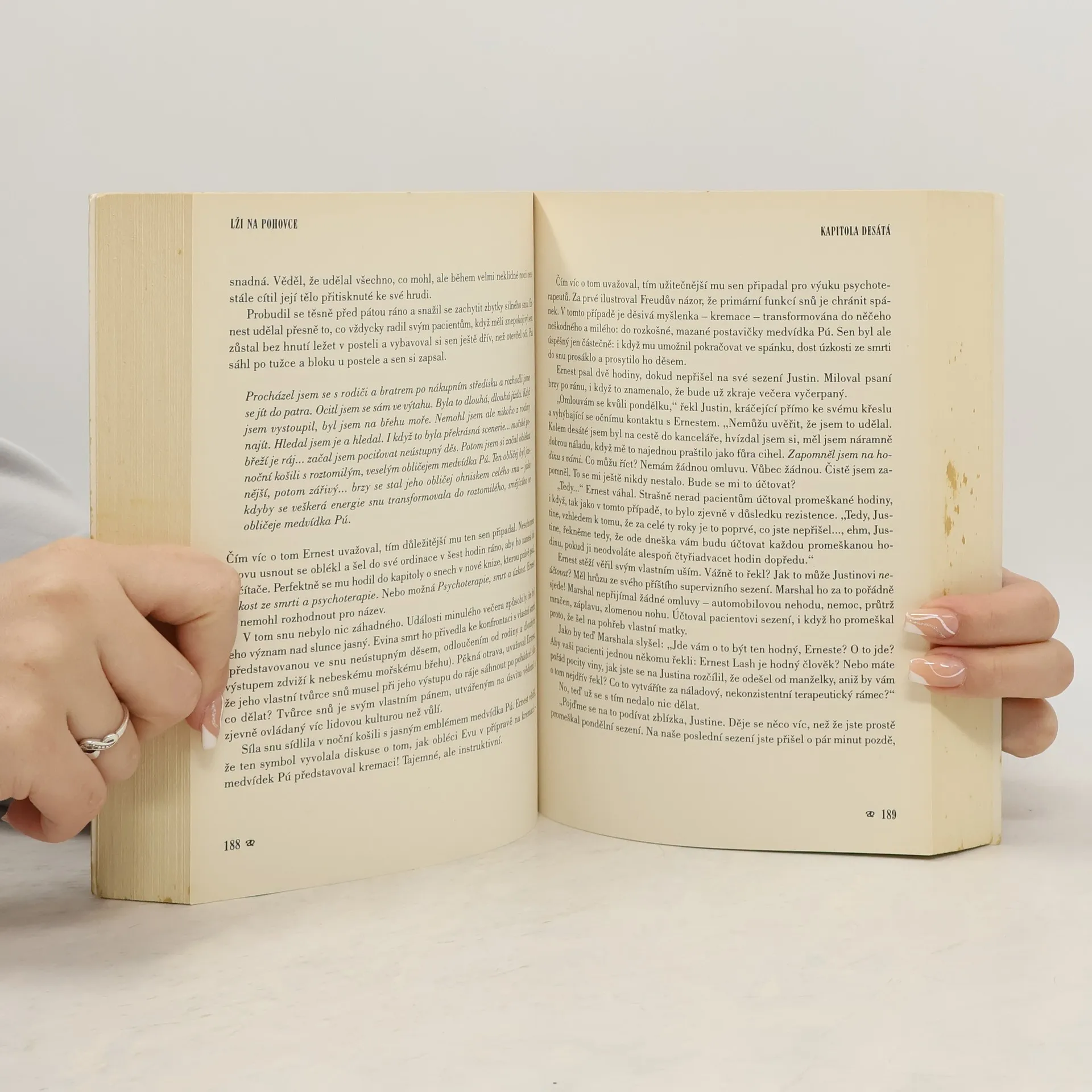 S podtitulem: Román o psychoterapii a psychoterapeutech. Na pozadí příběhu ze současného San Franciska otevírá přední americký psychoterapeut řadu zásadních problémů pomáhajících profesí – vztahy mezi profesionály a jejich klienty i mezi terapeuty navzájem. Autor dává čtenářům nahlédnout do průběhu terapie a supervize, do práce se sny, ale i do vztahů v psychoterapeutické komunitě. Tato problematika je zakomponována do napínavého děje s detektivní zápletkou. Kniha je proto zajímavá pro zájemce o témata z oblasti psychoterapie a psychologie i pro odborníky pomáhajících profesí.