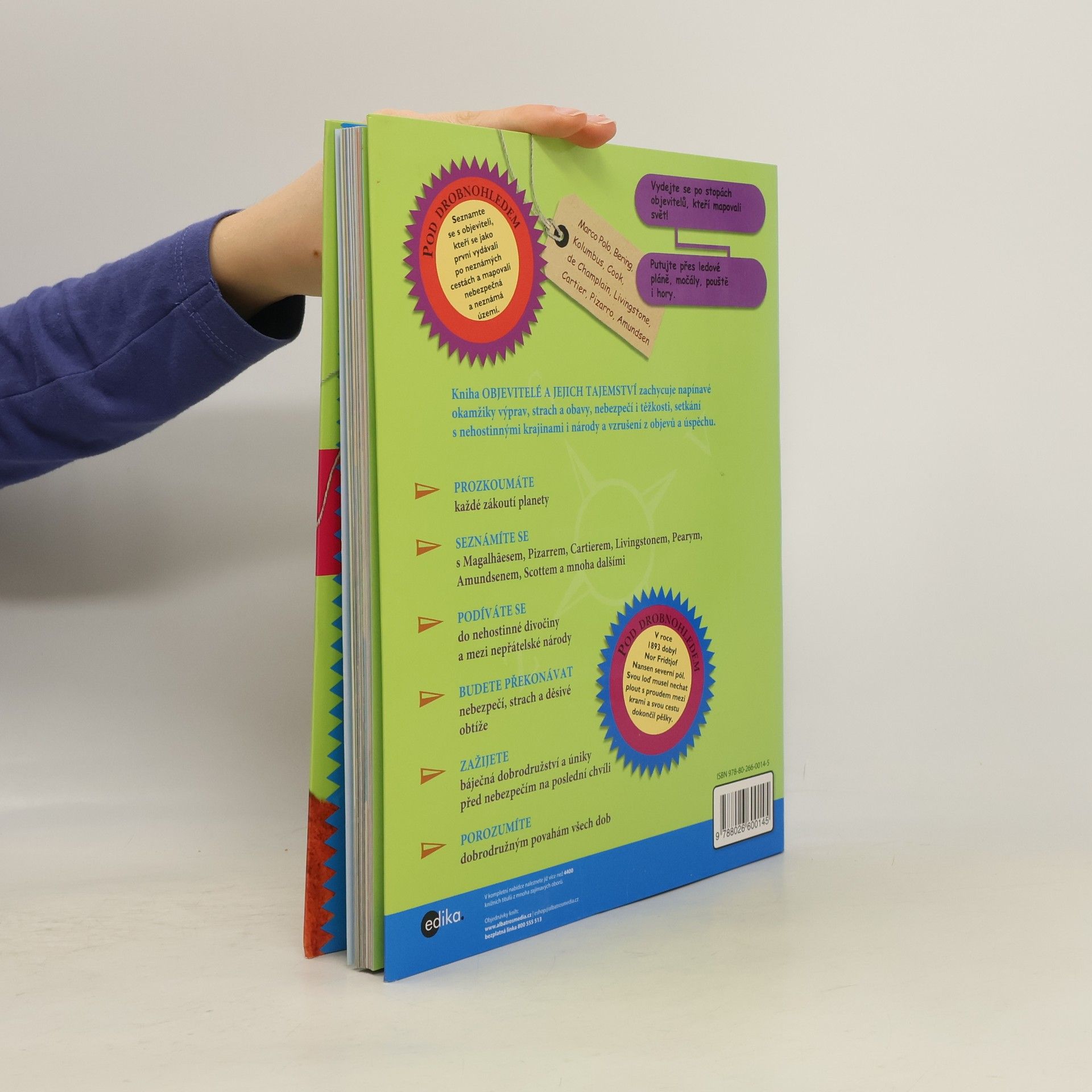 Vydejme se společně do všech koutů naší planety spolu se slavnými i méně slavnými objeviteli: s Mary Kingsleyovou do západní Afriky, s Lewisem a Clarkem přes Spojené státy, s Franklinem a Pearym na severní pól a s Amundsenem a Scottem na pól jižní a na spoustu dalších míst. Kniha je uspořádána podle oblastí a v jejich rámci pak chronologicky. Zachycuje atmosféru jednotlivých období a pozadí dobrodružných cest velkých objevitelů minulosti. Kapitoly: Proč objevovat ?, První objevitelé, Starověcí objevitelé. Afrika-Souhrnně o Africe, Mungo Park, René Caillié, Burton a Speke, Livingstone a Stanley, Mary Kingsleyová. Asie-Souhrnně o Asii, Marco Polo, Abú Abdallah Ibn Battúta, Čeng Che, Vasco Da Gama, Nikolaj Michajlovič Prževalskij, Isabella Birdová. Oceánie-Souhrnně o Oceánii, James Cook, Matthew Flinders, Ludwig Leichhardt, Burke a Wills. Amerika-Sohrnně o severní Americe, Leif Eriksson, Kryštof Kolumbus, Jaques Carter, Samuel De Chaplain, Daniel Boone, Lewis a Clark. Souhrnně o střední a jižní Americe-Hernán Cortés, Francisco Pizarro, Francisco De Orellana, Alexander von Humboldt. Polární oblasti-Souhrnně o polárních oblastech-Vitus Bering, John Franklin, Peary a Henson, Amundsen a Scott, Douglas Mawson, Ernest Shackleton. Kolem světa-Přehled, Fernao De Magalhaes. Hranice budoucnosti-Oceán, vesmír. Další objevitelé.