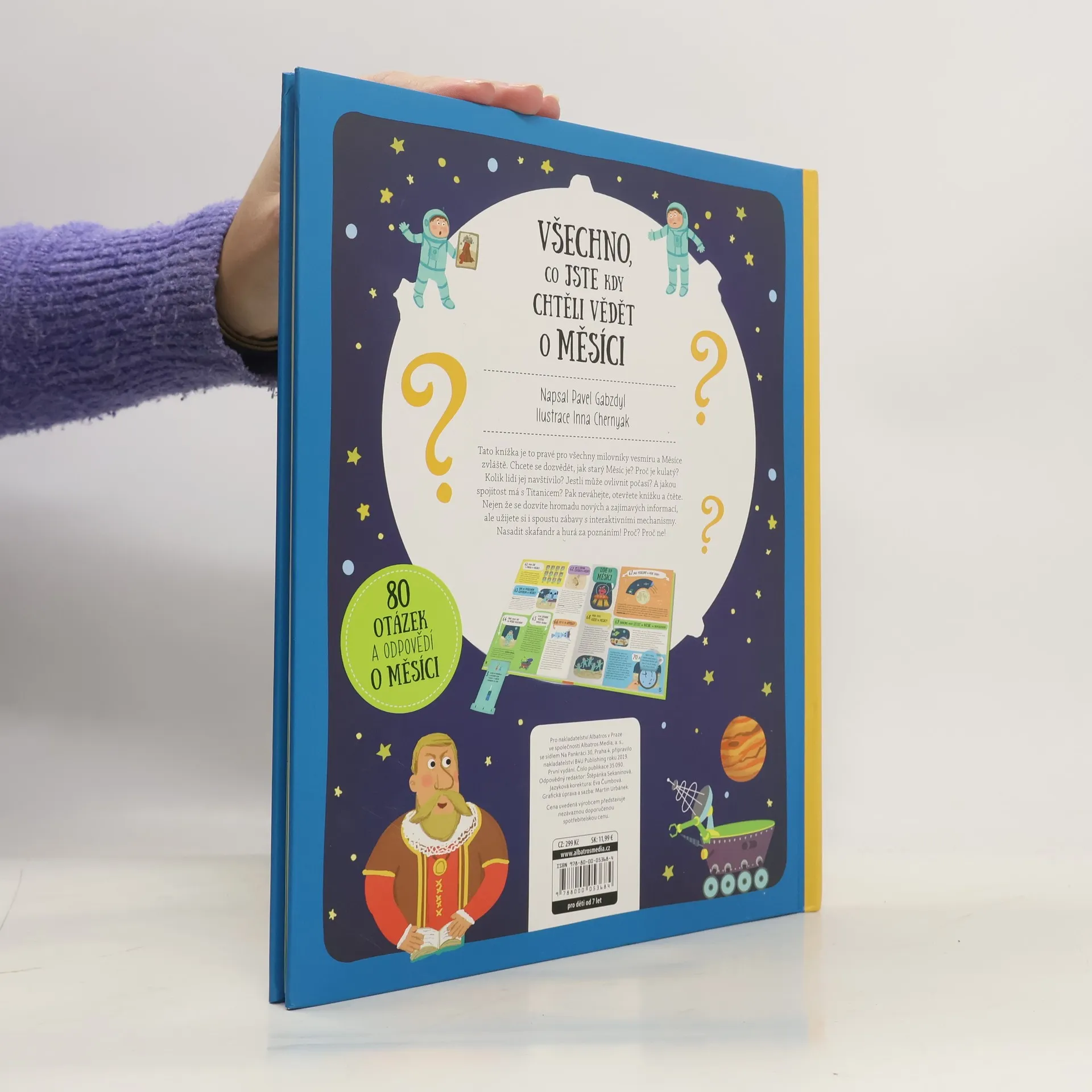 "80 otázek a odpovědí pro malé i velké milovníky vesmíru" Jak starý je Měsíc? Proč je kulatý? Kolik lidí už ho navštívilo? A jakou spojitost má se slavným Titanicem? Objevte odpovědi na všechny všetečné otázky o vesmíru a především o Měsíci. Dozvíte se nejen hromadu nových a zajímavých informací, ale užijete si i spoustu zábavy s interaktivními mechanismy a hravými ilustracemi. Tak nasadit skafandr a hurá za poznáním!
