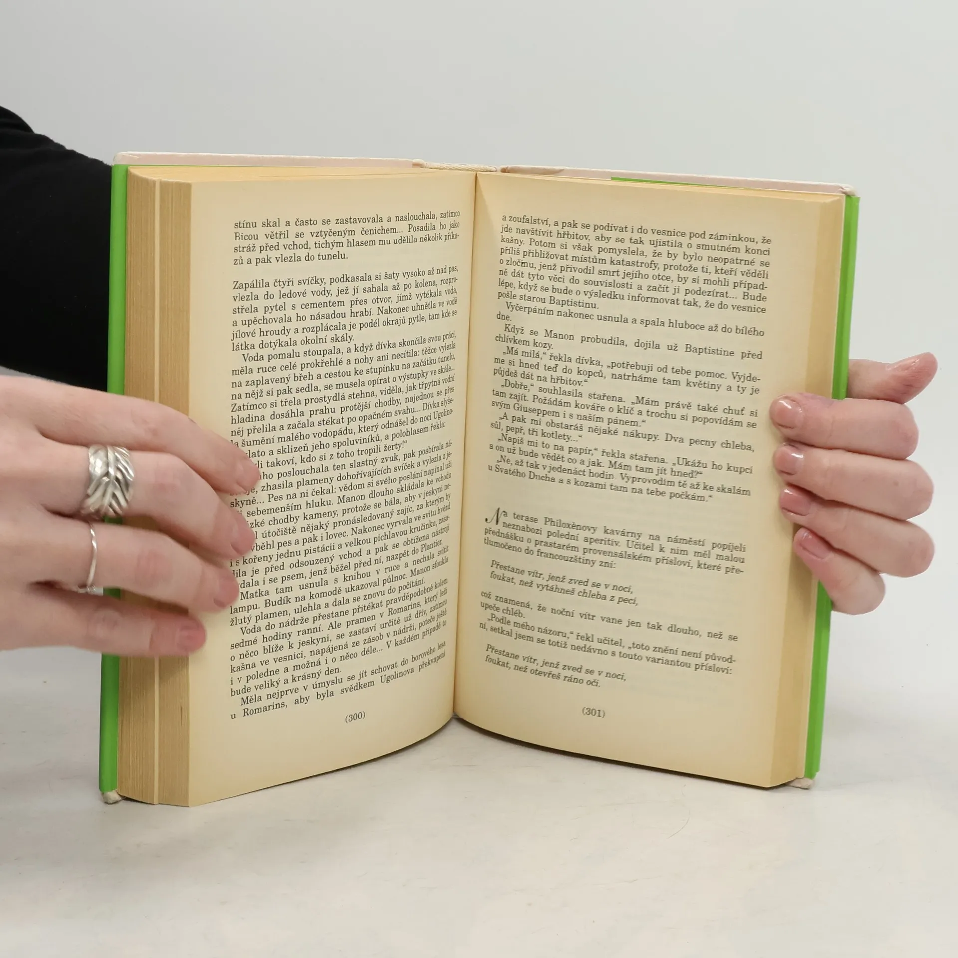 Román z francouzského venkova. Příběh hrbatého berního úředníka, operní zpěvačky a jejich dcerky Manon, kteří se ujmou pochybného dědictví - osamělé usedlosti v horách - dojímá úpornou snahou nezkušených měšťáků zvelebit půdu svých předků a živit se na ni prací vlastních rukou. Marné úsilí pana Jeana nezápasí pouze s nepřízní přírody ale především s lidskou hloupostí a zlobou. Toto drama založené na zločinu a trestu má sílu antické tragedie, jejímiž protagonisty jsou vedle lidí i slepé síly Osudu. Leč nechybí v něm ani katarze, k níž dá podnět nečekané odhalení na konci knihy. Její závěr je ve znamení smíru a naděje.