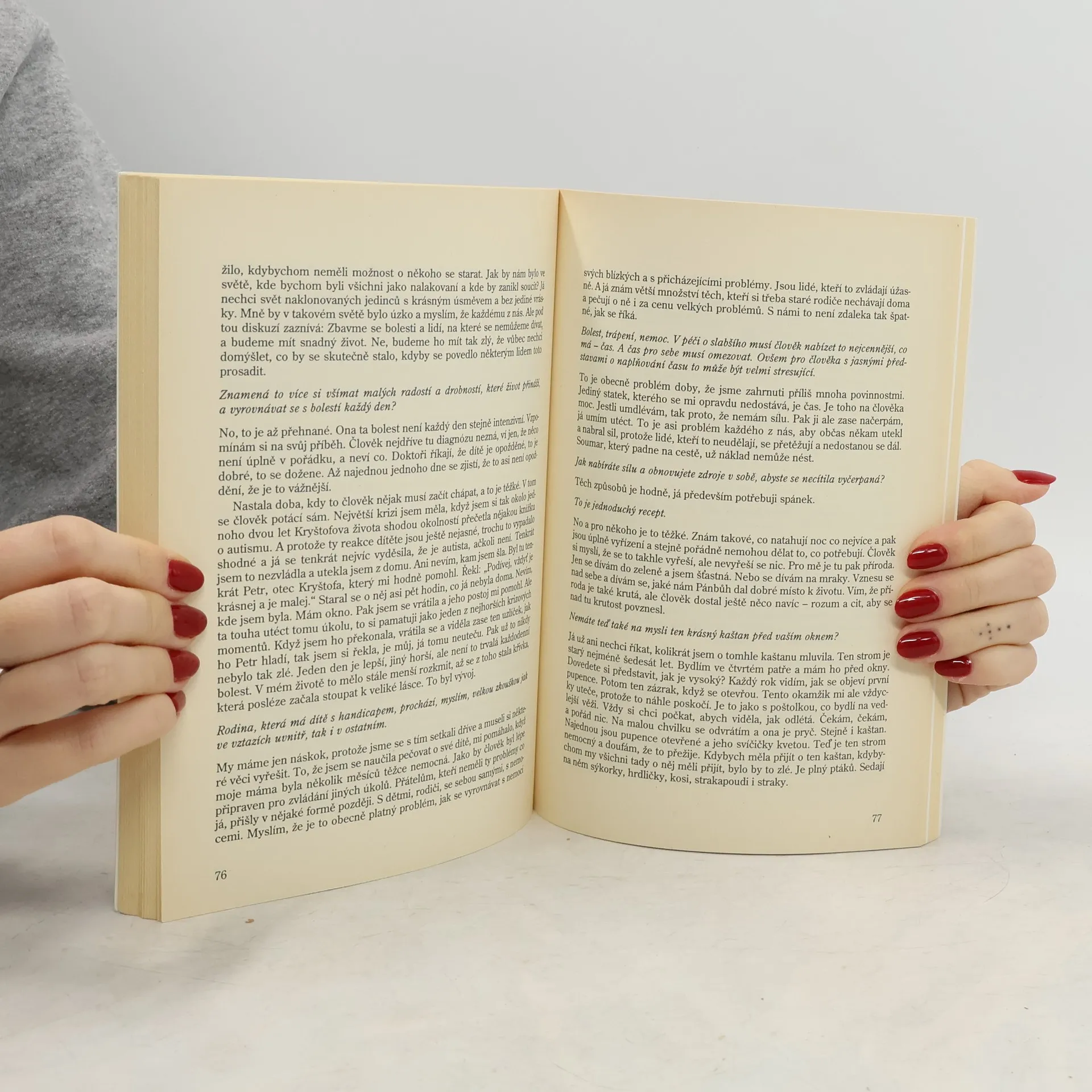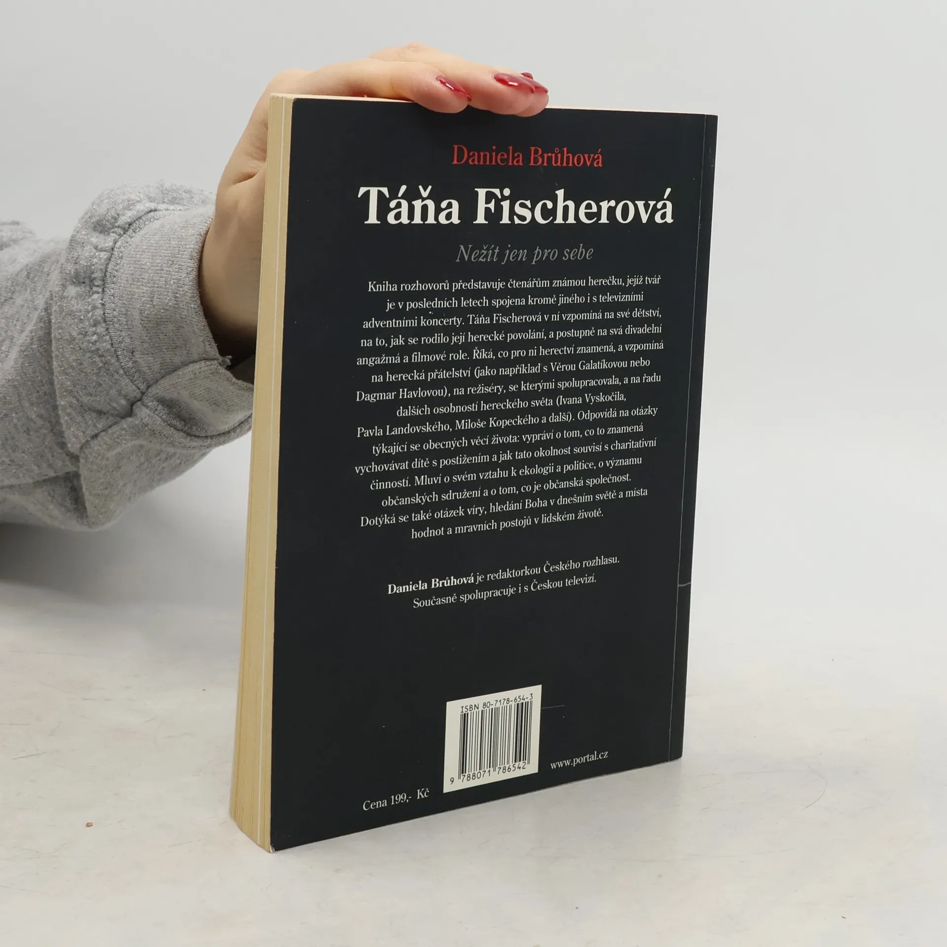 Svazek edice Rozhovory z nakladatelství Portál představuje herečku a moderátorku Táňu Fischerovou. Redaktorka Českého rozhlasu Daniela Brůhová nesleduje jen její lidský, ale i umělecký a občanský růst. Dialog, který spolu vedou na téma dětství, herectví, mateřství a občanství, je sice rytmizován otázkami, ale ve svém vyznění působí jako celistvý obraz této mimořádné ženy, jejímž duchovním krédem se v soukromém i společenském bytí stalo: Nežít jen pro sebe.